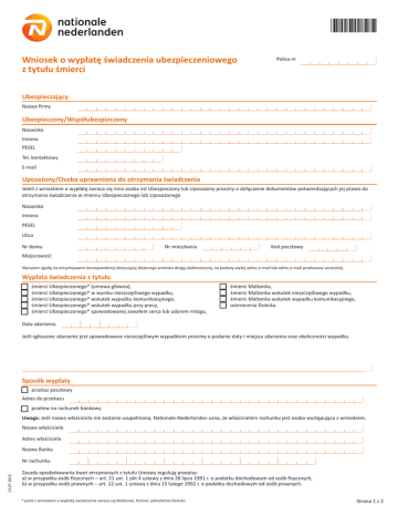 *Q060* Wniosek o wypłatę świadczenia ubezpieczeniowego z tytułu śmierci Polisa nr Ubezpieczający Nazwa firmy Ubezpieczony/Współubezpieczony Nazwisko Imiona PESEL Tel. kontaktowy E-mail Uposażony/Osoba uprawniona do otrzymania świadczenia Jeżeli z wnioskiem o wypłatę zwraca się inna osoba niż Ubezpieczony lub Uposażony prosimy o dołączenie dokumentów potwierdzających jej prawo do otrzymania świadczenia w imieniu Ubezpieczonego lub Uposażonego Nazwisko Imiona PESEL Ulica Nr domu Nr mieszkania Kod pocztowy Miejscowość Wyrażam zgodę na otrzymywanie korespondencji dotyczącej złożonego wniosku drogą elektroniczną, na podany wyżej adres e-mail lub adres e-mail przekazany wcześniej Wypłata świadczenia z tytułu n śmierci Ubezpieczonego* (umowa główna), n śmierci Ubezpieczonego* w wyniku nieszczęśliwego wypadku, n śmierci Ubezpieczonego* wskutek wypadku komunikacyjnego, n śmierci Ubezpieczonego* wskutek wypadku przy pracy, n śmierci Ubezpieczonego* spowodowanej zawałem serca lub udarem mózgu, Data zdarzenia n śmierci Małżonka, n śmierci Małżonka wskutek nieszczęśliwego wypadku, n śmierci Małżonka wskutek wypadku komunikacyjnego, n osierocenia Dziecka. Jeśli zgłoszone zdarzenie jest spowodowane nieszczęśliwym wypadkiem prosimy o podanie daty i miejsca zdarzenia oraz okoliczności wypadku. Sposób wypłaty n przekaz pocztowy Adres do przekazu n przelew na rachunek bankowy Uwaga: Jeśli nazwa właściciela nie zostanie uzupełniona, Nationale‑Nederlanden uzna, że właścicielem rachunku jest osoba występująca z wnioskiem. Nazwa właściciela Adres właściciela Nazwa Banku 13.07.2015 Nr rachunku Zasady opodatkowania kwot otrzymanych z tytułu Umowy regulują przepisy: a) w przypadku osób fizycznych – art. 21 ust. 1 pkt 4 ustawy z dnia 26 lipca 1991 r. o podatku dochodowym od osób fizycznych, b) w przypadku osób prawnych – art. 12 ust. 1 ustawy z dnia 15 lutego 1992 r. o podatku dochodowym od osób prawnych. * jeżeli z wnioskiem o wypłatę świadczenia zwraca się Małżonek, Partner, pełnoletnie Dziecko Strona 1 z 2 Wymagane dokumenty1 urzędowy dokument potwierdzający tożsamość osoby występującej z wnioskiem odpis aktu zgonu Ubezpieczonego odpis aktu zgonu Małżonka odpis aktu małżeństwa odpis aktu urodzenia się Dziecka zaświadczenie stwierdzające przyczynę śmierci, wystawione przez lekarza lub odnośne władze dokumentacja medyczna dotycząca przebiegu leczenia potwierdzająca zajście zdarzenia ubezpieczeniowego (tj. karty informacyjne leczenia szpitalnego, posiadane zaświadczenia lekarskie, dokumentacja leczenia ambulatoryjnego i wyniki badań) n wynik sekcji zwłok, jeśli była przeprowadzona n dokumenty uprawniające do odbioru świadczenia w imieniu małoletniego Dziecka n dokumenty potwierdzające zajście i okoliczności nieszczęśliwego wypadku (np. opis wypadku, protokół BHP, raport policyjny), w przypadku zdarzenia spowodowanego nieszczęśliwym wypadkiem n n n n n n n Ubezpieczający Podpis Pieczęć Ubezpieczającego Data Osoba uprawniona do odbioru świadczenia Podpis Data 13.07.2015 * Ubezpieczony oznacza również Współubezpieczonego 1 dołączyć oryginał lub kopię potwierdzoną za zgodność z oryginałem przez notariusza, organ wydający dany dokument lub osobę reprezentującą Ubezpieczyciela Nationale-Nederlanden Towarzystwo Ubezpieczeń na Życie S.A.; ul. Topiel 12, 00-342 Warszawa; tel. +48 (22) 522 00 00, fax +48 (22) 522 11 11, www.nn.pl Sąd Rejonowy dla m.st. Warszawy; XII Wydział Gospodarczy Krajowego Rejestru Sądowego KRS 25443; NIP: 527-10-02-574, Kapitał zakładowy – 41 000 000 zł, wpłacony w całości Strona 2 z 2