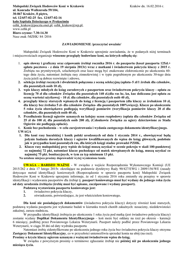 Małopolski Związek Hodowców Koni w Krakowie ul. Konrada Wallenroda 59/104, 30-867 Kraków, 8 piętro, tel. 12/657-02-25 fax. 12/657-02-16 koło Szpitala Dziecięcego w Prokocimiu [email protected], [email protected], www.ozhk.pl Biuro czynne: 7.30-14.30 Nasz znak /MZHK/ 84 /2016 Kraków dn. 16.02.2016 r. ZAWIADOMIENIE /przeczytać uważnie/ Małopolski Związek Hodowców Koni w Krakowie uprzejmie zawiadamia, że w podanych niżej terminach i miejscowościach organizuje wiosenne przeglądy hodowlane koni, na których odbędą się: 1. opis słowny i graficzny oraz czipowanie źrebiąt rocznika 2016 r. do paszportu (koszt paszportu 125zł.+ opłata pocztowa - z dnia 19 sierpnia 2013r) wraz z matkami i świadectwem pokrycia klaczy z 2015 r. Źrebięta ras prymitywnych, szlachetnych oraz kuce mogą być znakowane elektronicznie po ukończeniu 60tego dnia życia, natomiast źrebięta rasy zimnokrwistej i w typie pogrubionym po ukończeniu 30-tego dnia życia jeżeli są dobrze rozwinięte i zdrowe, 2. selekcja źrebiąt rocznych i dwuletnich połączona z oceną selekcyjną (opłata–5 zł/1 źrebak dla członków, dla pozostałych osób 10 zł), 3. wpis klaczy młodych do ksiąg zarodowych z paszportem oraz świadectwem pokrycia klaczy - opłata za licencję 70 zł dla członków Związku dla pozostałych 140 zł.(dla ras hc, kn, kuc doliczana jest opłata za ocenę wartości użytkowej – 10 zł. dla członków, dla pozostałych osób 40 zł), 4. przeglądy klaczy starszych wpisanych do ksiąg z licencją i paszportem (dla klaczy ze źrebakiem 10 zł, dla klaczy bez źrebaka 5 zł- dla członków Związku- dla pozostałych 100%więcej). Klacze po ukończeniu 5 roku życia obowiązkowo podlegają weryfikacji pomiarów (weryfikacja pomiarów klaczy 20 zł dla członków, dla pozostałych osób 40 zł), 5. Przedłużenie licencji ogierów uznanych na kolejny sezon rozpłodowy (opłata dla członków Związku od 25 zł do 100 zł, dla pozostałych osób 200 zł), (Członkowie Związku za ogiery dzierżawione ze Stada Ogierów nie podlegają opłacie). 6. Konie bez pochodzenia – w celu zarejestrowania i wydania zastępczego dokumentu identyfikacyjnego. UWAGA 1. Dla koni rasy huculskiej i konik polski urodzonych od dnia 1 stycznia 2014 r., obowiązywać będą jedynie badania dorosłych klaczy i ogierów kwalifikowanych do wpisu do ksiąg głównych, podobnie jak w przypadku koni pozostałych ras, dla których księgi stadne prowadzi PZHK. 2. Klacze rasy małopolskiej przy wpisie do księgi muszą uzyskać w ocenie pokroju w skali 100-punktowej co najmniej 72 pkt, natomiast klacze pochodzące od matek niewpisanych do ksiąg, muszą uzyskać co najmniej 75 pkt. bonitacyjnych, w tym za typ minimum 13 pkt. Na ustalone miejsca prosimy doprowadzić wyżej wymienione konie. UWAGA - BARDZO WAŻNE - W związku z wejście Rozporządzenia Wykonawczego Komisji (UE 2015/262 z dnia 17 lutego 2015r. określające na podstawie dyrektywy Rady 90/427/EWG i 2009/156/WE (zasady dotyczące metod identyfikacji koniowatych (Rozporządzenie w sprawie paszportu koni) Małopolski Związek Hodowców Koni w Krakowie uprzejmie informuje, że od 1 stycznia 2016 roku zmieniły się przepisy w sprawie identyfikacji i wydawania paszportów dla źrebiąt tj. paszport koniowatego musi być wydany do jednego roku życia od daty urodzenia źrebięcia (źrebię musi być opisane, zaczipowane i wydany paszport). Podstawą wystawienia paszportu koniowatego jest: 1. świadectwo pokrycia klaczy, 2. oświadczenie, potwierdzające, że jest właścicielem koniowatego. Dla koni nie posiadających dokumentów (świadectwa pokrycia klaczy) dotyczy również koni starszych, podstawą wydania paszportu jest wykonanie badań w kierunku trzech chorób zakaźnych: nosacizny, niedokrwistości zakaźnej, zaraza stadnicza. W przypadku identyfikacji źrebięcia po ukończeniu 1 roku życia pod matką (jest świadectwo pokrycia klaczy) zostanie wydany Duplikat Dokumentu Identyfikacyjnego – koń może być oddany na rzeż po okresie - karencji 6 miesięcy, podbitej przez Powiatowego Lekarza Weterynarii. Paszport należy podbić przez Powiatowego Lekarza Weterynarii, w ciągu 30 dni od daty wydruku paszportu Natomiast źrebię zidentyfikowane po ukończeniu jednego roku życia bez świadectwa pokrycia klaczy otrzyma Zastępczy Dokument Identyfikacyjny, co w przyszłości uniemożliwia sprzedaż konia na ubój (na rzeż). Prosimy o krycie klaczy ogierem uznanym z ważnymi świadectwem wpisu do ksiąg. W związku z powyższym prosimy o terminowe zgłaszanie źrebiąt nie później niż po ukończeniu jednego miesiąca życia. UWAGA: Czynności elektronicznego znakowania powinny być wykonane w obecności właściciela lub osób pisemnie upoważnionych. Zaczipowanie konia jest możliwe tylko przy chwilowym unieruchomieniu (przez dwie osoby) i poskromieniu zwierzęcia, za które odpowiada właściciel. Przy dokonywaniu identyfikacji koniowatego właściciel jest obowiązany udzielić osobie dokonującej tej identyfikacji, pomocy niezbędnej do wykonania tej czynności. Jeżeli właściciel nie unieruchomi źrebięcia, pracownik może odstąpić od identyfikacji koni – pobierając bezzwrotną opłatę w kwocie 48,50 zł. Koń, a w szczególności jego szyja powinna być oczyszczona z błota, kurzu i innych zanieczyszczeń np. ściółki. U W A G A: wszyscy właściciele koni, proszeni są o posiadanie przy sobie dowodu osobistego oraz oryginalnych dokumentów hodowlanych na konia, (jeśli takie posiada). Właściciele stadnin są proszeni o przygotowanie katalogów koni do przeglądu wg. ogólnie przyjętych zasad, natomiast hodowcy uczestniczący w Programie rolno – środowiskowym wykaz klaczy wg posiadanych wykazów. Uprzejmie prosimy o powiadomienie wszystkich zainteresowanych Hodowców i Rolników o miejscu i terminie przeglądów, gdyż Związek nie przewiduje dodatkowych przeglądów w tych samych miejscowościach. Z uwagi na dużą liczb