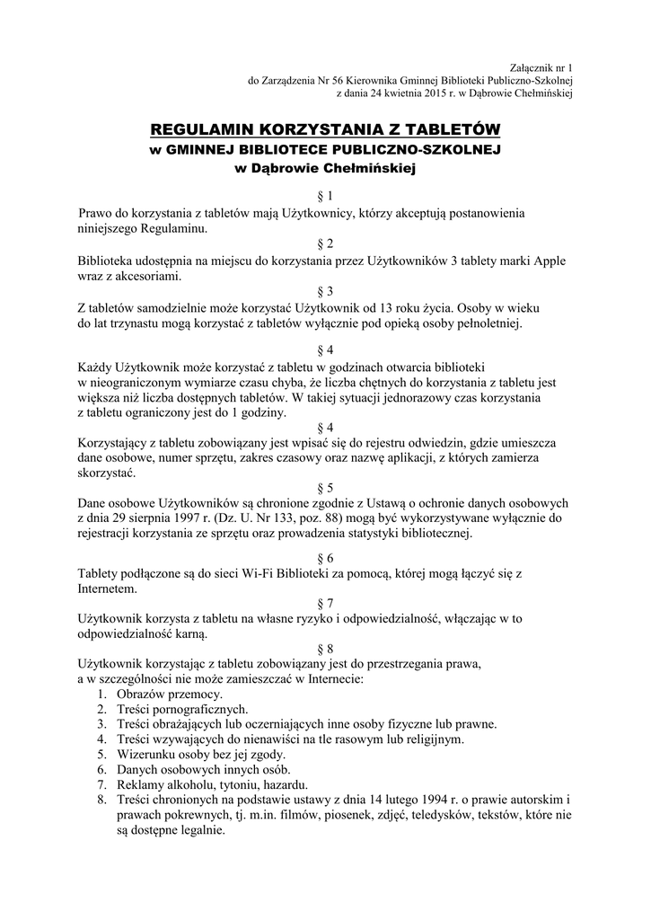 Załącznik nr 1 do Zarządzenia Nr 56 Kierownika Gminnej Biblioteki Publiczno-Szkolnej z dania 24 kwietnia 2015 r. w Dąbrowie Chełmińskiej REGULAMIN KORZYSTANIA Z TABLETÓW w GMINNEJ BIBLIOTECE PUBLICZNO-SZKOLNEJ w Dąbrowie Chełmińskiej §1 Prawo do korzystania z tabletów mają Użytkownicy, którzy akceptują postanowienia niniejszego Regulaminu. §2 Biblioteka udostępnia na miejscu do korzystania przez Użytkowników 3 tablety marki Apple wraz z akcesoriami. §3 Z tabletów samodzielnie może korzystać Użytkownik od 13 roku życia. Osoby w wieku do lat trzynastu mogą korzystać z tabletów wyłącznie pod opieką osoby pełnoletniej. §4 Każdy Użytkownik może korzystać z tabletu w godzinach otwarcia biblioteki w nieograniczonym wymiarze czasu chyba, że liczba chętnych do korzystania z tabletu jest większa niż liczba dostępnych tabletów. W takiej sytuacji jednorazowy czas korzystania z tabletu ograniczony jest do 1 godziny. §4 Korzystający z tabletu zobowiązany jest wpisać się do rejestru odwiedzin, gdzie umieszcza dane osobowe, numer sprzętu, zakres czasowy oraz nazwę aplikacji, z których zamierza skorzystać. §5 Dane osobowe Użytkowników są chronione zgodnie z Ustawą o ochronie danych osobowych z dnia 29 sierpnia 1997 r. (Dz. U. Nr 133, poz. 88) mogą być wykorzystywane wyłącznie do rejestracji korzystania ze sprzętu oraz prowadzenia statystyki bibliotecznej. §6 Tablety podłączone są do sieci Wi-Fi Biblioteki za pomocą, której mogą łączyć się z Internetem. §7 Użytkownik korzysta z tabletu na własne ryzyko i odpowiedzialność, włączając w to odpowiedzialność karną. §8 Użytkownik korzystając z tabletu zobowiązany jest do przestrzegania prawa, a w szczególności nie może zamieszczać w Internecie: 1. Obrazów przemocy. 2. Treści pornograficznych. 3. Treści obrażających lub oczerniających inne osoby fizyczne lub prawne. 4. Treści wzywających do nienawiści na tle rasowym lub religijnym. 5. Wizerunku osoby bez jej zgody. 6. Danych osobowych innych osób. 7. Reklamy alkoholu, tytoniu, hazardu. 8. Treści chronionych na podstawie ustawy z dnia 14 lutego 1994 r. o prawie autorskim i prawach pokrewnych, tj. m.in. filmów, piosenek, zdjęć, teledysków, tekstów, które nie są dostępne legalnie. §9 Użytkownikowi korzystającemu z tabletu zabronione jest także: 1. Wysyłanie spamu (mass mailing). tq 2. Próba obejścia zabezpieczeń technicznych. 3. Próba nielegalnego wejścia do systemów informatycznych osób trzecich. 4. Używanie fałszywego adresu IP. 5. Wysyłanie wirusów komputerów lub innego niebezpiecznego oprogramowania 6. oraz wszelkie inne działania zagrażające bezpieczeństwu Internetu i jego użytkowników. § 10 1. Tablety wyposażone są w aplikacje umożliwiające naukę, tworzenie i dzielenie się treściami, a także zabawę. 2. Użytkownik nie może samodzielnie instalować na tablecie żadnych dodatkowych aplikacji. Może natomiast zaproponować Bibliotece zainstalowanie dodatkowych aplikacji. O instalacji bądź jej odmowie Biblioteka zdecyduje wedle własnego uznania. 3. Zabronione jest używanie własnego Apple ID oraz instalowanie za jego pomocą dodatkowych aplikacji. § 11 1. Na zakończenie korzystania z tabletu Użytkownik zobowiązany jest usunąć z tabletu wszelkie dane osobowe, aplikacje bądź inne treści, które na nim umieścił. 2. Użytkownik zobowiązany jest do wylogowania się ze wszelkich internetowych aplikacji, z których korzystał, np. bankowości internetowej. § 12 1. Użytkownik przyjmuje do wiadomości, że w przypadku nie zastosowania się do postanowień pkt. 7 i 8 powyżej, Master Tablet (Bibliotekarz) może usunąć z tabletu wszelkie dane i treści umieszczone na nim przez Użytkownika. 2. Biblioteka nie ponosi odpowiedzialności za ewentualne roszczenia osób trzecich bądź szkody Użytkownika, w tym naruszenie poufności danych osobowych, wynikłe na skutek korzystania przez Użytkownika z Internetu za pośrednictwem tabletu. § 13 Użytkownik Biblioteki powinien zachowywać się w sposób zgodny z przyjętymi normami współżycia społecznego. § 14 W pomieszczeniach bibliotecznych obowiązuje zakaz: palenia tytoniu oraz spożywania alkoholu, zakaz fotografowania bez zgody bibliotekarza, zakaz wprowadzania zwierząt i rowerów. § 15 Odmawia się dostępu do usług bibliotecznych oraz zabrania się przebywania na terenie biblioteki osobom zakłócającym spokój, znajdującym się w stanie nietrzeźwym, będących pod wpływem środków odurzających. § 16 Biblioteka nie ponosi odpowiedzialności za rzeczy osobiste pozostawione bez nadzoru. § 17 Osoba nie stosująca się do przepisów niniejszego regulaminu może być czasowo, a w szczególnie drastycznych przypadkach na stałe pozbawiona praw korzystania z usług Biblioteki. Decyzję ostateczną w tej sprawie podejmuje Kierownik Biblioteki. § 18 Regulamin udostępnia się do wglądu poprzez wywieszenie w miejscu powszechnie dostępnym w Bibliotece Głównej, w poszczególnych czytelniach, wypożyczalniach i filiach oraz na stronie internetowej Biblioteki. § 19 Rozstrzyganie spraw nie ujętych w niniejszym Regulaminie należy do kompetencji Kierownika Biblioteki. Regulamin obowiązuje od dnia 24.04.2015 r. Zatwierdzam Kierownik Danuta Wędrowska Dąbrowa Chełmińska, 24.04.2015 r.