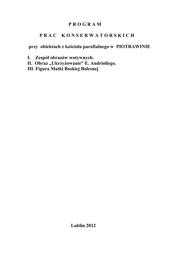 PROGRAM PRAC KONSERWATORSKICH przy obiektach z kościoła parafialnego w PIOTRAWINIE I. Zespół obrazów wotywnych. II. Obraz „Ukrzyżowanie” E. Andriollego. III. Figura Matki Boskiej Bolesnej Lublin 2012 I. Zespół obrazów wotywnych Unikalna kolekcja obrazów z Piotrawina jest najstarszym zachowanym w Polsce zespołem obrazów wotywnych. Pochodzi z lat 1610-1661. Większość z nich została wykonana przez Marcina Baszkowskiego. Historia utworzenia kolekcji w obecnej formie nie jest znana. Z dokumentacji fotograficznej prac prowadzonych w warszawskim oddziale PKZ w latach 62-65 ubiegłego wieku wynika, iż obrazy były już wcześniej restaurowane z zamiarem utworzenia kolekcji. Mniejsze obrazy były uporządkowane w pary, niemal wszystkie zostały naklejone na podobne deski z kowalskiej roboty zawieszkami, były szeroko retuszowane i miały ujednoliconą oprawę – profilowane ramki. Przypuszczalnie prace te wykonano jeszcze w XIX wieku. Konserwacja podjęta przez PKZ objęła wszystkie obrazy w liczbie 55. Deski osłabione przez owady zaimpregnowano winoflexem i zabezpieczono minią. Dwa obrazy zdublowano na płótno .W pozostałych położono pęcherze przy pomocy kleju zwierzęcego .Obrazy oczyszczono z brudu i pociemniałych werniksów, usunięto przemalowania Uzupełniono ubytki gruntu i farby bez rekonstrukcji w miejscach dyskusyjnych. Pozostawiono dotychczasową oprawę. Zespół obrazów był eksponowany w przykościelnym muzeum urządzonym w starej plebanii. Z chwilą jego likwidacji przeniesiono zbiory do sutereny nowej plebanii , gdzie panowały zmienne warunki klimatyczne. Nastąpił przyśpieszony proces niszczenia obrazów. Nierówna praca płótna i drewnianego podłoża powodowała naprężenia , a w konsekwencji łuszczenie się warstwy malarskiej. W latach 2 część kolekcji poddana została konserwacji i restauracji przeprowadzonej przez konserwatora dzieł sztuki M. Stankiewicz. Zastosowano wówczas woskowy dublaż obrazów na nowe płótno i przeniesiono je na krosna. Zabieg okazał się skuteczny. Obrazy oprawiono w nowe, o podobnych profilach ramki. Stan zachowania obrazów, które nie były poddane konserwacji, w liczbie 35 jest zróżnicowany, jednak większość uległa dalszej destrukcji widocznej głównie w postaci deformacji płótna, łuszczenia się warstwy malarskiej wraz z gruntem oraz licznych drobnych ubytków. Powierzchnia obrazów jest zabrudzona i pociemniała. Brak świeżych śladów żerowania drewnojadów. Założenia konserwatorskie. W ramach projektu zakłada się przeprowadzenie konserwacji i restauracji 35 obrazów z kolekcji, która będzie eksponowana w muzeum parafialnym planowanym w starej plebanii. Najbardziej zniszczone obrazy wykonane na płótnie posiadające sfalowaną powierzchnię i osypującą się warstwę malarską po zabezpieczeniu bibułką japońską zostaną zdjęte z desek i wyprostowane. W celu konsolidacji warstw technologicznych i wzmocnienia oryginalnego płótna będą zdublowane na masę woskowo-żywiczną na nowe płótno lniane. Tak przygotowane obrazy proponuje się przenieść na stabilne podłoże ( na przykład wodoodporną sklejkę), a następnie zamontować je na starych deskach wcześniejszej zdezynfekowanych i nasyconych środkiem owadobójczym. Na obrazach malowanych bezpośrednio na deskach daszkowate łuski farby będą podklejone przy pomocy spoiwa akrylowego metodą iniekcji. Konserwacja estetyczna obejmie usunięcie pociemniałych werniksów i retuszy, uzupełnienie brakujących kitów i wymianę wadliwych oraz scalenie kolorystyczne kompozycji w obrębie ubytków bez uzupełniania miejsc wątpliwych do odtworzenia. Punktowanie będzie wykonane farbami olejnymi, po odsączeniu oleju, z werniksem damarowym jako spoiwo. Dla zabezpieczenia warstwy malarskiej zostanie ona pokryta werniksem damarowym. Zakłada się, że dotychczasowe ramki będą zachowane o ile pozwoli na to ich stan techniczny i odnowione (patynowany brąz)) lub odtworzone nowe. W trakcie prac wykonane zostaną badania laboratoryjne warstw technologicznych obrazów. Przebieg prac konserwatorskich będzie udokumentowany w formie opisowej i fotograficznej. W załączonym spisie obrazów w nawiasach podana jest dawna numeracja muzeum przykościelnego w Piotrawinie. 1.(7) Artysta cechowy, Obrazek wotywny pary szlacheckiej z rodziną, 1 poł. XVII w., olej, płótno, deska, 61,4 x 70,5. Klęcząca, zwarta grupa postaci szlachty z para rodzicielską na czele. Oboje ubrani w szaty brązowo-bezowe, ponadto kobieta w brunatno-czarnym płaszczu i takiej czapce, czepcu, chuście podszyjnej i mankietach, mężczyzna w buraczkowym płaszczu z czarnym pobiciem. U góry z prawej półpostać św. Stanisława na wieńcu obłoków. W prawym, dolnym rogu tablica w formie postumentu z inskrypcją. Konserwacja przeprowadzona w latach 1962-65 przez PKZ Oddz. w Warszawie (dokumentacja konserwatorska sygn. 14800). KZS, s.28, poz. 1-15, il. 38; karta PSOZ nr 8047?. Stan zachowania. Obraz mocno zabrudzony. Rozległe retusze pociemniałe, położone w wielu miejscach bezpośrednio na płótnie bez wcześniejszego uzupełnienia gruntu. Płótno podobrazia odspojone od deski w prawym dolnym narożniku. Program prac. 1. Podklejenie odspojonego płótna do deski podobrazia. 2. Oczyszczenie z brudu powierzchni obrazu. 2. Usunięcie werniksu i pociemniałych retuszy odpowiednio dobranymi rozpuszczalnikami.. 3. Usunięcie wadliwych kitów, mechanicznie. 4. Założenie kitów klejowo-kredowych. 5. Położenie werniksu damarowego. 5. Wykonanie retuszu. 6. Położenie werniksu końcowego 7. Odnowienie ramki – oczyszczenie , pomalowanie brązem .i spatynowanie. 2.(8) Artysta cechowy, Obrazek wotywny Andrzeja Tarły kan. Krak. Dziekana opatowskiego z herbem Topór, 1 poł. XVII w., olej, deska; 53 x 47,2. We wnętrzu z kotarą klęczący duchowny A. Tarło, związany ze Szczekarzewicami, przed postacią św. Stanisława, obok którego widoczna wyłaniająca się