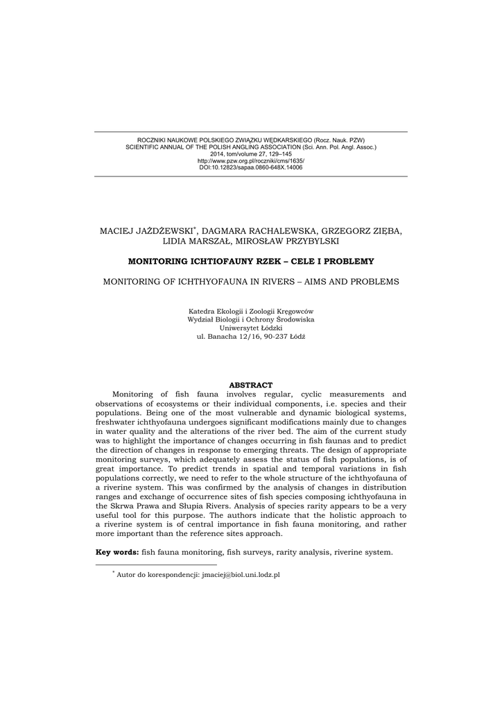 ROCZNIKI NAUKOWE POLSKIEGO ZWIĄZKU WĘDKARSKIEGO (Rocz. Nauk. PZW) SCIENTIFIC ANNUAL OF THE POLISH ANGLING ASSOCIATION (Sci. Ann. Pol. Angl. Assoc.) 2014, tom/volume 27, 129–145 http://www.pzw.org.pl/roczniki/cms/1635/ DOI:10.12823/sapaa.0860-648X.14006 MACIEJ JAŻDŻEWSKI*, DAGMARA RACHALEWSKA, GRZEGORZ ZIĘBA, LIDIA MARSZAŁ, MIROSŁAW PRZYBYLSKI MONITORING ICHTIOFAUNY RZEK – CELE I PROBLEMY MONITORING OF ICHTHYOFAUNA IN RIVERS – AIMS AND PROBLEMS Katedra Ekologii i Zoologii Kręgowców Wydział Biologii i Ochrony Środowiska Uniwersytet Łódzki ul. Banacha 12/16, 90-237 Łódź ABSTRACT Monitoring of fish fauna involves regular, cyclic measurements and observations of ecosystems or their individual components, i.e. species and their populations. Being one of the most vulnerable and dynamic biological systems, freshwater ichthyofauna undergoes significant modifications mainly due to changes in water quality and the alterations of the river bed. The aim of the current study was to highlight the importance of changes occurring in fish faunas and to predict the direction of changes in response to emerging threats. The design of appropriate monitoring surveys, which adequately assess the status of fish populations, is of great importance. To predict trends in spatial and temporal variations in fish populations correctly, we need to refer to the whole structure of the ichthyofauna of a riverine system. This was confirmed by the analysis of changes in distribution ranges and exchange of occurrence sites of fish species composing ichthyofauna in the Skrwa Prawa and Słupia Rivers. Analysis of species rarity appears to be a very useful tool for this purpose. The authors indicate that the holistic approach to a riverine system is of central importance in fish fauna monitoring, and rather more important than the reference sites approach. Key words: fish fauna monitoring, fish surveys, rarity analysis, riverine system. * Autor do korespondencji: [email protected] 130 Maciej Jażdżewski i inni 1. WSTĘP Postępująca degradacja środowiska naturalnego doprowadziła do obserwowanego spadku różnorodności biologicznej (Cowx 2002). Dlatego też pojawiła się konieczność monitorowania stanu przyrody. Obecnie za monitoring przyrodniczy przyjmuje się regularne, cykliczne pomiary i obserwacje ekosystemów lub ich poszczególnych składników, tj. gatunków, populacji. Takie działania umożliwiają gromadzenie informacji o aktualnym stanie środowiska, tempie i kierunku jego przemian. Ze względu na dużą różnorodność form życia, monitoring musi mieć wyraźnie sprecyzowany cel, stąd możemy wyróżnić, m. in. monitoring jakości wód powierzchniowych i podziemnych, powietrza atmosferycznego, ichtiofauny, makrobezkręgowców, itp. Systematyczne gromadzenie danych o bieżącym stanie przyrody pozwala na: – analizę oraz przewidywanie reakcji systemów biologicznych na przekształcenia środowiska; – ocenę skuteczności ochrony i gospodarowania zasobami przyrody; – przeciwdziałanie negatywnym zmianom w środowisku (Przybylski 1997, Makomaska-Juchiewicz i Baran 2012). Obowiązek prowadzenia badań monitoringowych nakłada podpisana przez Polskę w 1992 roku Konwencja o Różnorodności Biologicznej. Po wstąpieniu do Unii Europejskiej ratyfikowana została Dyrektywa 92/43 EWG, tzw. „Dyrektywa Ptasia”, Dyrektywa 79/409/EWG, tzw. „Dyrektywa Siedliskowa”, a także Dyrektywa 2000/60/WE, czyli Ramowa Dyrektywa Wodna, która wprowadza, m.in. ocenę jakości wód na podstawie wskaźników biologicznych, w tym również zespołów ryb. Zgodnie z prawem unijnym Polska została włączona do Europejskiej Sieci Obszarów Chronionych Natura 2000 i zobowiązała się do stałego monitorowania gatunków i siedlisk. Działania te reguluje również Ustawa o Ochronie Przyrody z dn. 16 kwietnia 2004 roku. Niezwykle istotne jest, aby odłowy ryb prowadzone były według ściśle określonych zasad w celu unifikacji sposobu poboru prób (Spellerberg 2005). Jest to trudne do osiągnięcia wobec różnorodnego charakteru cieków oraz różnorodności stosowanych narzędzi połowu, jednakże niezbędne. Przy braku takiej unifikacji porównywanie otrzymanych wyników nie jest bowiem możliwe. Najbardziej efektywną metodą poboru prób w rzekach są elektropołowy, a sposób ich prowadzenia, zgodny ze standardowymi metodami ichtiologicznymi badań inwentaryzacyjnych w Polsce, opisany został przez Penczaka (1967), Backiela i Penczaka (1989) oraz Przybylskiego (1997). Ichtiofauna wód śródlądowych uznawana jest za najbardziej dynamiczną część krajowej fauny (Hillbricht-Ilkowska 1998). Ulega ona przemianom za które odpowiedzialnych jest wiele czynników, a wśród nich do najistotniejszych należą zmiany jakości wód oraz przebudowa koryt rzecznych, które znacznie modyfikują skład ichtiofauny Monitoring ichtiofauny 131 (m.in. Backiel i Penczak 1989, Skóra i Włodek 1989b, Penczak i inni 1992). Przerwanie ciągłości cieków poprzez przegradzanie rzek tamami i zbiornikami zaporowymi doprowadza do eliminacji ryb wędrownych oraz reofili (Penczak i Kruk 2000, Baras i Lucas 2001). Tak zmienione siedliska zajmowane są przez gatunki o mniejszych wymaganiach tlenowych, preferujące wody wolno płynące lub stojące (Penczak i Kruk 2000, Penczak i inni 2000a, Kruk i inni 2000, 2001, Kukuła 2006). Regulowanie koryta rzecznego wpływa na zmniejszenie różnorodności siedlisk, a co za tym idzie na spadek różnorodności ichtiofauny oraz na zwiększający się udział gatunków ubikwistycznych, takich jak płoć, okoń i ciernik (Błachuta i Witkowski 1997, Kruk i Penczak 2003). Niemałe znaczenie ma również wprowadzanie do ekosystemu gatunków obcych, które na drodze konkurencji wypierają cenne gatunki rodzime z zajmowanych siedlisk (Witkowski 1996, Witkowski i Grabowska 2012, Rachalewska i inni 2013a). Presja wędkarska, ukierunkowana zazwyczaj na ryby drapieżnie, może po pewnym