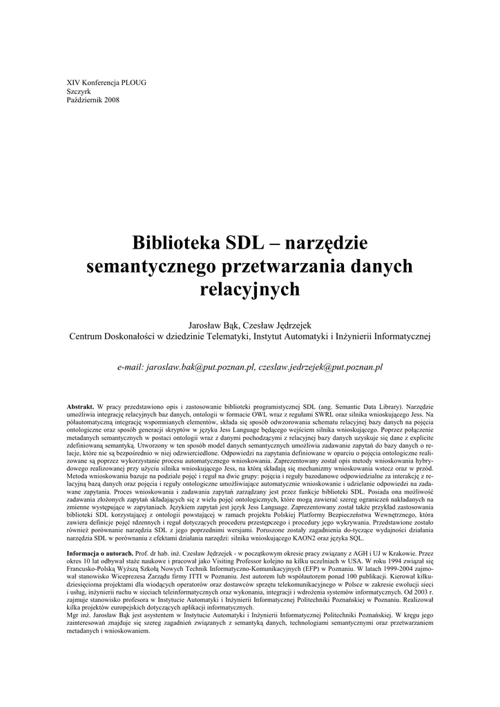 XIV Konferencja PLOUG Szczyrk Październik 2008 Biblioteka SDL – narzędzie semantycznego przetwarzania danych relacyjnych Jarosław Bąk, Czesław Jędrzejek Centrum Doskonałości w dziedzinie Telematyki, Instytut Automatyki i Inżynierii Informatycznej e-mail: [email protected], [email protected] Abstrakt. W pracy przedstawiono opis i zastosowanie biblioteki programistycznej SDL (ang. Semantic Data Library). Narzędzie umożliwia integrację relacyjnych baz danych, ontologii w formacie OWL wraz z regułami SWRL oraz silnika wnioskującego Jess. Na półautomatyczną integrację wspomnianych elementów, składa się sposób odwzorowania schematu relacyjnej bazy danych na pojęcia ontologiczne oraz sposób generacji skryptów w języku Jess Language będącego wejściem silnika wnioskującego. Poprzez połączenie metadanych semantycznych w postaci ontologii wraz z danymi pochodzącymi z relacyjnej bazy danych uzyskuje się dane z explicite zdefiniowaną semantyką. Utworzony w ten sposób model danych semantycznych umożliwia zadawanie zapytań do bazy danych o relacje, które nie są bezpośrednio w niej odzwierciedlone. Odpowiedzi na zapytania definiowane w oparciu o pojęcia ontologiczne realizowane są poprzez wykorzystanie procesu automatycznego wnioskowania. Zaprezentowany został opis metody wnioskowania hybrydowego realizowanej przy użyciu silnika wnioskującego Jess, na którą składają się mechanizmy wnioskowania wstecz oraz w przód. Metoda wnioskowania bazuje na podziale pojęć i reguł na dwie grupy: pojęcia i reguły bazodanowe odpowiedzialne za interakcję z relacyjną bazą danych oraz pojęcia i reguły ontologiczne umożliwiające automatycznie wnioskowanie i udzielanie odpowiedzi na zadawane zapytania. Proces wnioskowania i zadawania zapytań zarządzany jest przez funkcje biblioteki SDL. Posiada ona możliwość zadawania złożonych zapytań składających się z wielu pojęć ontologicznych, które mogą zawierać szereg ograniczeń nakładanych na zmienne występujące w zapytaniach. Językiem zapytań jest język Jess Language. Zaprezentowany został także przykład zastosowania biblioteki SDL korzystającej z ontologii powstającej w ramach projektu Polskiej Platformy Bezpieczeństwa Wewnętrznego, która zawiera definicje pojęć rdzennych i reguł dotyczących procederu przestępczego i procedury jego wykrywania. Przedstawione zostało również porównanie narzędzia SDL z jego poprzednimi wersjami. Poruszone zostały zagadnienia do-tyczące wydajności działania narzędzia SDL w porównaniu z efektami działania narzędzi: silnika wnioskującego KAON2 oraz języka SQL. Informacja o autorach. Prof. dr hab. inż. Czesław Jędrzejek - w początkowym okresie pracy związany z AGH i UJ w Krakowie. Przez okres 10 lat odbywał staże naukowe i pracował jako Visiting Professor kolejno na kilku uczelniach w USA. W roku 1994 związał się Francusko-Polską Wyższą Szkołą Nowych Technik Informatyczno-Komunikacyjnych (EFP) w Poznaniu. W latach 1999-2004 zajmował stanowisko Wiceprezesa Zarządu firmy ITTI w Poznaniu. Jest autorem lub współautorem ponad 100 publikacji. Kierował kilkudziesięcioma projektami dla wiodących operatorów oraz dostawców sprzętu telekomunikacyjnego w Polsce w zakresie ewolucji sieci i usług, inżynierii ruchu w sieciach teleinformatycznych oraz wykonania, integracji i wdrożenia systemów informatycznych. Od 2003 r. zajmuje stanowisko profesora w Instytucie Automatyki i Inżynierii Informatycznej Politechniki Poznańskiej w Poznaniu. Realizował kilka projektów europejskich dotyczących aplikacji informatycznych. Mgr inż. Jarosław Bąk jest asystentem w Instytucie Automatyki i Inżynierii Informatycznej Politechniki Poznańskiej. W kręgu jego zainteresowań znajduje się szereg zagadnień związanych z semantyką danych, technologiami semantycznymi oraz przetwarzaniem metadanych i wnioskowaniem. Biblioteka SDL – narzędzie semantycznego przetwarzania danych relacyjnych 73 1. Wprowadzenie Rozwój sieci semantycznych systemów informatycznych oraz zwiększanie się wymagań użytkowników doprowadziły do wniosków, z których jednoznacznie wynika, iż dane bez dodatkowych informacji je opisujących nie są już wystarczające, aby mogły być przetwarzane w sposób inteligentny przez maszyny. Informacje pozyskiwane z relacyjnych baz danych muszą zawierać dodatkowe metadane służące procesom przetwarzania, analizowania i wnioskowania. Dołączenie do danych relacyjnych warstwy konceptualnej (ontologii) umożliwia utworzenie bazy wiedzy, której zakres obejmuje wiedzę ekspertów w danej dziedzinie. Utworzony w ten sposób model danych wymaga powstania odpowiednich narzędzi umożliwiających efektywną realizację zapytań i wnioskowania. 1.1. Cel pracy Celem pracy jest opracowanie metody reprezentowania i przetwarzania danych sieci semantycznej umożliwiającej efektywną realizację zapytań wykorzystujących wnioskowanie. Niezależnie od dominacji komercyjnej baz relacyjnych, istnieje coraz szersza klasa zastosowań (wyszukiwanie w sieci, przetwarzanie tekstu, dane strumieniowe lub naukowe), dla których logiczna reprezentacja RDF jest wygodniejsza [AMMH], [SMAHHH]. Tworzona biblioteka SDL (ang. Semantic Data Library) umożliwia dołączanie informacji semantycznej w postaci ontologii do danych relacyjnych. Utworzony w ten sposób model danych semantycznych pozwala na zadawanie zapytań do relacyjnej bazy danych o relacje niebędące bezpośrednio w niej odzwierciedlone. Odpowiedzi na zapytania realizowane są na bazie pojęć i reguł ontologicznych biorących udział w procesie automatycznego wnioskowania hybrydowego (na które składa się wnioskowanie w przód oraz wstecz). Biblioteka SDL umożliwia realizowanie zapytań do relacyjnych baz danych w języku Jess Language [Jess] oraz integrację: • modelu konceptualnego wiedzy reprezentowanego w postaci ontologii, • reguł przetwarzanych przez silnik wni