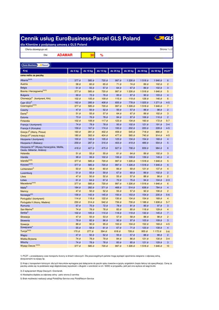 Cennik usług EuroBusiness-Parcel GLS Poland dla Klientów z podpisaną umową z GLS Poland Strona 1 z 2 Oferta obowiązuje od: Dla: ADAMAR Kraj 30 do 5 kg do 10 kg % do 15 kg do 25 kg do 30 kg do 40 kg do 50 kg PCZT1) cena netto za paczkę Albania2)4)5) 377 zł 585 zł 720 zł 997 zł 1 226 zł 1 518 zł 1 646 zł 6 Austria 58 zł 60 zł 65 zł 71 zł 74 zł 89 zł 102 zł 2 Belgia Bosnia i Herzegowina2)4)5) 51 zł 55 zł 57 zł 64 zł 67 zł 89 zł 102 zł 3 377 zł 585 zł 720 zł 997 zł 1 226 zł 1 518 zł 1 646 zł 5 Bułgaria Chorwacja4) (kontynent, Krk) 69 zł 72 zł 76 zł 83 zł 87 zł 90 zł 103 zł 4 102 zł 105 zł 109 zł 115 zł 119 zł 128 zł 146 zł 6 162 zł 285 zł 408 zł 655 zł 778 zł 1 025 zł 1 271 zł 4-5 377 zł 585 zł 720 zł 997 zł 1 226 zł 1 518 zł 1 646 zł 7 Czechy 47 zł 50 zł 52 zł 55 zł 57 zł 88 zł 98 zł 2 Dania3) 51 zł 55 zł 57 zł 64 zł 67 zł 89 zł 102 zł 3 Cypr (EU)2) Czarnogóra2)4)5) Estonia Finlandia 73 zł 76 zł 78 zł 84 zł 87 zł 106 zł 116 zł 2 102 zł 109 zł 117 zł 123 zł 134 zł 160 zł 172 zł 5-7 Francja I (kontynent) 74 zł 78 zł 78 zł 93 zł 102 zł 121 zł 191 zł 3-4 Francja II (Korsyka) 159 zł 167 zł 174 zł 193 zł 202 zł 220 zł 228 zł 4-5 Grecja I2) (Ateny, Pireus) 160 zł 281 zł 402 zł 459 zł 545 zł 718 zł 890 zł 3 Grecja II2) (reszta kraju) 180 zł 302 zł 424 zł 477 zł 565 zł 740 zł 914 zł 4-5 Hiszpania I (kontynent) 100 zł 102 zł 105 zł 123 zł 134 zł 154 zł 169 zł 4 Hiszpania II (Baleary) 259 zł 287 zł 316 zł 403 zł 419 zł 489 zł 554 zł 5 418 zł 427 zł 475 zł 627 zł 708 zł 839 zł 984 zł 6 51 zł 55 zł 55 zł 61 zł 64 zł 89 zł 102 zł 3 98 zł 99 zł 102 zł 106 zł 109 zł 139 zł 149 zł 4 Islandia2)4)5) 377 zł 585 zł 720 zł 997 zł 1 226 zł 1 518 zł 1 646 zł 5 Kosowo2)4)5) 377 zł 585 zł 720 zł 997 zł 1 226 zł 1 518 zł 1 646 zł 6 Lichtenstein4) 53 zł 56 zł 60 zł 66 zł 69 zł 121 zł 137 zł 4 Luxemburg 51 zł 55 zł 59 zł 67 zł 69 zł 89 zł 102 zł 2 Litwa Łotwa Macedonia2)4)5) 47 zł 50 zł 52 zł 55 zł 57 zł 88 zł 98 zł 2 61 zł 64 zł 67 zł 72 zł 75 zł 94 zł 104 zł 2-3 377 zł 585 zł 720 zł 997 zł 1 226 zł 1 518 zł 1 646 zł 6 Malta2) 184 zł 282 zł 371 zł 468 zł 514 zł 638 zł 784 zł 4 Hiszpania III4) (Wyspy Kanaryjskie, Melilla, Ceuta, Giblartar, Andora) Holandia Irlandia 47 zł 50 zł 52 zł 55 zł 57 zł 92 zł 106 zł 2 Norwegia4)5) 139 zł 142 zł 145 zł 150 zł 153 zł 154 zł 235 zł 5-6 Portugalia I (kontynent) 114 zł 118 zł 122 zł 130 zł 134 zł 154 zł 169 zł Portugalia II (Azory, Madera) Rumunia 230 zł 314 zł 542 zł 739 zł 739 zł 1 188 zł 1 638 zł Niemcy San Marino4) Serbia4) 4 5-7 67 zł 70 zł 72 zł 78 zł 81 zł 85 zł 97 zł 3 74 zł 78 zł 78 zł 83 zł 85 zł 118 zł 129 zł 4 7 102 zł 105 zł 110 zł 118 zł 119 zł 132 zł 145 zł Słowacja 47 zł 50 zł 53 zł 57 zł 58 zł 88 zł 98 zł 2 Słowenia 79 zł 82 zł 86 zł 92 zł 97 zł 103 zł 109 zł 3 Szwecja Szwajcaria4) 88 zł 90 zł 95 zł 102 zł 104 zł 152 zł 169 zł 4-5 55 zł 58 zł 61 zł 67 zł 71 zł 123 zł 139 zł Turcja2)4)5) 170 zł 277 zł 394 zł 618 zł 728 zł 955 zł 1 172 zł 4 5-6 Węgry 47 zł 50 zł 52 zł 55 zł 57 zł 88 zł 98 zł 2 Wielka Brytania Włochy Wyspy Owcze 2)4)5) 74 zł 78 zł 79 zł 84 zł 86 zł 121 zł 130 zł 3-4 74 zł 78 zł 78 zł 83 zł 85 zł 121 zł 129 zł 3 377 zł 585 zł 720 zł 997 zł 1 226 zł 1 518 zł 1 646 zł 10 1) PCZT = przewidywany czas transportu liczony w dniach roboczych. Dla poszczególnych państw mogą wystapić opoźnienia związane z odprawą celną, doręczeniami na wyspy itp. 2) Kraje z transportem lotniczym: dla tych kierunków wymagane jest dołączenie do paczki opisu towarów w języku angielskim (kopia faktury lub specyfikacja). Cenę za paczkę ustala się na podstawie wagi objętościowej (wysokość x długość x szerokość w cm / 6000) w przypadku, jeśli jest ona wyŜsza od wagi brutto 3) Z wyłączeniem Wysp Owczych i Grenlandii. 4) Niezbędna dopłata za odprawę celną - patrz strona 2 cennika 5) Brak moŜliwości realizacji usługi Pick&Ship-Service oraz Pick&Return-Service