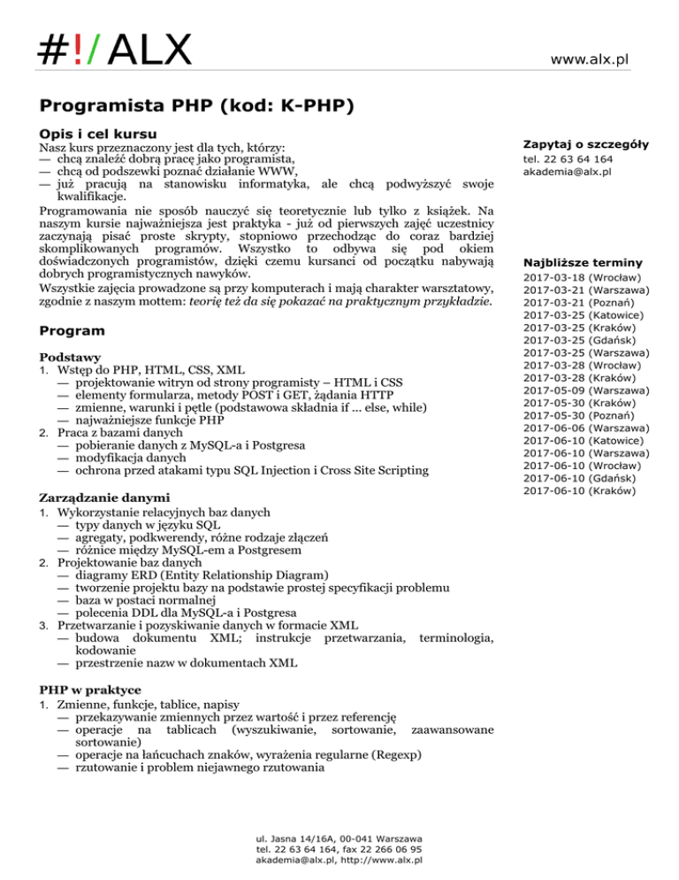 Programista PHP (kod: K-PHP) Opis i cel kursu Nasz kurs przeznaczony jest dla tych, którzy: — chcą znaleźć dobrą pracę jako programista, — chcą od podszewki poznać działanie WWW, — już pracują na stanowisku informatyka, ale chcą podwyższyć swoje kwalifikacje. Programowania nie sposób nauczyć się teoretycznie lub tylko z książek. Na naszym kursie najważniejsza jest praktyka - już od pierwszych zajęć uczestnicy zaczynają pisać proste skrypty, stopniowo przechodząc do coraz bardziej skomplikowanych programów. Wszystko to odbywa się pod okiem doświadczonych programistów, dzięki czemu kursanci od początku nabywają dobrych programistycznych nawyków. Wszystkie zajęcia prowadzone są przy komputerach i mają charakter warsztatowy, zgodnie z naszym mottem: teorię też da się pokazać na praktycznym przykładzie. Program Podstawy 1. Wstęp do PHP, HTML, CSS, XML — projektowanie witryn od strony programisty – HTML i CSS — elementy formularza, metody POST i GET, żądania HTTP — zmienne, warunki i pętle (podstawowa składnia if ... else, while) — najważniejsze funkcje PHP 2. Praca z bazami danych — pobieranie danych z MySQL-a i Postgresa — modyfikacja danych — ochrona przed atakami typu SQL Injection i Cross Site Scripting Zarządzanie danymi 1. Wykorzystanie relacyjnych baz danych — typy danych w języku SQL — agregaty, podkwerendy, różne rodzaje złączeń — różnice między MySQL-em a Postgresem 2. Projektowanie baz danych — diagramy ERD (Entity Relationship Diagram) — tworzenie projektu bazy na podstawie prostej specyfikacji problemu — baza w postaci normalnej — polecenia DDL dla MySQL-a i Postgresa 3. Przetwarzanie i pozyskiwanie danych w formacie XML — budowa dokumentu XML; instrukcje przetwarzania, terminologia, kodowanie — przestrzenie nazw w dokumentach XML PHP w praktyce 1. Zmienne, funkcje, tablice, napisy — przekazywanie zmiennych przez wartość i przez referencję — operacje na tablicach (wyszukiwanie, sortowanie, zaawansowane sortowanie) — operacje na łańcuchach znaków, wyrażenia regularne (Regexp) — rzutowanie i problem niejawnego rzutowania ul. Jasna 14/16A, 00-041 Warszawa tel. 22 63 64 164, fax 22 266 06 95 [email protected], http://www.alx.pl Zapytaj o szczegóły tel. 22 63 64 164 [email protected] Najbliższe terminy 2017-03-18 2017-03-21 2017-03-21 2017-03-25 2017-03-25 2017-03-25 2017-03-25 2017-03-28 2017-03-28 2017-05-09 2017-05-30 2017-05-30 2017-06-06 2017-06-10 2017-06-10 2017-06-10 2017-06-10 2017-06-10 (Wrocław) (Warszawa) (Poznań) (Katowice) (Kraków) (Gdańsk) (Warszawa) (Wrocław) (Kraków) (Warszawa) (Kraków) (Poznań) (Warszawa) (Katowice) (Warszawa) (Wrocław) (Gdańsk) (Kraków) 2. Programowanie obiektowe — składnia obiektowa i wykorzystanie istniejących bibliotek — praktyki dotyczące wczytywania klas — projektowanie programów obiektowych: składnia — — — — definicji klas, widoczność, asercja typu parametrów w metodach i funkcjach, użycie interfejsów i klas abstrakcyjnych przykładowe interfejsy i klasy biblioteki SPL (Standard PHP Library; np. Iterator, ArrayAccess, DirectoryIterator) podstawy diagramów klas UML wzorce projektowe charakterystyczne dla aplikacji PHP stworzenie prostej aplikacji w modelu MVC (w wariancie Front Controller) Techniki warstwy prezentacji 1. Javascript — język Javascript: funkcje, zmienne, sposób użycia w kontekście dokumentu HTML — model DOM, efekty i animacja — przykładowe popularne skrypty dostępne w sieci (efekty) — dynamiczna walidacja formularza 2. Systemy szablonowe, ich użycie w aplikacjach MVC — użycie systemu Smarty (bądź podobnego, np. Twig) Środowisko pracy 1. Użycie winscp i prostych edytorów programistycznych do edycji i wdrażania witryn internetowych na serwerach hostingowych Przeznaczenie i wymagania Od zapisujących się nie wymagamy umiejętności programowania w żadnym języku, a jedynie dobrego obeznania z Windows (sprawna obsługa systemu, typowych programów), codziennego korzystania i rozumienia podstaw działania Internetu. Certyfikaty Uczestnicy kończą nasz kurs z umiejętnościami wystarczającymi do stworzenia sklepu internetowego, dyskusyjnego forum i witryn intranetowych. Zajęcia kończą się wydaniem certyfikatu ze szczegółową listą zdobytych umiejętności. ul. Jasna 14/16A, 00-041 Warszawa tel. 22 63 64 164, fax 22 266 06 95 [email protected], http://www.alx.pl Zapytaj o szczegóły tel. 22 63 64 164 [email protected] Najbliższe terminy 2017-03-18 2017-03-21 2017-03-21 2017-03-25 2017-03-25 2017-03-25 2017-03-25 2017-03-28 2017-03-28 2017-05-09 2017-05-30 2017-05-30 2017-06-06 2017-06-10 2017-06-10 2017-06-10 2017-06-10 2017-06-10 (Wrocław) (Warszawa) (Poznań) (Katowice) (Kraków) (Gdańsk) (Warszawa) (Wrocław) (Kraków) (Warszawa) (Kraków) (Poznań) (Warszawa) (Katowice) (Warszawa) (Wrocław) (Gdańsk) (Kraków)
