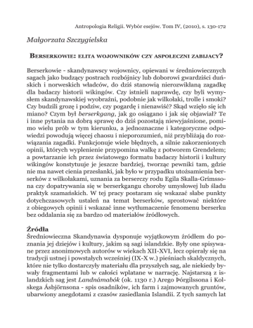 Antropologia Religii. Wybór esejów. Tom IV, (2010), s. 130-172 Małgorzata Szczygielska Berserkowie: elita wojowników czy aspołeczni zabijacy? Berserkowie - skandynawscy wojownicy, opiewani w średniowiecznych sagach jako budzący postrach rozbójnicy lub doborowi gwardziści duńskich i norweskich władców, do dziś stanowią nierozwikłaną zagadkę dla badaczy historii wikingów. Czy istnieli naprawdę, czy byli wymysłem skandynawskiej wyobraźni, podobnie jak wilkołaki, trolle i smoki? Czy budzili grozę i podziw, czy pogardę i nienawiść? Skąd wzięło się ich miano? Czym był berserkgang, jak go osiągano i jak się objawiał? Te i inne pytania na dobrą sprawę do dziś pozostają niewyjaśnione, pomimo wielu prób w tym kierunku, a jednoznaczne i kategoryczne odpowiedzi powodują więcej chaosu i nieporozumień, niż przybliżają do rozwiązania zagadki. Funkcjonuje wiele błędnych, a silnie zakorzenionych opinii, których wyplenienie przypomina walkę z potworem Grendelem; a powtarzanie ich przez światowego formatu badaczy historii i kultury wikingów konstytuuje je jeszcze bardziej, tworząc pewniki tam, gdzie nie ma nawet cienia przesłanki, jak było w przypadku utożsamienia berserków z wilkołakami, uznania za berserczy rodu Egila Skalla-Grímssona czy dopatrywania się w berserkgangu choroby umysłowej lub śladu praktyk szamańskich. W tej pracy postaram się wskazać słabe punkty dotychczasowych ustaleń na temat berserków, sprostować niektóre z obiegowych opinii i wskazać inne wytłumaczenie fenomenu berserku bez oddalania się za bardzo od materiałów źródłowych. Źródła Średniowieczna Skandynawia dysponuje wyjątkowym źródłem do poznania jej dziejów i kultury, jakim są sagi islandzkie. Były one spisywane przez anonimowych autorów w wiekach XII-XVI, lecz opierały się na tradycji ustnej i powstałych wcześniej (IX-X w.) pieśniach skaldycznych, które nie tylko dostarczyły materiału dla przyszłych sag, ale niekiedy bywały fragmentami lub w całości wplatane w narrację. Najstarszą z islandzkich sag jest Landnámabók (ok. 1130 r.) Arego Þórgilssona i Kolskega Ásbjörnsona - spis osadników, ich farm i zajmowanych gruntów, ubarwiony anegdotami z czasów zasiedlania Islandii. Z tych samych lat 131 pochodzi Islendingabók Arego Þórgilssona, historia Islandii spisana na podstawie przekazów ustnych ludzi, których pamięć sięgała bardzo daleko. Innym dziełem historycznym, powstałym w niecałe sto lat później, jest Heimskringla Snorrego Sturlusona, historia królów Norwegii doprowadzona do roku 1184. Największe sagi powstały w ciągu XIII wieku, choć trudno sprecyzować dokładniejsze daty. Sagi powstawały również w wiekach następnych i z biegiem czasu opowieści w nich zawarte stawały się coraz bardziej fantastyczne, mieszając motywy baśniowe i literackie z różnych stron świata. Dotyczy to także kwestii berserków, którzy w późniejszych - XV- i XVI-wiecznych - sagach zaczną być coraz częściej utożsamiani z blámennami („czarnymi ludami”), o czym będzie jeszcze mowa. W pracy nie uwzględniono wszystkich istniejących sag, lecz dobór źródeł był na tyle przypadkowy, by móc uznać wyniki za reprezentatywne. Jedynym kryterium doboru było występowanie w utworze terminu „berserk” i pod tym właśnie kątem przeanalizowałam wszystkie źródła, jakie były mi dostępne (w głównej mierze dzięki obecności ich oryginalnych wersji w sieci). Przyjęłam bowiem założenie, że należy oprzeć się w pierwszym rzędzie na postaciach nazwanych berserkami już przez samego sagamaðra - autora sag, a dopiero później ewentualnie próbować doszukiwać się cech berserków (o ile takowe istnieją) u postaci nie nazwanych wprost tym mianem (jak np. u Egila Skalla-Grímssona z Egli lub Skarphéðina Njálssona z Njáli), nie zaś na odwrót. Ogółem przeanalizowano tu 19 sag bajecznych (tzw. fornaldarsögur), 19 sag rodowych (Islendingasögur), 3 sagi królewskie Snorrego Sturlusona i kronikę duńską Saxona Gramatyka, a także 2 pieśni eddaiczne oraz trzy części tzw. Eddy prozaicznej Snorrego Sturlusona. Sagi rodowe, tzw. sagi o Islandczykach (Islendingasögur), powstawały od końca XII w. do XIV w. i opisują dzieje ludzi żyjących w przeszłości na Islandii, protoplastów islandzkich rodów i wybitne postaci islandzkiej historii. Do sag rodowych wykorzystanych w tej pracy zaliczają się: Landnámabók, Egils saga Skalla-Grímssonar (Egla), Brennu-Njáls saga (Njála), Eyrbyggja saga, Laxdǽla saga, Gunnlaugs saga ormstungu, Grettis saga sterka (Grettla), Vatnsdǽla saga, Flóamanna saga, Hrana saga hrings, Reykdǽla saga og Víga-Skútu, Svarfdǽla saga, Þórdar saga hredu, Víga-Glúms saga, Gunnars saga Keldúgnupsfífls, Gísla saga Súrssonar, Gull-Þóris saga oraz Heiðarvíga saga. 132 Sagi bajeczne (zmyślone), dość późne w porównaniu z rodowymi, bo pochodzące z XIV-XVI w., i opisujące dzieje bohaterów mitycznych lub fantastycznych, zebrane zostały przez Gudniego Jónssona i Bjarniego Vilhjalmssona w trzytomowym dziele Fornaldarsögur Norðurlanda, wydanym w latach 1943-1944. Wszystkie wykorzystane w niniejszej pracy sagi bajeczne pochodzą z tego opracowania; i tak z tomu pierwszego: Þáttr af Ragnars sonum, Hervarar saga ok Heiðreks, Grims saga loðinkinna, Örvar-Odds saga; z tomu drugiego: Hrólf saga kraka ok kappa hans (wraz z dodatkiem Af Aðils Uppsalakonungi ok Sviþjódarferd Hrólfskonungs ok kappa hans), Frá Fornjóti ok hans ættmönnum, Hálfs saga ok Hálfsrekka, Þorsteins saga Víkingssonar, Hrómundar saga Grípssonar, Ásmundar saga kappabana, Sturlaugs saga starfsama, Göngu-Hrólfs saga; z trzeciego: Gautreks saga, Hrólfs saga Gautrekssonar, Egils saga einhenda ok Ásmundar berserkjabana, Sörla saga sterka, Hjálmtes saga ok Ölvis, Hálfdanar saga Eystenssonar, Hálfdanar saga Brönufostra. Sagi królewskie to opowieści zgromadzone w z