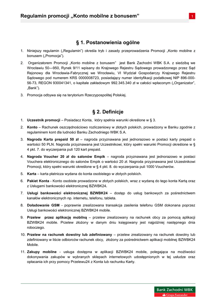 Regulamin promocji „Konto mobilne z bonusem” 1 § 1. Postanowienia ogólne 1. Niniejszy regulamin („Regulamin”) określa tryb i zasady przeprowadzenia Promocji „Konto mobilne z bonusem („Promocja”). 2. Organizatorem Promocji „Konto mobilne z bonusem” jest Bank Zachodni WBK S.A. z siedzibą we Wrocławiu 50—950, Rynek 9/11 wpisany do Krajowego Rejestru Sądowego prowadzonego przez Sąd Rejonowy dla Wrocławia-Fabrycznej we Wrocławiu, VI Wydział Gospodarczy Krajowego Rejestru Sądowego pod numerem KRS 0000008723, posiadający numer identyfikacji podatkowej NIP 896-00056-73, REGON 930041341, o kapitale zakładowym 992.345.340 zł w całości wpłaconym („Organizator”, „Bank”). 3. Promocja odbywa się na terytorium Rzeczypospolitej Polskiej. § 2. Definicje 1. Uczestnik promocji – Posiadacz Konta, który spełnia warunki określone w § 3. 2. Konto – Rachunek oszczędnościowo rozliczeniowy w złotych polskich, prowadzony w Banku zgodnie z regulaminem kont dla ludności Banku Zachodniego WBK S.A. 3. Nagroda Karta prepaid 50 zł – nagroda przyznawana jest jednorazowo w postaci karty prepaid o wartości 50 PLN. Nagroda przyznawana jest Uczestnikowi, który spełni warunki Promocji określone w § 4 pkt. 7. do wyczerpania puli 120 kart prepaid. 4. Nagroda Voucher 20 zł do salonów Empik – nagroda przyznawana jest jednorazowo w postaci Vouchera elektronicznego do salonów Empik o wartości 20 zł. Nagroda przyznawana jest Uczestnikowi Promocji, który spełni warunki określone w § 4 pkt. 8. do wyczerpania puli 1000 Voucherów. 5. Karta – karta płatnicza wydana do konta osobistego w złotych polskich. 6. Pakiet Konta - Konto osobiste prowadzone w złotych polskich, wraz z wydaną do tego konta Kartą oraz z Usługami bankowości elektronicznej BZWBK24. 7. Usługi bankowości elektronicznej BZWBK24 – dostęp do usług bankowych za pośrednictwem kanałów elektronicznych np. internetu, telefonu, tableta. 8. Doładowanie GSM - poprawnie zrealizowana transakcja zasilenia telefonu GSM dokonana poprzez Usługi bankowości elektronicznej BZWBK24 mobile. 9. Przelew przez aplikację mobilną – przelew zrealizowany na rachunek obcy za pomocą aplikacji BZWBK24 mobile. Przelew złożony w danym dniu księgowany jest najpóźniej następnego dnia roboczego. 10. Przelew na rachunek dowolny lub zdefiniowany – przelew zrealizowany na rachunek dowolny lub zdefiniowany w liście odbiorców rachunek obcy, złożony za pośrednictwem aplikacji mobilnej BZWBK24 Mobile. 11. Zakupy mobilne - usługa dostępna w aplikacji BZWBK24 mobile, polegająca na możliwości dokonywania zakupów w wybranych sklepach internetowych udostępnionych w tej usłudze oraz opłacania ich przy pomocy Przelewu24 z Konta lub rachunku Karty. Regulamin promocji „Konto mobilne z bonusem” 2 § 3. Uczestnicy promocji 1. Uczestnikiem Promocji jest pełnoletnia osoba fizyczna, posiadająca obywatelstwo polskie i pełną zdolność do czynności prawnych, która na dzień 23.11.2014 nie posiadała konta osobistego prowadzonego w złotych w Banku Zachodnim WBK S,A., . 2. W Promocji nie mogą uczestniczyć: a. Pracownicy Organizatora. Pracownikiem w rozumieniu niniejszego Regulaminu jest zarówno osoba zatrudniona przez Organizatora na podstawie umowy o prace, jak i osoba współpracująca z Organizatorem na podstawie umowy cywilnoprawnej (w szczególności na podstawie umowy o dzieło, umowy zlecenia), b. Klienci Banku, którzy współposiadają Konto z pracownikiem Organizatora c. Klienci biorący udział w promocji „Karta prepaid z kontem mobilnym” § 4. Zasady i przebieg Promocji 1. Promocja trwa w okresie od dnia 24 listopada 2014r. do dnia 31 stycznia 2015r, jednakże nie dłużej niż do wyczerpania liczby Nagród. („Okres trwania Promocji”). W Promocji Organizator przewidział 120 kart prepaid oraz 1000 Voucherów do salonów Empik. Organizator zastrzega sobie prawo do zwiększenia liczby Nagród. 2. Do promocji przystąpić można najpóźniej do 31 grudnia 2014r. 3. Momentem przystąpienia do Promocji jest data złożenia wniosku, przy czym data ta nie może być późniejsza niż 31 grudnia 2014 r. 4. W Promocji może wziąć udział Uczestnik, o którym mowa w § 3 oraz: a. nie złożył sprzeciwu wobec przetwarzania danych w celach marketingowych, b. wyraził zgodę na otrzymywanie informacji handlowej drogą elektroniczną, c. podał numer telefonu komórkowego do kontaktu. 5. Każdy uczestnik może otrzymać tylko jedną Nagrodę. 6. W przypadku dokonania nowelizacji przepisów ustawy o podatku dochodowym od osób fizycznych i wprowadzenia obowiązku pobierania przez Bank (jako płatnika) od powyższych Nagród zryczałtowanego podatku dochodowego, Bank z chwilą wejścia w życie tych przepisów dokona ubruttowienia wartości każdej Nagrody o zryczałtowany podatek dochodowy, Pobrany podatek od ubruttowionej wartości Nagrody, Bank przekaże na rachunek bankowy właściwego urzędu skarbowego. 7. Nagrody w Promocji 7.1. Nagrody w promocji to Karty prepaid o wartości 50 zł, dla pierwszych 120 Uczestników Promocji oraz Vouchery do salonów Empik, dla kolejnych 1000 Uczestników promocji, którzy spełnią łącznie następujące warunki: Regulamin promocji „Konto mobilne z bonusem” 3 a. W Okresie trwania promocji jednak nie później niż dnia do 31 grudnia 2014 poprawnie wypełnią wniosek internetowy o Pakiet Konta, dostępny na stronach Banku, zawrze umowę o Pakiet Konta oraz ściągnie na telefon lub tablet aplikację BZWBK24 Mobile, Za pośrednictwem aplikacji mobilnej, od momentu zawarcia umowy o Pakiet konta, jednak nie później niż do dnia 31 stycznia 2015, wykona jedną z poniższych operacji:, Przelew na rachunek dowolny lub zdefiniowany, Płatność za Zakupy mobilne, Doładowanie GSM Otwarcie Lokaty mobilnej 7.2. Karta prepaid zostanie przesłana na adres korespondencyjny klienta wskazany we wniosku o założenie Pakietu Konta najpóźniej do dnia 28 