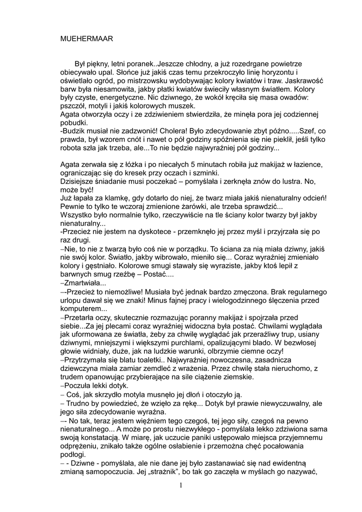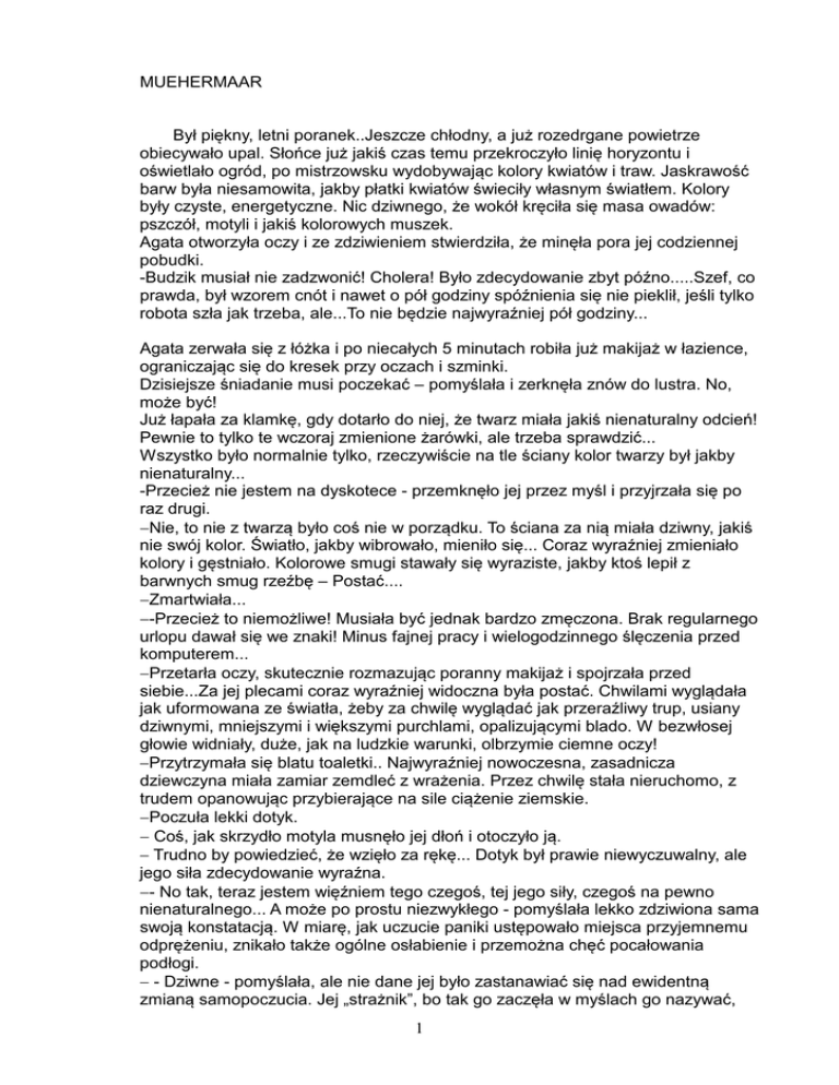 MUEHERMAAR Był piękny, letni poranek..Jeszcze chłodny, a już rozedrgane powietrze obiecywało upal. Słońce już jakiś czas temu przekroczyło linię horyzontu i oświetlało ogród, po mistrzowsku wydobywając kolory kwiatów i traw. Jaskrawość barw była niesamowita, jakby płatki kwiatów świeciły własnym światłem. Kolory były czyste, energetyczne. Nic dziwnego, że wokół kręciła się masa owadów: pszczół, motyli i jakiś kolorowych muszek. Agata otworzyła oczy i ze zdziwieniem stwierdziła, że minęła pora jej codziennej pobudki. -Budzik musiał nie zadzwonić! Cholera! Było zdecydowanie zbyt późno.....Szef, co prawda, był wzorem cnót i nawet o pół godziny spóźnienia się nie pieklił, jeśli tylko robota szła jak trzeba, ale...To nie będzie najwyraźniej pół godziny... Agata zerwała się z łóżka i po niecałych 5 minutach robiła już makijaż w łazience, ograniczając się do kresek przy oczach i szminki. Dzisiejsze śniadanie musi poczekać – pomyślała i zerknęła znów do lustra. No, może być! Już łapała za klamkę, gdy dotarło do niej, że twarz miała jakiś nienaturalny odcień! Pewnie to tylko te wczoraj zmienione żarówki, ale trzeba sprawdzić... Wszystko było normalnie tylko, rzeczywiście na tle ściany kolor twarzy był jakby nienaturalny... -Przecież nie jestem na dyskotece - przemknęło jej przez myśl i przyjrzała się po raz drugi. −Nie, to nie z twarzą było coś nie w porządku. To ściana za nią miała dziwny, jakiś nie swój kolor. Światło, jakby wibrowało, mieniło się... Coraz wyraźniej zmieniało kolory i gęstniało. Kolorowe smugi stawały się wyraziste, jakby ktoś lepił z barwnych smug rzeźbę – Postać.... −Zmartwiała... −-Przecież to niemożliwe! Musiała być jednak bardzo zmęczona. Brak regularnego urlopu dawał się we znaki! Minus fajnej pracy i wielogodzinnego ślęczenia przed komputerem... −Przetarła oczy, skutecznie rozmazując poranny makijaż i spojrzała przed siebie...Za jej plecami coraz wyraźniej widoczna była postać. Chwilami wyglądała jak uformowana ze światła, żeby za chwilę wyglądać jak przeraźliwy trup, usiany dziwnymi, mniejszymi i większymi purchlami, opalizującymi blado. W bezwłosej głowie widniały, duże, jak na ludzkie warunki, olbrzymie ciemne oczy! −Przytrzymała się blatu toaletki.. Najwyraźniej nowoczesna, zasadnicza dziewczyna miała zamiar zemdleć z wrażenia. Przez chwilę stała nieruchomo, z trudem opanowując przybierające na sile ciążenie ziemskie. −Poczuła lekki dotyk. − Coś, jak skrzydło motyla musnęło jej dłoń i otoczyło ją. − Trudno by powiedzieć, że wzięło za rękę... Dotyk był prawie niewyczuwalny, ale jego siła zdecydowanie wyraźna. −- No tak, teraz jestem więźniem tego czegoś, tej jego siły, czegoś na pewno nienaturalnego... A może po prostu niezwykłego - pomyślała lekko zdziwiona sama swoją konstatacją. W miarę, jak uczucie paniki ustępowało miejsca przyjemnemu odprężeniu, znikało także ogólne osłabienie i przemożna chęć pocałowania podłogi. − - Dziwne - pomyślała, ale nie dane jej było zastanawiać się nad ewidentną zmianą samopoczucia. Jej „strażnik”, bo tak go zaczęła w myślach go nazywać, 1 ciągnął ją już, w ten sam niewytłumaczalny sposób za sobą. Nie decydując się wcale na przechadzkę, stawiała krok za krokiem, posłuszna jak małe dziecko prowadzone za rączkę. −- Co to, u licha, jest....Magia, kosmici? Normalne to to na pewno nie jest! Zastanawiała się przemierzając przestrzeń swojego mieszkania. Bezkolizyjnie mijała przeszkody na swojej drodze, przy czym dziwnym trafem trasa tej wędrówki, w żaden sposób nie pokrywała się z jej codziennym truchtem. Zmierzali w kierunku ściany! −Nagle w oczy uderzyła ją fala światła, która, jak się jej zdawało, pojawiła się znikąd. Przymróżyła oczy i dopier po dłuższej chwili, zaczęła oswajać się z nowymi warunkami. Oczy znów widziały...Jasna łuna ustępowała miejsca półmrokowi, jak gdyby przesuwała się od światła do zmroku. − − - No, na pewno nie umarłam,wyrwało się jej. Przecież wszyscy, którzy opisywali doznania z pogranicza, pisali o czymś zgoła odwrotnym.... − - Ciemność, a potem tunel ku światłu - pojawiło się w głowie. −Uczucia też ogarniały ją inne... − …Teraz znajdowała się w jakiejś grocie wypełnionej czerwonawym półmrokiem. Światło sączyło się łagodnie z niewiadomego kierunku. Stała teraz,wraz ze swoim stróżem na długim postumencie, chyba kamiennym, kojarzącym się jej zdecydowanie ze starożytnym, ofiarnym ołtarzem. − -Rewelacja, pomyślała. To jednak kosmici. Porwali ją i teraz pokroją na kawałki, żeby dowiedzieć się, dlaczego ma taka fajną, gładką skórę...A może wampiryczne twory? To by tłumaczyło tę ich dziwną skórę, jakby wytrawioną skórkę, ściągniętą z ropuchy...Brr...Coś obrzydliwego! −Jej stróż chyba wyczuł, co myśli... Przez dłoń Agaty popłynął strumień łagodnego ciepła, wbrew jej woli rozpraszając lęk. − - No to przynajmniej, ze znieczuleniem! Pomyślała rozglądając się dookoła. − Niestety, to co zobaczyła znowu nie spodobało się jej. Jakieś pół metra poniżej, dookoła postumentu, stały nieruchomo podobne jej stróżowi istoty z półprzymkniętymi oczami. −Nie trwało to długo, bo niebawem coś znowu zaczęło się dziać. Powietrze ożyło i tak jak w jej łazience, zaczęło drgać i pulsować nabierając kolorów. Istoty otworzyły wielkie oczy i przyglądały się jej z siłą, którą odczuwała wyraźnie. Nie było w tym spojrzeniu agresji, ani przymusu, po prostu jakaś siła. −Agata poczuła mrowienie skóry przechodzące w leciutkie ukłucia, jakby tysiące malutkich igieł wbijały się w całe ciało. Jej śliczny letni kostium do pracy ze lnu, z którego była tak dumna znikał. Po prostu rozpływ