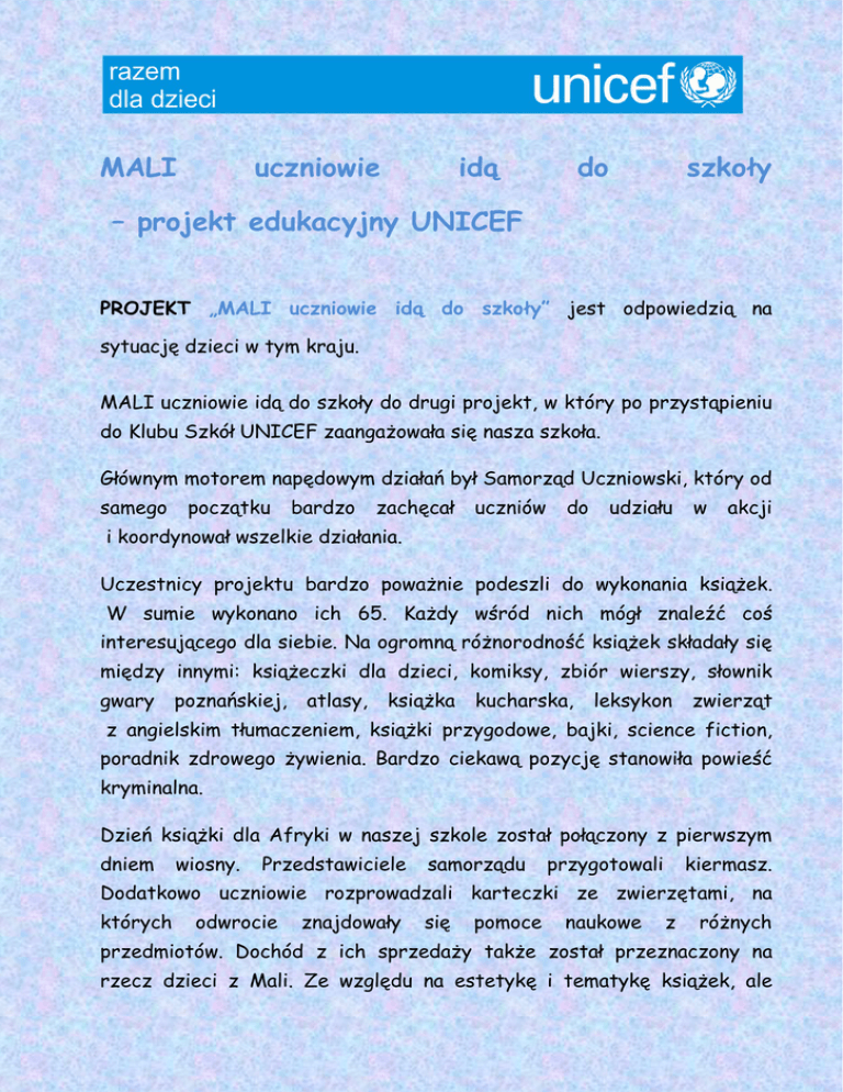 MALI uczniowie idą do szkoły – projekt edukacyjny UNICEF PROJEKT „MALI uczniowie idą do szkoły” jest odpowiedzią na sytuację dzieci w tym kraju. MALI uczniowie idą do szkoły do drugi projekt, w który po przystąpieniu do Klubu Szkół UNICEF zaangażowała się nasza szkoła. Głównym motorem napędowym działań był Samorząd Uczniowski, który od samego początku bardzo zachęcał uczniów do udziału w akcji i koordynował wszelkie działania. Uczestnicy projektu bardzo poważnie podeszli do wykonania książek. W sumie wykonano ich 65. Każdy wśród nich mógł znaleźć coś interesującego dla siebie. Na ogromną różnorodność książek składały się między innymi: książeczki dla dzieci, komiksy, zbiór wierszy, słownik gwary poznańskiej, atlasy, książka kucharska, leksykon zwierząt z angielskim tłumaczeniem, książki przygodowe, bajki, science fiction, poradnik zdrowego żywienia. Bardzo ciekawą pozycję stanowiła powieść kryminalna. Dzień książki dla Afryki w naszej szkole został połączony z pierwszym dniem wiosny. Przedstawiciele samorządu przygotowali kiermasz. Dodatkowo uczniowie rozprowadzali karteczki ze zwierzętami, na których odwrocie znajdowały się pomoce naukowe z różnych przedmiotów. Dochód z ich sprzedaży także został przeznaczony na rzecz dzieci z Mali. Ze względu na estetykę i tematykę książek, ale również ze względu na charytatywny cel akcji, książki błyskawicznie znalazły nowych właścicieli. Łączna kwota, która zasiliła konto UNICEF wyniosła 272 złote. Projekt spotkał się z pozytywnym odzewem ze strony uczniów, rodziców, nauczycieli. Po raz kolejny uczniowie pokazali, że chcą i potrafią pomagać. Zdali kolejny egzamin z człowieczeństwa, zaangażowania i empatii. Projekt pozwolił uświadomić, jak ogromnymi są szczęściarzami mając swobodny dostęp do edukacji. Uczniowie naszej szkoły wiedzą już, jakie możliwości pomagania innym daje im członkostwo szkoły w Klubie szkół UNICEF. Z niecierpliwością czekają na kolejny projekt. SERDECZNIE DZIĘKUJEMY ZA UDZIAŁ W PROJEKCIE!