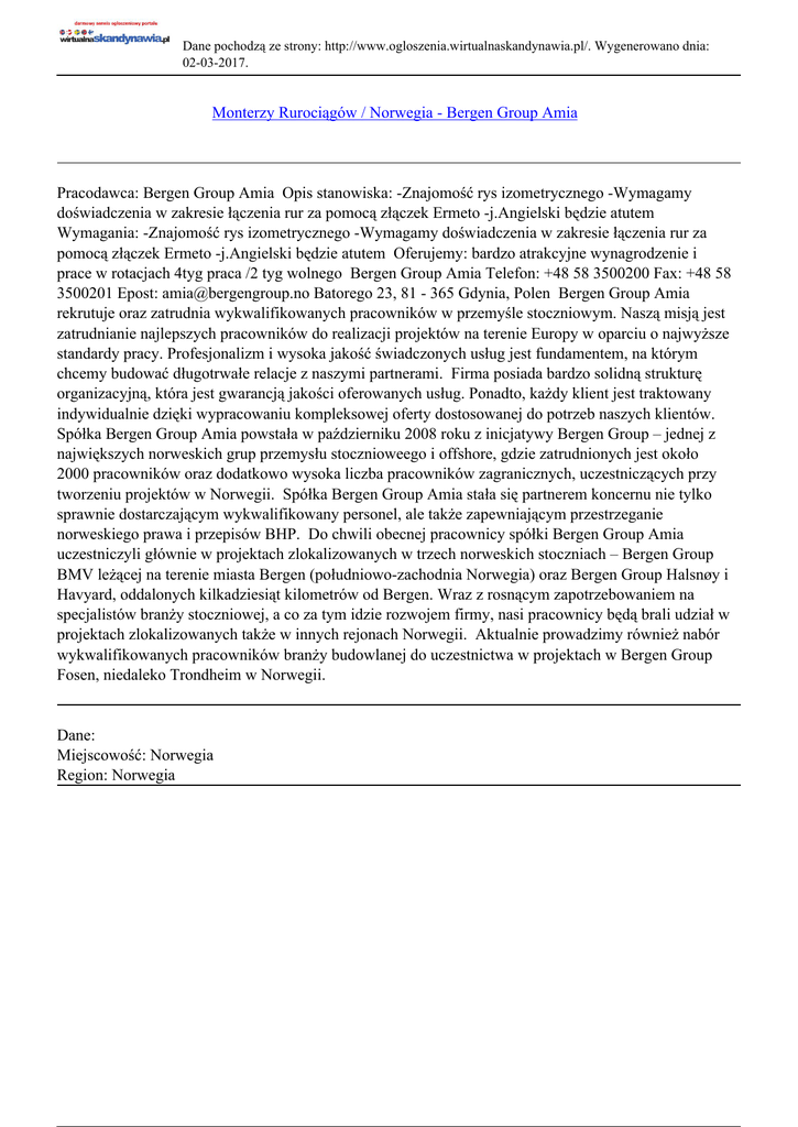 Dane pochodzą ze strony: http://www.ogloszenia.wirtualnaskandynawia.pl/. Wygenerowano dnia: 02-03-2017. Monterzy Rurociągów / Norwegia - Bergen Group Amia Pracodawca: Bergen Group Amia Opis stanowiska: -Znajomość rys izometrycznego -Wymagamy doświadczenia w zakresie łączenia rur za pomocą złączek Ermeto -j.Angielski będzie atutem Wymagania: -Znajomość rys izometrycznego -Wymagamy doświadczenia w zakresie łączenia rur za pomocą złączek Ermeto -j.Angielski będzie atutem Oferujemy: bardzo atrakcyjne wynagrodzenie i prace w rotacjach 4tyg praca /2 tyg wolnego Bergen Group Amia Telefon: +48 58 3500200 Fax: +48 58 3500201 Epost: [email protected] Batorego 23, 81 - 365 Gdynia, Polen Bergen Group Amia rekrutuje oraz zatrudnia wykwalifikowanych pracowników w przemyśle stoczniowym. Naszą misją jest zatrudnianie najlepszych pracowników do realizacji projektów na terenie Europy w oparciu o najwyższe standardy pracy. Profesjonalizm i wysoka jakość świadczonych usług jest fundamentem, na którym chcemy budować długotrwałe relacje z naszymi partnerami. Firma posiada bardzo solidną strukturę organizacyjną, która jest gwarancją jakości oferowanych usług. Ponadto, każdy klient jest traktowany indywidualnie dzięki wypracowaniu kompleksowej oferty dostosowanej do potrzeb naszych klientów. Spółka Bergen Group Amia powstała w październiku 2008 roku z inicjatywy Bergen Group – jednej z największych norweskich grup przemysłu stocznioweego i offshore, gdzie zatrudnionych jest około 2000 pracowników oraz dodatkowo wysoka liczba pracowników zagranicznych, uczestniczących przy tworzeniu projektów w Norwegii. Spółka Bergen Group Amia stała się partnerem koncernu nie tylko sprawnie dostarczającym wykwalifikowany personel, ale także zapewniającym przestrzeganie norweskiego prawa i przepisów BHP. Do chwili obecnej pracownicy spółki Bergen Group Amia uczestniczyli głównie w projektach zlokalizowanych w trzech norweskich stoczniach – Bergen Group BMV leżącej na terenie miasta Bergen (południowo-zachodnia Norwegia) oraz Bergen Group Halsnøy i Havyard, oddalonych kilkadziesiąt kilometrów od Bergen. Wraz z rosnącym zapotrzebowaniem na specjalistów branży stoczniowej, a co za tym idzie rozwojem firmy, nasi pracownicy będą brali udział w projektach zlokalizowanych także w innych rejonach Norwegii. Aktualnie prowadzimy również nabór wykwalifikowanych pracowników branży budowlanej do uczestnictwa w projektach w Bergen Group Fosen, niedaleko Trondheim w Norwegii. Dane: Miejscowość: Norwegia Region: Norwegia
