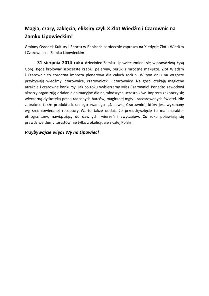 Magia, czary, zaklęcia, eliksiry czyli X Zlot Wiedźm i Czarownic na Zamku Lipowieckim! Gminny Ośrodek Kultury i Sportu w Babicach serdecznie zaprasza na X edycję Zlotu Wiedźm i Czarownic na Zamku Lipowieckim! 31 sierpnia 2014 roku dzieciniec Zamku Lipowiec zmieni się w prawdziwą Łysą Górę. Będą królować szpiczaste czapki, peleryny, peruki i mroczne makijaże. Zlot Wiedźm i Czarownic to coroczna impreza plenerowa dla całych rodzin. W tym dniu na wzgórze przybywają wiedźmy, czarownice, czarowniczki i czarownicy. Na gości czekają magiczne atrakcje i czarowne konkursy. Jak co roku wybierzemy Miss Czarownic! Ponadto zawodowi aktorzy organizują działania animacyjne dla najmłodszych uczestników. Impreza zakończy się wieczorną dyskoteką pełną radosnych harców, magicznej mgły i zaczarowanych świateł. Nie zabraknie także produktu lokalnego zwanego „Nalewką Czarownic", który jest wykonany wg średniowiecznej receptury. Warto także dodać, że przedsięwzięcie to ma charakter etnograficzny, nawiązujący do dawnych wierzeń i zwyczajów. Co roku pojawiają się prawdziwe tłumy turystów nie tylko z okolicy, ale z całej Polski! Przybywajcie więc i Wy na Lipowiec!