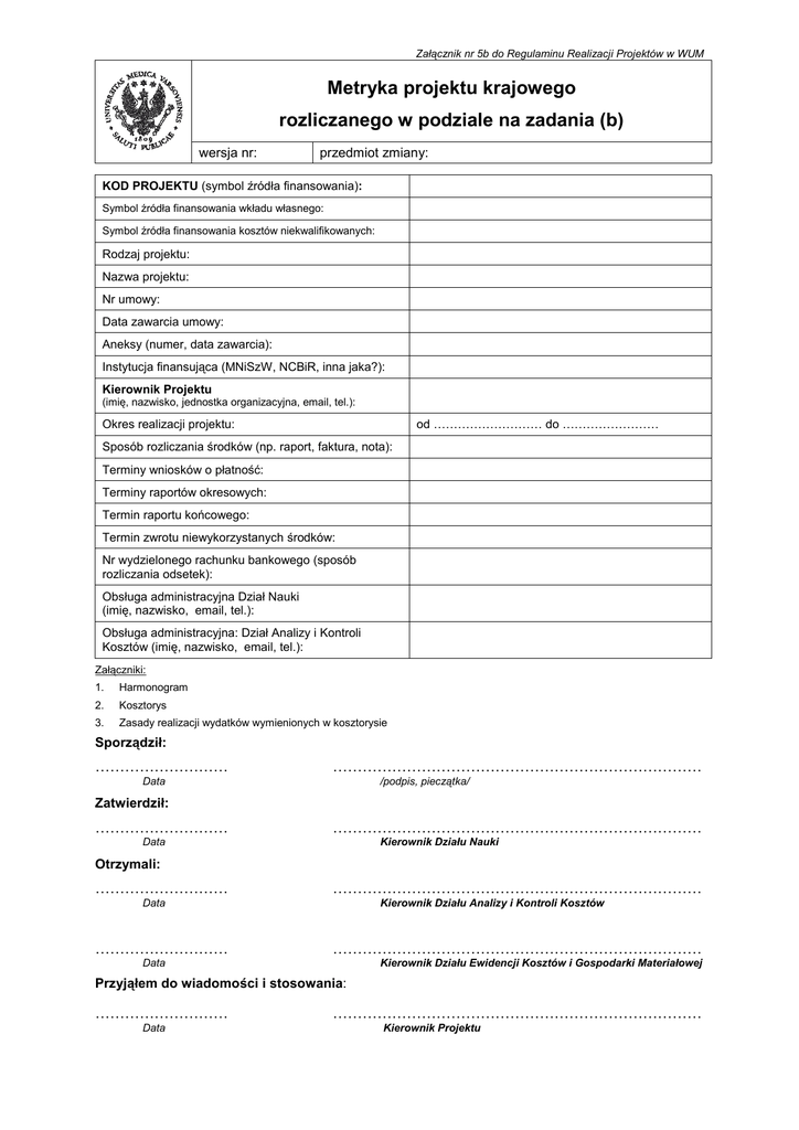 Załącznik nr 5b do Regulaminu Realizacji Projektów w WUM Metryka projektu krajowego rozliczanego w podziale na zadania (b) wersja nr: przedmiot zmiany: KOD PROJEKTU (symbol źródła finansowania): Symbol źródła finansowania wkładu własnego: Symbol źródła finansowania kosztów niekwalifikowanych: Rodzaj projektu: Nazwa projektu: Nr umowy: Data zawarcia umowy: Aneksy (numer, data zawarcia): Instytucja finansująca (MNiSzW, NCBiR, inna jaka?): Kierownik Projektu (imię, nazwisko, jednostka organizacyjna, email, tel.): Okres realizacji projektu: od ……………………… do …………………… Sposób rozliczania środków (np. raport, faktura, nota): Terminy wniosków o płatność: Terminy raportów okresowych: Termin raportu końcowego: Termin zwrotu niewykorzystanych środków: Nr wydzielonego rachunku bankowego (sposób rozliczania odsetek): Obsługa administracyjna Dział Nauki (imię, nazwisko, email, tel.): Obsługa administracyjna: Dział Analizy i Kontroli Kosztów (imię, nazwisko, email, tel.): Załączniki: 1. Harmonogram 2. Kosztorys 3. Zasady realizacji wydatków wymienionych w kosztorysie Sporządził: ……………………… ………………………………………………………………… Data /podpis, pieczątka/ Zatwierdził: ……………………… ………………………………………………………………… Data Kierownik Działu Nauki Otrzymali: ……………………… ………………………………………………………………… Data ……………………… Kierownik Działu Analizy i Kontroli Kosztów ………………………………………………………………… Data Kierownik Działu Ewidencji Kosztów i Gospodarki Materiałowej Przyjąłem do wiadomości i stosowania: ……………………… Data ………………………………………………………………… Kierownik Projektu Załącznik nr 5b do Regulaminu Realizacji Projektów w WUM Metryka projektu krajowego rozliczanego w podziale na zadania (b) wersja nr: przedmiot zmiany: Załącznik nr 1 KOD projektu: Kierownik projektu: HARMONOGRAM Nr zadania Nazwa zadania Realizacja Od Do 01 02 03 …. Razem Kwota Załącznik nr 5b do Regulaminu Realizacji Projektów w WUM Metryka projektu krajowego rozliczanego w podziale na zadania (b) wersja nr: przedmiot zmiany: Załącznik nr 2 KOD projektu: Kierownik projektu: KOSZTORYS PROJEKTU Poszczególne pozycje kosztorysu w cenach bieżących (w zł) Lp. 1 Planowane koszty w roku budżetowym Treść … Wynagrodzenia z pochodnymi 1.2 Inne koszty realizacji projektu (1.2.1+1.2.2) 1.2.2. … … Razem Koszty bezpośrednie (1.1. + 1.2.) 1.1. 1.2.1. … Aparatura Pozostałe koszty 2 Koszty pośrednie (*) 3 Koszty ogółem (1+2) (*) Limit procentowy oraz podstawa obliczania kosztów pośrednich: przykład: 20 % kosztów bezpośrednich (pozycja nr 1 Kosztorysu projektu) KOSZTORYS PROJEKTU W PODZIALE NA ZADANIA Nr zadania, okres realizacji, kwota w PLN Lp. 1 Rodzaj kosztów Zadanie 02 Zadanie 03 Zadanie 04 Od ……. Do …….. Od ……. Do …….. Od ……. Do …….. Od ……. Do …….. RAZEM Koszty bezpośrednie (1.1. + 1.2.) 1.1. Wynagrodzenia z pochodnymi 1.2 Inne koszty realizacji projektu (1.2.1+1.2.2) 1.2.1. Zadanie 01 Aparatura 1.2.2. Pozostałe koszty 2 Koszty pośrednie 3 Koszty ogółem (1+2) WYKAZ APARATURY NAUKOWO BADAWCZEJ PLANOWANEJ DO ZAKUPU LUB WYTWORZENIA Lp. Nazwa aparatury Nr zadania 1 2 … Razem Rok zakupu /kwota … … … … Razem Załącznik nr 5b do Regulaminu Realizacji Projektów w WUM Metryka projektu krajowego rozliczanego w podziale na zadania (b) wersja nr: przedmiot zmiany: Załącznik nr 3 KOD projektu: Kierownik projektu: ZASADY REALIZACJI WYDATKÓW WYMIENIONYCH W KOSZTORYSIE W dokumentach uruchamiających wydatkowanie środków (wnioski o podpisanie umowy cywilnoprawnej, umowy cywilno-prawne, wnioski o wszczęcie postępowania w sprawie zakupu usług i towarów, wnioski dotyczące wyjazdów zagranicznych) w ramach projektów rozliczanych zadaniowo (projekty rozwojowe itp.) należy wskazać numer zadania, w ramach którego realizowany będzie dany koszt. 1) Wynagrodzenia Umowy zlecenia i umowy o dzieło należy przekazywać do Działu Nauki przed terminem rozpoczęcia ich realizacji. Rachunki do umów należy składać w Dziale Nauki w terminie do 7 dni od zakończenia ich realizacji, ale nie później niż: − 10 dni do zakończenia roku kalendarzowego − 30 dni przed terminem złożenia raportów okresowych i 30 dni przed zakończeniem okresu realizacji umowy. 2) Aparatura, materiały, usługi Zakupów należy dokonywać zgodnie z procedurami obowiązującymi w Uczelni. Wnioski powinny być składane w terminach umożliwiających ich realizację zgodnie z procedurami ustawy o zamówieniach publicznych. 3) Delegacje krajowe i zagraniczne (kongresy, konferencje) Wnioski o zgodę na wyjazd należy składać co najmniej na 30 dni przed planowanym wyjazdem do: − Dziekanatu: delegacje krajowe nauczycieli akademickich, pracowników inżynieryjno-technicznych i naukowo-technicznych oraz wyjazdy osób niebędących pracownikami Uczelni (z wyłączeniem studentów i doktorantów); − Sekretariatu Organizacji Studenckich: wyjazdy studentów i doktorantów; − Działu Personalnego: delegacje krajowe pracowników administracji i obsługi, pracowników bibliotecznych i informacji naukowej; − Działu Współpracy z Zagranicą – delegacje zagraniczne. Rozliczenia delegacji krajowych i zagranicznych należy dokonać do 7 dni po zakończeniu wyjazdu służbowego. Do rozliczenia delegacji winny być dołączone faktury i rachunki dokumentujące poniesione koszty, w tym koszty przejazdów. Wniosek o wskazanie jako środka transportu samochodu osobowego powinien być uzasadniony ekonomicznie. 4) Dokumentowanie wydatków Wszelkie dokumenty będące podstawą rozliczenia poniesionych kosztów winny być niezwłocznie przekazywane do Kwestury, 
