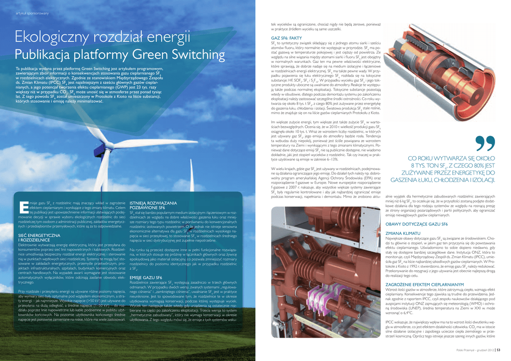 artykuł sponsorowany Ekologiczny rozdział energii Publikacja platformy Green Switching ta publikacja wydana przez platformę green switching jest artykułem programowym, zawierającym zbiór informacji o konsekwencjach stosowania gazu cieplarnianego sF6 w rozdzielnicach elektrycznych. zgodnie ze stanowiskiem międzyrządowego zespołu ds. zmian Klimatu (ipcc) sF6 jest najsilniejszym z sześciu głównych gazów cieplarnianych, a jego potencjał tworzenia efektu cieplarnianego (gWp) jest 23 tys. razy większy niż w przypadku co2. sF6 może unosić się w atmosferze przez ponad tysiąc lat. z tego powodu sF6 został umieszczony w protokole z Kioto na liście substancji, których stosowanie i emisję należy minimalizować. tek wycieków są ograniczone, chociaż nigdy nie będą zerowe, ponieważ w praktyce źródłem wycieku są same uszczelki. gaz sF6: FaKty SF6 to syntetyczny związek składający się z jednego atomu siarki i sześciu atomów fluoru, który normalnie nie występuje w przyrodzie. SF6 ma postać gazową w temperaturze pokojowej i jest cięższy od powietrza. Ze względu na silne wiązania między atomami siarki i fluoru SF6 jest obojętny w normalnych warunkach. Gaz ten ma pewne właściwości elektryczne, które sprawiają, że dobrze nadaje się na medium izolacyjne i łączeniowe w rozdzielnicach energii elektrycznej. SF6 ma także pewne wady. W przypadku pojawienia się łuku elektrycznego SF6 rozkłada się na toksyczne substancje: HF, SOF2, SF4 i S2F10. W przypadku wycieku gaz SF6 i jego toksyczne produkty uboczne są uwalniane do atmosfery. Reakcje te występują także podczas normalnej eksploatacji. Toksyczne substancje pozostają wtedy w obudowie, dlatego podczas demontażu systemu po zakończeniu eksploatacji należy zastosować szczególne środki ostrożności. Co roku wytwarza się około 8 tys. t SF6, z czego 80% jest zużywane przez energetykę do gaszenia łuku, chłodzenia i izolacji. Światowa produkcja SF6 stale rośnie, mimo że znajduje się on na liście gazów cieplarnianych Protokołu z Kioto. Im większe zużycie energii, tym większe jest także zużycie SF6 w wartościach bezwzględnych. Ocenia się, że w 2010 r. wielkość produkcji gazu SF6 osiągnęła około 10 tys. t. Wraz ze wzrostem liczby rozdzielnic, w których jest używany gaz SF6, jego emisja do atmosfery będzie rosła. Tendencja ta wzbudza duży niepokój, ponieważ jest ściśle powiązana ze wzrostem temperatury na Ziemi i wynikającymi z tego zmianami klimatycznymi. Ponieważ dane dotyczące emisji SF6 nie są publicznie dostępne, nie wiadomo dokładnie, jaki jest stopień wycieków z rozdzielnic. Tak czy inaczej w praktyce uzyskiwane są emisje w zakresie 6–13%. E misje gazu SF6 z rozdzielnic mają znaczący wkład w zagrożenie efektem cieplarnianym i wynikające z tego zmiany klimatu. Celem tej publikacji jest upowszechnienie informacji ułatwiających podejmowanie decyzji w sprawie wyboru ekologicznych rozdzielnic do sieci rozdzielczej tym osobom z administracji publicznej, zakładów energetycznych i przedsiębiorstw przemysłowych, które są za to odpowiedzialne. sieć energetyczna i rozdzielnice Elektrownie wytwarzają energię elektryczną, która jest przesyłana do konsumentów poprzez sieć linii napowietrznych i kablowych. Rozdzielnice umożliwiają bezpieczny rozdział energii elektrycznej i sterowanie nią w punktach węzłowych sieci rozdzielczej. Systemy te mogą być stosowane w zakładach energetycznych, przemyśle przetwórczym, projektach infrastrukturalnych, szpitalach, budynkach komercyjnych oraz centrach handlowych. Na wypadek awarii wymagane jest stosowanie automatycznych wyłączników, które odcinają zasilanie obwodu elektrycznego. Przy rozdziale i przesyłaniu energii są używane różne poziomy napięcia, aby wymiary sieci były optymalne pod względem ekonomicznym, a straty energii – jak najmniejsze. Wysokie napięcie (>50 kV) jest używane do przesyłania na dużą odległość, a średnie napięcie (1–50 kV) – do rozdziału poprzez linie napowietrzne lub kable podziemne w pobliżu użytkowników końcowych. Na poziomie użytkownika końcowego średnie napięcie jest ponownie zamieniane na niskie, które ma wiele zastosowań. W wielu krajach, gdzie gaz SF6 jest używany w rozdzielnicach, podejmowane są działania ograniczające jego emisję. Do działań tych należy np. dobrowolny program amerykańskiej Agencji Ochrony Środowiska (EPA) oraz rozporządzenie f-gazowe w Europie. Nowe europejskie rozporządzenie f-gazowe z 2007 r. nakazuje, aby wszystkie większe systemy zawierające SF6 były regularnie kontrolowane i aby jak najbardziej ograniczać emisje podczas konserwacji, napełniania i demontażu. Mimo że zrobiono aktu- istniejĄ rozWiĄzania pozbaWione sF6 SF6 stał się bardzo popularnym medium izolacyjnym i łączeniowym w rozdzielnicach ze względu na dobre właściwości gaszenia łuku oraz mniejsze rozmiary tego typu rozdzielnic w porównaniu do konwencjonalnych rozdzielnic izolowanych powietrzem. O ile jednak nie istnieje sensowna ekonomicznie alternatywa dla gazu SF6 w rozdzielnicach wysokiego napięcia w sieci przesyłowej, to stosowanie SF6 w rozdzielnicach średniego napięcia w sieci dystrybucyjnej jest zupełnie niepotrzebne. Na rynku są przecież dostępne inne w pełni funkcjonalne rozwiązania, w których stosuje się próżnię w łącznikach głównych oraz żywicę epoksydową jako materiał izolacyjny, co pozwala zmniejszyć rozmiary rozdzielnicy do poziomu identycznego jak w przypadku rozdzielnic z SF6. emisje gazU sF6 Rozdzielnice zawierające SF6 występują zasadniczo w trzech głównych odmianach. W przypadku dwóch wersji, zwanych systemami „regulowanego ciśnienia” i „zamkniętego ciśnienia”, uwalnianie SF6 jest w praktyce nieuniknione. Jest to spowodowane tym, że rozdzielnice te w okresie użytkowania wymagają konserwacji, podczas której występuje wyciek. Wyciek ten następuje takż