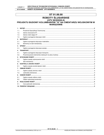 CZĘŚĆ V ST 01.06.00 SPECYFIKACJE TECHNICZNE WYKONANIA I ODBIORU ROBÓT PROJEKT BUDOWY ZESPOŁU KOLUMBARIÓW „Q” NA CMENTARZU WOJSKOWYM W WARSZAWIE ROBOTY ŚLUSARSKIE CPV 98395000-8 ST 01.06.00 ROBOTY ŚLUSARSKIE (CPV 98395000-8) PROJEKTU BUDOWY KOLUMBARIÓW "Q" NA CMENTARZU WOJSKOWYM W WARSZAWIE 1. WSTĘP ............................................................................................................................................................................. 2 1.1. Przedmiot Specyfikacji Technicznej .......................................................................................................................... 2 1.2. Zakres stosowania ST ............................................................................................................................................... 2 1.3. Zakres robót objęty ST .............................................................................................................................................. 2 1.4. 2. Ogólne wymagania dotyczące robót .......................................................................................................................... 2 MATERIAŁY ..................................................................................................................................................................... 2 2.1. Ogólne wymagania dotyczące materiałów ................................................................................................................. 2 2.2. Elementy ze stali nierdzewnej ................................................................................................................................... 2 3. 3.1. 4. 4.1. 4.2. 5. SPRZĘT ............................................................................................................................................................................ 2 Ogólne wymagania dotyczące sprzętu ...................................................................................................................... 2 TRANSPORT. ................................................................................................................................................................... 2 Ogólne wymagania dotyczące transportu .................................................................................................................. 2 Przechowywanie elementów stalowych na placu budowy ......................................................................................... 2 WYKONANIE ROBÓT. ..................................................................................................................................................... 3 5.1. Ogólne zasady wykonywania robót ........................................................................................................................... 3 5.2. Stal nierdzewna ........................................................................................................................................................ 3 6. 6.1. 7. 7.1. 7.2. 8. KONTROLA JAKOŚCI ROBÓT ....................................................................................................................................... 3 Ogólne zasady kontroli jakości robót ......................................................................................................................... 3 OBMIAR ROBÓT .............................................................................................................................................................. 5 Ogólne zasady obmiaru robót ................................................................................................................................... 5 Jednostka obmiarowa ............................................................................................................................................... 5 ODBIÓR ROBÓT .............................................................................................................................................................. 5 8.1. Ogólne zasady odbioru robót .................................................................................................................................... 5 8.2. Odbiór wykonanej konstrukcji .................................................................................................................................... 5 9. 9.1. ROZLICZANIE ROBÓT .................................................................................................................................................... 5 Cena jednostki obmiarowej ....................................................................................................................................... 5 10. PRZEPISY ZWIĄZANE ..................................................................................................................................................... 5 ST 01.06.00/ 1 Autorska Pracownia Architektury CAD sp.z o.o. WSZELKIE PRAWA AUTORSKIE ZASTRZEŻONE CZĘŚĆ V ST 01.06.00 1. 1.1. SPECYFIKACJE TECHNICZNE WYKONANIA I ODBIORU ROBÓT PROJEKT BUDOWY ZESPOŁU KOLUMBARIÓW „Q” NA CMENTARZU WOJSKOWYM W WARSZAWIE ROBOTY ŚLUSARSKIE CPV 98395000-8 WSTĘP Przedmiot Specyfikacji Technicznej Przedmiotem niniejszej szczegółowej specyfikacji technicznej (ST) są wymagania dotyczące wykonania i odbioru robót związanych z produkcją i montażem elementów stalowych. 1.2. Zakres stosowania ST Specyfikacja Techniczna zawiera informacje oraz wymagania dotyczące wykonania i odbioru robót, które zostaną zrealizowane w ramach zadania – BUDOWY PROJEKT BUDOWY ZESPOŁU KOLUMBARIÓW „Q” NA CMENTARZU WOJSKOWYM W WARSZAWIE – w zakresie wykonania i montażu elementów stalowych. 1.3. Zakres robót objęty ST Ustalenia zawarte w niniejszej Specyfikacji mają zastosowanie przy montażu elementów stalowych w budowli kolumbariów oraz w elementach zagospodarowania terenu. 1.4. Ogólne wymagania dotyczące robót Ogól