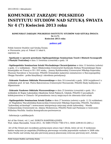 2013-09-02 / Aktualności KOMUNIKAT ZARZĄDU POLSKIEGO INSTYTUTU STUDIÓW NAD SZTUKĄ ŚWIATA Nr 4 (7) Kwiecień 2013 roku KOMUNIKAT ZARZĄDU POLSKIEGO INSTYTUTU STUDIÓW NAD SZTUKĄ ŚWIATA Nr 4 (7) Kwiecień 2013 roku pobierz pdf Polski Instytut Studiów nad Sztuką Świata w Warszawie, przy ul. Foksal 11 lokal 6, zaprasza na: - Spotkanie w sprawie powołania Ogólnopolskiego Seminarium Teorii i Historii Scenografii i Plastyki Teatralnej w dniu 11 kwietnia (czwartek) o godz. 18 - Ogólnopolskie Seminarium Sztuki Wschodniego Chrześcijaństwa w dniu 13 kwietnia (sobota) o godz. 11 z wykładami: - Marii Ołdakowskiej (Uniwersytet Kardynała Stefana Wyszyńskiego) Ikony bizantyjskie we Francji w XV i XVI wieku; - Joanny Rydzkowskiej (Uniwersytet Mikołaja Kopernika; Muzeum Narodowe w Szczecinie; PISnSŚ) Ormiańskie malarstwo miniaturowe w Rzeczypospolitej Obojga Narodów - próba klasyfikacji i określenia periodyzacji. - Zebranie Naukowe Oddziału Warszawskiego w dniu 18 (czwartek) o godz. 1830 (wyjątkowo!) z wykładem prof. dr hab. Piotra Balcerowicza (Uniwersytet Warszawski; PISnSŚ) Ślady buddyzmu w Afganistanie - Zebranie Naukowe Oddziału Warszawskiego w dniu 25 kwietnia (czwartek) o godz. 18 z wykładem dr Bogny Łakomskiej (Akademia Sztuk Pięknych, Gdańsk; PISnSŚ) O początkach kolekcjonerstwa w Chinach: Od gromadzenia rzeczy magicznych do zbierania dzieł sztuki - Ogólnopolskie Seminarium Sztuki Żydów w dniu 27 kwietnia (sobota) o godz. 11 Zz wykładami: - dr Magdaleny Macudzińskiej-Kamczyckiej (Uniwersytet Mikołaja Kopernika; PISnSŚ), Narodziny "żydowskiej archeologii" i nowoczesna interpretacja antycznej sztuki żydowskiej; - Moniki Czekanowskiej (Uniwersytet im. Adama Mickiewicza; PISnSŚ) Pieśń nad Pieśniami w twórczości Wilhelma Wachtla: Analiza ikonograficzno-porównawcza - Informacja o publikacjach: Art of the Orient, vol. I, red. DOROTA KAMIŃSKA-JONES, Wyd. Adam Marszałek, Toruń 2012 ; Nr ISBN 978-83-7780-570-1; ISSN 2299-811X (260 s.) Art of the Orient jest rocznikiem poświęconym sztuce Azji I Afryki, które od vol. II wydawane będzie wyłącznie po angielsku.[Publikację pierwszego rocznika poprzedziło wydanie w 2008 roku tomu Studia nad sztuką Azji jako pierwszej pozycji planowanej wówczas pierwszej serii „Sztuka Polski Instytut Studiów nad Sztuką Świata 1 Orientu”.] Art of the Orient zamierza publikować studia polskich i zagranicznych badaczy, a także teksty przedstawione na zorganizowanych przez Instytut konferencjach i seminariach. Zawartość tomów będzie podzielona zostanie na dwie części „Sztuka dawna” oraz „Sztuka nowoczesna”. Niekiedy jednak tom może mieć charakter monografii z jednorodnym zespołem tekstów. Jerzy Malinowski, Dorota Kamińska-Jones Spis treści: Jerzy Malinowski, From the editor Dorota Kamińska-Jones, Przedmowa Katarzyna Kleiber, Problem wpływu – jak badać podobieństwa wizualne między sztuką Zachodu i Wschodu? / The Problem of Influence – How to Assess the Visual Similarities Between the Art of the West and East? Bogna Łakomska, The origins of collecting in China. Underground jade treasures as a reflection of ancient collecting / Początki kolekcjonerstwa w Chinach. Zgromadzone pod ziemią żady jako odzwierciedlenie starożytnego kolekcjonerstwa Ryszarda Maria Bulas, Tkanina z Maszanu (Chiny, V–III w. p.n.e.) a celtycki system Ornamentalny / Ireland and China. Textile from Mashan (fifth to third century BC, China) and the Celtic Repertoire of Ornamentation Joanna Kucharzewska, Architektoniczny eksperyment u podnóża Chińskiego Muru/ Architectural Experiment at the Foot of the Great Wall of China Katarzyna Paczuska, Shini-e, japońska forma upamiętnienia wybitnych artystów / Shini-e, the Japanese Way of Commemorating Great Artists Joanna Zaremba-Penk, Baśnie i bajki w japońskich komiksach / Fables and Fairy Tales in Pop Culture Taken from the Example of Japanese Comics Dorota Kamińska-Jones, Tradycja u progu nowoczesności. Kobiety w malarstwie Kalighat / Tradition at the Threshold of Modernity. Women in Kalighat Painting Elżbieta Walter, Rabindranatah Tagore – poeta czy malarz? / Rabindranatah Tagore – Poet or Painter? Magdalena Ginter-Frołow, Księga Papugi Nechszebiego ze zbiorów Biblioteki Uniwersytetu Wrocławskiego / Tuti-Nameh – Tales of a Parrot by Nahsabi from the Collection of the University Library in Wrocław Aleksandra Wiktoria Martines, Przedmioty kultu lamaiskiego stosowane w obrzędzie Dugżuuba / Ritual Lamaist Items Used in the Dugzhuuba Rite by the Buddhists of Buryatia Krzysztof Morawski, O roli krisów w kulturze Indonezji i teoriach dotyczących ich powstania / On the Role of Krises in Indonesian Culture and Theories of Their Beginnings Karolina Krzywicka, Tradycyjna ceramika uzbecka i tadżycka ze zbiorów Muzeum Azji i Pacyfiku w Warszawie / Traditional Uzbek and Tajik Ceramics from the Collection of the Asia and Pacific Museum in Warsaw Polski Instytut Studiów nad Sztuką Świata 2 Karolina Mroziewicz, Ornitomorficzne miniatury marginesowe ormiańskich Ewangeliarzy przechowywanych w Bibliotece Narodowej w Warszawie / The Ornithomorphic System of Marginal Illuminations of Armenian Gospel Books from the Polish National Library in Warsaw Ewa Marcinkowska, Świadectwa obecności artystycznej Imperium Osmańskiego na Węgrzech / Evidence of the Artistic Presence of the Ottoman Empire in Hungary - Informacja o konferencjach: POLISH INSTITUTE OF WORLD ART STUDIES, NICOLAUS COPERNICUS UNIVERSITY THE DEPARTMENT OF HISTORY OF MODERN ART, FACULTY OF FINE ARTS ul. Sienkiewicza 30/32, 87-100 Toruń; tel. 48-566113847; [email protected]; www.zhsn.umk call for participation in THE 5th CONFERENCE OF MODERN ART IN TORUŃ on Art of The United Kingdom of Great Britain and Northern Ireland & Republic of Ireland in 20th - 21st Centuries and Polish-British & Irish Artistic Relations at The Centre of Contemporary Art Torun, Wały gen. Sikorskiego 13 October 9th 