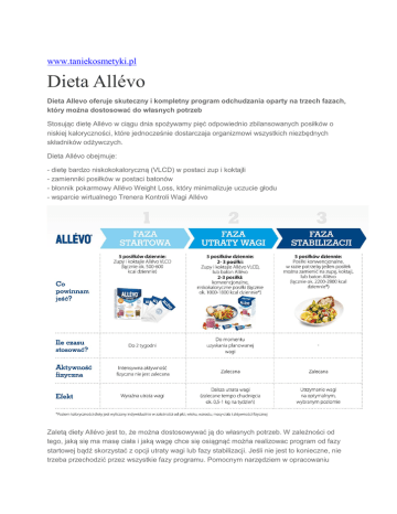 www.taniekosmetyki.pl Dieta Allévo Dieta Allevo oferuje skuteczny i kompletny program odchudzania oparty na trzech fazach, który można dostosować do własnych potrzeb Stosując dietę Allévo w ciągu dnia spożywamy pięć odpowiednio zbilansowanych posiłków o niskiej kaloryczności, które jednocześnie dostarczaja organizmowi wszystkich niezbędnych składników odżywczych. Dieta Allévo obejmuje: - dietę bardzo niskokokaloryczną (VLCD) w postaci zup i koktajli - zamienniki posiłków w postaci batonów - błonnik pokarmowy Allévo Weight Loss, który minimalizuje uczucie głodu - wsparcie wirtualnego Trenera Kontroli Wagi Allévo Zaletą diety Allévo jest to, że można dostosowywać ją do własnych potrzeb. W zależności od tego, jaką się ma masę ciała i jaką wagę chce się osiągnąć możńa realizowac program od fazy startowej bądź skorzystać z opcji utraty wagi lub fazy stabilizacji. Jeśli nie jest to konieczne, nie trzeba przechodzić przez wszystkie fazy programu. Pomocnym narzędziem w opracowaniu zindywidualizowanego planu odchudzania jest bezpłatna aplikacja wirtualnego Trenera Kontroli Wagi Allévo. Metoda Allévo to nowoczesny program kontroli wagi, oferujący indywidualny plan działania, niskokaloryczne posiłki o zbilansowanym składzie (zupy i koktajle), zamienniki posiłków (batony) oraz produkty uzupełniające (Allévo Weight Loss błonnik pokarmowy), a także bezpłatną aplikację wirtualnego Trenera Kontroli Wagi, zapewniającą wsparcie w procesie odchudzania. 1Faza Startowa Trwa maksymalnie 2 tygodnie. W tym okresie spożywamy 5 posiłków dziennie w postaci produktów Allévo z gamy VLCD (zupy, koktajle). 2Faza Utraty Wagi Trwa do momentu uzyskania optymalnej masy ciała – w tym okresie spożywamy w ciągu dnia 5 posiłków, z których część można zastąpić produktami Allévo VLCD bądź batonami Allévo (np. dwa posiłki Allévo, trzy niskokaloryczne posiłki konwencjonalne). 3Faza Stabilizacji Rozpoczyna się w momencie uzyskania optymalnej masy ciała i jej celem jest zachowanie idealnej sylwetki oraz uniknięcie efektu jo-jo. Na tym etapie komponujemy swoją dietę w oparciu o konwencjonalne posiłki, w razie potrzeby sięgając po produkty Allévo. Faza Startowa CEL: Wyraźna utrata masy ciała Faza Startowa polega na stosowaniu diety bardzo niskokalorycznej (VLCD, ang. very low calorie diet) przez maksymalnie dwa tygodnie. Dieta bardzo niskokaloryczna (VLCD) dostarcza mniej niż 800 kcal na dobę, a jednocześnie dostarcza organizmowi wszystkich niezbędnych składników odżywczych, takich jak witaminy i składniki mineralne, które pomagają nam zmniejszyć uczucie zmęczenie i znużenia. Do kategorii diety bardzo niskokalorycznej zaliczamy zupy i koktajle Allévo. Jak stosować? Podczas Fazy Startowej należy zastąpić wszystkie posiłki zupami i koktajlami Allévo. Posiłki powinny być spożywane pięć razy dziennie w regularnych odstępach czasu (np. o godz. 8:00, 11:00, 14:00, 17:00, 20:00). Posiłki Allévo są odpowiednio zbilansowane i w zależności od kombinacji smaków dostarczają ok. 550-600 kcal. W Fazie Startowej wskazana jest niewielka aktywność fizyczna, dostosowana do indywidualnych możliwości, lub codzienna lekka gimnastyka. Nie zalecane są forsowne ćwiczenia, zbyt obciążające organizm. Faza Startowa jest szczególnie polecana osobom z nadwagą lub otyłością i tym, które bezskutecznie próbowały zrzucić zbędne kilogramy. Czym jest dieta bardzo niskokaloryczna (VLCD)? Dieta bardzo niskakokaloryczna (VLCD, ang. very low calorie diet) to dieta, która dostarcza poniżej 800 kcal na dobę, jednocześnie dostarczając wszystkich niezbędnych składników odżywczych organizmowi. Najczęściej ma postać płynną - posiłki są w formie zup lub koktajli. W ciągu 2 tygodni widzimy doskonałe rezultaty, które motywują do dalszego odchudzania. Dieta VLCD jest szczególnie polecana osobom z otyłością i takim, które bezskutecznie próbowały zrzucić zbędne kilogramy. Jak przejść z Fazy Startowej do Fazy Utratu Wagi? Po Fazie Startowej powinniśmy przejść do Fazy Utraty Wagi. Po dwóch tygodniach, podczas których spożywa się tylko zupy i koktajle Allévo, żołądek przyzwyczajony jest do mniejszych porcji. Należy więc wprowadzać klasyczne posiłki w małych porcjach, stopniowo zwiększając ich kaloryczność. Cały czas należy pamiętać o zasadzie pięciu regularnych posiłków. Dodatkowo polecane jest spożywanie dużej ilości warzyw zawierających sporą ilość wody, np. ogórków, kabaczków, dyni. Faza Utraty Wagi CEL: Dalsza utrata masy ciała Faza Utraty Wagi polecana jest dla osób, które zakończyły już Fazę Startową i dla tych, które mają do zrzucenia kilka kilogramów. W tym okresie powinniśmy spożywać pięć posiłków dziennie w regularnych odstępach czasu, w tym: 2-3 posiłki konwencjonalne oraz 2-3 posiłki Allévo (zupy, koktajle lub batony). Całkowity poziom kaloryczności spożywanych posiłków powinien być ustalony indywidualnie w zależności od płci, wieku, wyjściowej masy ciała i aktywności fizycznej. Z pomocą przychodzi tutaj aplikacja Trenera Kontroli Wagi, która na podstawie tych parametrów pomaga ustalić sugerowany poziom kaloryczności spożywanych posiłków. Zalecane tempo chudnięcia to około 0,5-1 kg tygodniowo. Aplikacja dostępna jest po zalogowaniu sie w zakładce "Moja strona". W Fazie Utraty Wagi zaleca się łączenie diety z regularną aktywnością fizyczną dostosowaną do własnych możliwości. Faza Stabilizacji CEL: Utrzymanie masy ciała na optymalnym poziomie Faza Stabilizacji następuje w momencie uzyskania optymalnej masy ciała i jej celem jest zachowanie idealnej sylwetki oraz uniknięcie efektu jo-jo. Aby nasz program odchudzania był skuteczny, należy przestrzegać wypracowanych na poprzednich etapach nawyków zdrowego stylu życia: jedzenia pięciu regularnych, zdrowych i niskokalorycznych posiłk