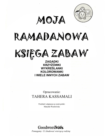 MOJA RAMADANOWA KSIEGA ZABAW ZAGADKI KRZYŻÓWKI WYKREŚLANKI KOLOROWANKI I WIELE INNYCH ZABAW Opracowanie: TAHERA KASSAMALI Przekład i adaptacja na rynek polski: Matylda Wasilewska Pomagamy Ci zbudować wierzącą rodzinę Adam wspina się na skałę 10. Święta ______ ul-___________ są obchodzone na zakończenie ramadanu. 9. _____________ to emigracja Proroka (pokój z nim) z Mekki do Medyny. Adam bawi się z kolegami. Chcą sprawdzić, który z nich najszybciej wdrapie się na górę. Zasada gry jest następująca: w miarę wspinania trzeba odpowiadać na pytania wyryte na skale. 8. Prorok (pokój z nim) powiedział, że ramadan przychodzi z _________ i ____________ od Allaha. 7. Wielu muzułmanów udaje się do __________ w ramadanowe noce. 6. Muzułmanie walczyli przeciwko ___________ z Mekki w bitwie Badr. Adam bardzo chce wygrać. Pomóż mu jak najszybciej dostać się na szczyt wypełniając luki. 5. Większość muzułmanów przełamuje post spożywając ___________ . 4. __________________ to posiłek na zakończenie dnia postu. 3. Sura al-___________ mówi nam, że ta szczególna noc jest lepsza niż tysiąc miesięcy. 2. __________________________ to najszczególniejsza noc ramadanu. 1. Podczas ramadanu muzułmanie recytują bardzo dużo ___________. 1 NÓW KSIĘŻYCA Muzułmanie posługują się KALENDARZEM KSIĘŻYCOWYM. To znaczy takim, który opiera się na zmianach księżyca i w którym początek i liczba dni danego miesiąca jest uzależniona od księżyca. Allah mówi w Koranie: Oni będą ciebie pytać o fazy księżyca w nowiu. Powiedz: "To są oznaczenia czasu dla ludzi i dla pielgrzymki." [Koran, 2:189] Obecnie, w przeciwieństwie do muzułmanów, większość ludzi na świecie posługuje się KALENDARZEM SOLARNYM - GREGORIAŃSKIM . Podstawą KALENDARZA SOLARNEGO jest Słońce, a początek i liczba dni danego miesiąca jest z góry ustalona. Odpowiedz na następujące pytania dotyczące muzułmańskiego KALENDARZA KSIĘŻYCOWEGO: 1. ___________________ jest pierwszym miesiącem muzułmańskiego kalendarza. 2. Miesiąc księżycowy twra ______ lub ______ dni. 3. Pełnia księżyca przypada mniej więcej w ______________ miesiąca księżycowego. 4. Rok księżycowy jest o ______ dni krótszy od roku solarnego. 5. Muzułmański kalendarz księżycowy datuje się od ____________ Proroka (pokój z nim). Co by się stało gdyby muzułmanie Pora na myślenie!! przestrzegali zamiast kalendarza księżycowego? solarnego Jakby wpłyneło na ich post ramadanowy? 2 to Witamy miesiac Koranu Muzułmanie na całym świecie witają ramadan. Niesie on ze sobą radość i wiele błogosławieństw. Pokoloruj poniższy baner i uzupełnij list. Drogi ramadanie, Bardzo się cieszę, że Cię widzę. Lubię Cię, ponieważ Pozdrawiam, 3 Du’a na iftar Wypowiedz następującą suplikację w chwili przełamywania postu. Czas iftaru to także specjalna pora na szukanie przebaczenia grzechów i proszenia Allaha o spełnienie naszych potrzeb. ب الظَّ َمأ َ ذَ َه Dhahabaz-zamau Odeszło pragnienie, ِ َّوابْ تَ ل ت الْعروق َ łabtallatil-uruuqu żyły zostały nasycone ِت األَ ْجر إ اء الل ش ن ْ َ َ ََوثَب َ ła thabatal-adżru insha’a-llah i nagroda jest już zapewniona, jeśli Allah zechce. 4 Łowienie ryb Połącz pytania i odpowiedzi. z Koranu Inna nazwa Koranu oznaczająca światło Miłosierny jedno z imion Boga Jedna z 30 części Koranu Pierwsza Drugi z 5 filarów islamu 97 sura sura z Koranu Pomaga Arabskie słówko na post powstrzymać się od grzechu modlitwa Rahim takła dżuz sałm 5 KRZYŻÓWKA Poziomo: 4. Allah mówi w Koranie, że życie na tym świecie nie jest niczym innym jak tylko sportem i ___________. 5. Twoje ciało zostało stworzone w cudowny sposób. Dłoń może przybierać wiele różnych form. Kiedy ludzie się złoszczą lub denerwują zaciskają dłonie w __________. 6. _________ to forma czci, która uczy nas samokontroli i pomaga zrozumieć najuboższych. 7. Szatan uważał się za lepszego od człowieka, ponieważ Allah stworzył go z ognia, a czowieka z ___________. Pionowo: 1. Sura An-Nas jest __________ surą w Koranie. 2. Prorok (pokój z nim) pochodził z __________ Banu Haszim. 3. Aby móc w pełni docenić Allaha, zrób ___________ rzeczy, które od Niego dostałeś. 5. Bóg obiecał, że jeśli będziemy go ____________, odpowie nam. W ramadanie ___________ w ciągu dnia i _____________ nocą. 6 Billboard Hamzy Hamza jest pracownikiem rządowym w jedym z krajów muzułmańskich. Kazano mu powiesić wielki billboard w jego dzielnicy, aby rozpowszechnić informacje o nadchodzącym ramadanie. Zdaje się jednak, że pominął niektóre słowa... Wybierz odpowiednie wyrazy z listy poniżej i wstaw je we właściwe miejsca na billboardzie. daktyle za dnia lejlatul qadr księżyc dżuz Zbliża się ramadan. Jeśli Id meczety będzie widoczny we wtorkową noc, środa będzie pierwszym dniem postu. Restauracje będą nieczynne , a będą otware przez całą noc. Modlitwa maghrib będzie odprawiana we wszystkich o zachodzie słońca. meczetach będą rozdawane wszystkim tym, którzy chcą przerwać post zanim dotrą do domu. Jeden z Koranu będzie recytowany w meczetach każdej nocy. Szkoły i biura będą zamknięte w nieparzyste dni w ciągu ostatnich 10 dni ramadanu, aby umożliwić wszystkim szukanie w nieparzyste noce. Szczegóły na temat obchodów zostaną ogłoszone później. .. ŻYCZYMY WSZYSTKIM SZCZĘŚLIWEGO I BŁOGOSŁAWIONEGO RAMADANU! 7 Meczet Meczet to bardzo szczególne miejsce. To miejsce, w którym ludzie wspominają i czczą Allaha. Słowo masdżid – meczet w języku arabskim – oznacza miejsce do składania pokłonów (sudżudów). Podczas ramadanu wielu muzułmanów udaje się do meczetów co noc. Modlą się tam i proszą Boga o przebaczenie w tym wyjątkowym czasie. Wysiłki wierzących w ramadanowe noce są wzmożone, ponieważ Allah obiecał wielokrotnie pomnożyć n