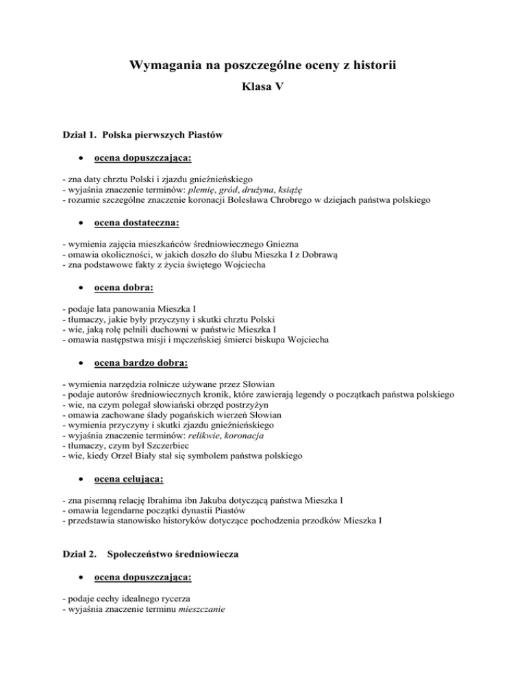 Wymagania na poszczególne oceny z historii Klasa V Dział 1. Polska pierwszych Piastów ocena dopuszczająca: - zna daty chrztu Polski i zjazdu gnieźnieńskiego - wyjaśnia znaczenie terminów: plemię, gród, drużyna, książę - rozumie szczególne znaczenie koronacji Bolesława Chrobrego w dziejach państwa polskiego ocena dostateczna: - wymienia zajęcia mieszkańców średniowiecznego Gniezna - omawia okoliczności, w jakich doszło do ślubu Mieszka I z Dobrawą - zna podstawowe fakty z życia świętego Wojciecha ocena dobra: - podaje lata panowania Mieszka I - tłumaczy, jakie były przyczyny i skutki chrztu Polski - wie, jaką rolę pełnili duchowni w państwie Mieszka I - omawia następstwa misji i męczeńskiej śmierci biskupa Wojciecha ocena bardzo dobra: - wymienia narzędzia rolnicze używane przez Słowian - podaje autorów średniowiecznych kronik, które zawierają legendy o początkach państwa polskiego - wie, na czym polegał słowiański obrzęd postrzyżyn - omawia zachowane ślady pogańskich wierzeń Słowian - wymienia przyczyny i skutki zjazdu gnieźnieńskiego - wyjaśnia znaczenie terminów: relikwie, koronacja - tłumaczy, czym był Szczerbiec - wie, kiedy Orzeł Biały stał się symbolem państwa polskiego ocena celująca: - zna pisemną relację Ibrahima ibn Jakuba dotyczącą państwa Mieszka I - omawia legendarne początki dynastii Piastów - przedstawia stanowisko historyków dotyczące pochodzenia przodków Mieszka I Dział 2. Społeczeństwo średniowiecza ocena dopuszczająca: - podaje cechy idealnego rycerza - wyjaśnia znaczenie terminu mieszczanie ocena dostateczna: - wyjaśnia znaczenie terminów: klasztor, post, skryptorium, kopista, kupiec, rzemieślnik, cech, burmistrz, samorząd miejski, rynek - wie, jak duży wpływ na życie ludzi w średniowieczu miała religia - wymienia zabudowania tworzące średniowieczny klasztor - rozumie, jaką funkcję pełniły zamki w średniowieczu - wymienia główne elementy rycerskiego wyposażenia - podaje przykłady zawodów rzemieślniczych wykonywanych w średniowieczu - wymienia grupy ludności żyjące w średniowiecznym mieście - wymienia prace polowe wykonywane w epoce średniowiecza ocena dobra: - omawia przejawy średniowiecznej pobożności - wie, jaką drogę musiał przejść chłopiec, aby zostać rycerzem - wyjaśnia, czym były turnieje rycerskie - wie, jaką rolę odgrywali w średniowiecznym mieście burmistrz i członkowie ławy miejskiej - tłumaczy, jaki wpływ na poprawę wydajności pracy chłopów w średniowieczu miało zastosowanie młyna i pługa - wie, jak odżywiali się mieszkańcy średniowiecznej wsi ocena bardzo dobra: - tłumaczy, na czym polegała praca zakonników w średniowiecznym skryptorium - wie, skąd wzięło się powiedzenie polegać na kimś jak na Zawiszy i co ono oznacza - wymienia elementy kultury rycerskiej i dworskiej - podaje przykłady miejsc w Polsce, w których znajdują się obecnie zamki wzniesione w średniowieczu bądź ich ruiny - rozumie pochodzenie nazw współczesnych ulic, na przykład: Szewska, Garncarska, Tkacka - wie, czym była lokacja - wyjaśnia znaczenie terminów: sołtys, pług, trójpolówka ocena celująca: - zna rolę zakonów w czasach współczesnych - wie, jakie funkcje pełnią zamki w dzisiejszych czasach - przedstawia sposoby spędzania wolnego czasu przez mieszkańców wsi w średniowieczu Dział 3. Polska i Krzyżacy ocena dopuszczająca: - zna datę bitwy pod Grunwaldem ocena dostateczna: - wymienia najważniejsze osiągnięcia Kazimierza Wielkiego, w tym założenie Akademii Krakowskiej - tłumaczy, w jakich okolicznościach doszło do ślubu Jadwigi i Jagiełły ocena dobra: - opowiada, kim był Mikołaj Wierzynek - podaje przyczyny i skutki wielkiej wojny z zakonem krzyżackim ocena bardzo dobra - wyjaśnia znaczenie terminu unia - wyjaśnia znaczenie terminów: Prusy, zakon krzyżacki, wielki mistrz - wie, dlaczego Konrad Mazowiecki sprowadził Krzyżaków do Polski - dostrzega negatywne skutki rozbicia dzielnicowego celująca: - tłumaczy, w jakich okolicznościach powstał zakon krzyżacki - wymienia przyczyny konfliktu polsko-krzyżackiego - omawia skutki sprowadzenia Krzyżaków do Polski - wie, jakie skutki przyniosła Polsce utrata Pomorza Gdańskiego - wymienia nazwy obszarów współczesnej Polski, na których można znaleźć ślady obecności Krzyżaków - wie, kim byli templariusze i zna opowieść o ich legendarnym skarbie Dział 4. Europejczycy odkrywają świat ocena dopuszczająca: - rozumie przełomowe znaczenie roku 1492 w dziejach Europy i świata - wie, jaką rolę w okresie wielkich odkryć geograficznych odegrał Krzysztof Kolumb - tłumaczy, na czym polegało przełomowe odkrycie Mikołaja Kopernika ocena dostateczna: - podaje przyczyny odkryć geograficznych w XV i XVI stuleciu - wyjaśnia znaczenie terminów: karawela, Nowy Świat, Indianie, broń palna, konkwistador ocena dobra: - zna najważniejsze dokonania Bartłomieja Diaza, Vasco da Gamy i Ferdynanda Magellana - wie, dlaczego Leonarda da Vinci zalicza się do czołowych postaci epoki renesansu - wyjaśnia znaczenie terminów renesans i humanizm ocena bardzo dobra: - wymienia skutki odkryć geograficznych dla mieszkańców Europy i Ameryki - zna datę wynalezienia ruchomej czcionki przez Jana Gutenberga - rozumie myśl Terencjusza: Człowiekiem jestem i nic, co ludzkie, nie jest mi obce ocena celująca: - wie, kim byli Hernan Cortez i Francisco Pizarro - wie, skąd współcześnie czerpiemy wiedzę o Wszechświecie - zna teorie dotyczące tego, kto dotarł do Ameryki przed 1492 rokiem Dział 5. W Rzeczypospolitej szlacheckiej ocena dopuszczająca: - wyjaśnia znaczenie terminów: dwór, paź, komnata, arras - wie, którzy władcy panowali w Rzeczypospolitej w okresie rozkwitu polskiej kultury - wie, jakie znaczenie miał spław wiślany dla rozwoju handlu zbożem w XVI wieku - podaje najważniejsze postanowienia unii lubelskiej - zna dat