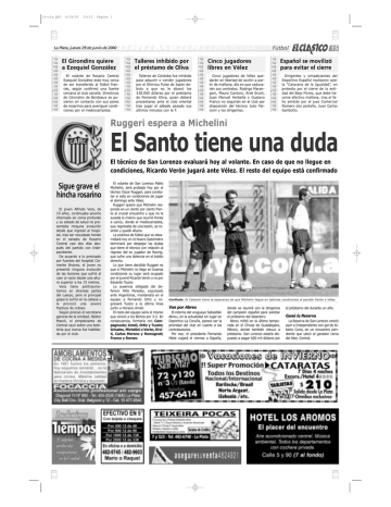 15-cla.QXD 6/28/00 23:23 Página 1 Fútbol La Plata, jueves 29 de junio de 2000 El Girondins quiere a Ezequiel González El volante de Rosario Central Ezequiel González está muy cerca de ser transferido al fútbol francés, según confirmó una fuente cercana al club canalla. Directivos de Girondins de Bordeaux se pusieron en contacto con sus pares de rosarinos para averiguar condiciones por el mediocampista. Talleres inhibido por el préstamo de Oliva Talleres de Córdoba fue inhibido para adquirir o vender jugadores por el Shimizu Pulse de Japón debido a que no le abonó los 338.000 dólares por el préstamo de Fernando Oliva, quien deberá presentarse ante el club oriental tras jugar el sábado pasado sus últimos minutos con la T. Cinco jugadores libres en Vélez Cinco jugadores de Vélez quedarán en libertad de acción a partir de mañana, día en que caducarán sus contratos. Rodrigo Marangoni, Mauro Cantoro, Ariel Ercoli, Juan Manuel Herbella y Gustavo Franco no seguirán en el club por disposición del técnico Julio Falcioni y los dirigentes. 15 Español se movilizó para evitar el cierre Dirigentes y simpatizantes del Deportivo Español realizaron ayer la Caravana de la Igualdad, en protesta por el cierre de la entidad del Bajo Flores, que debe hacerse efectivo mañana, tras el fallo emitido por el juez Comercial Número dos porteño, Juan Carlos Garibotto. Ruggeri espera a Michelini El Santo tiene una duda El técnico de San Lorenzo evaluará hoy al volante. En caso de que no llegue en condiciones, Ricardo Verón jugará ante Vélez. El resto del equipo está confirmado Sigue grave el hincha rosarino El joven Alfredo Vera, de 19 años, continuaba anoche internado en coma profundo y su estado de salud no presentaba ninguna evolución desde que ingresó al hospital, tras ser rescatado herido en el estadio de Rosario Central casi dos días después del partido con Independiente. De acuerdo a lo precisado por fuentes del hospital Clemente Alvarez, el joven no presentó ninguna evolución de las lesiones que sufrió al caer al vacío desde una altura superior a los 15 metros. Vera tiene politraumatismos en diversas partes del cuerpo, pero el principal golpe lo sufrió en la cabeza y le provocó una severa fractura de cráneo. Según precisó el secretario general de la entidad, Néstor Mascó, el simpatizante de Central cayó sobre una boletería que nunca fue habilitada por el club. El volante de San Lorenzo Pablo Michelini, será probado hoy por el técnico Oscar Ruggeri, para constatar si está en condiciones de jugar el domingo ante Vélez. Ruggeri quiere que Michelini responda en un ciento por ciento frente al crucial encuentro y que no le suceda lo mismo que ocurrió frente a Lanús, donde el mediocampista, que regresaba de una lesión, se resintió y quedó afuera. La práctica de fútbol que se desarrollará hoy en el Nuevo Gasómetro terminará por despejar las dudas que tiene el técnico con relación al regreso del ex jugador de Racing, que sufre una dolencia en el tobillo derecho. Lo que tiene decidido Ruggeri es que si Michelini no llega en buenas condiciones su lugar será ocupado por el juvenil Ricardo Verón y no por Eduardo Tuzzio. La ausencia obligada del defensor Aldo Paredes, expulsado ante Argentinos, mantendrá en el equipo a Fernando Ortiz y regresará Tuzzio a la última línea junto a Horacio Ameli. El resto del equipo sería el mismo que venció a los Bichos por 3-2. En consecuencia, formaría con Campagnuolo; Ameli, Ortiz y Tuzzio; Grisales, Michelini o Verón, Erviti, Carlos Moreno y Romagnoli; Franco y Romeo. Confiado. El Cabezón tiene la esperanza de que Michelini llegue en óptimas condiciones al partido frente a Vélez Van por Abreu El retorno del uruguayo Sebastián Abreu, en la actualidad sin lugar en Deportivo La Coruña, parece ser la prioridad del club en cuanto a las contrataciones. Por eso, el presidente Fernando Miele viajará el viernes a España, donde se reunirá con la dirigencia del campeón español para solicitar el préstamo del delantero. Abreu militó en la última temporada en el Chivas de Guadalajara, México, donde también estuvo a préstamo. San Lorenzo estaría dispuesto a pagar 600 mil dólares por el préstamo del durante un año. Ganó la Reserva La Reserva de San Lorenzo venció ayer a Independiente con gol de Alberto Coria, en un encuentro pendiente que ubicó al ganador cerca del líder, Central.