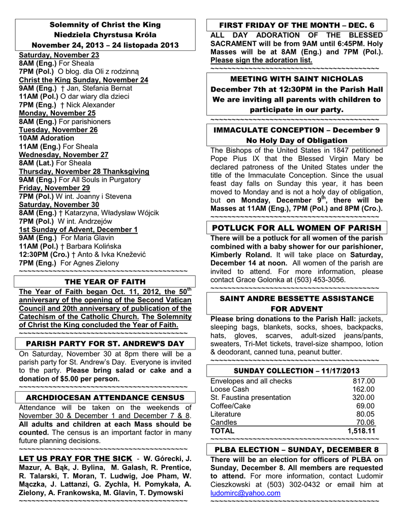 Solemnity of Christ the King Niedziela Chyrstusa Króla November 24, 2013 – 24 listopada 2013 Saturday, November 23 8AM (Eng.) For Sheala 7PM (Pol.) O błog. dla Oli z rodzinną Christ the King Sunday, November 24 9AM (Eng.) † Jan, Stefania Bernat 11AM (Pol.) O dar wiary dla dzieci 7PM (Eng.) † Nick Alexander Monday, November 25 8AM (Eng.) For parishioners Tuesday, November 26 10AM Adoration 11AM (Eng.) For Sheala Wednesday, November 27 8AM (Lat.) For Sheala Thursday, November 28 Thanksgiving 9AM (Eng.) For All Souls in Purgatory Friday, November 29 7PM (Pol.) W int. Joanny i Stevena Saturday, November 30 8AM (Eng.) † Katarzyna, Władysław Wójcik 7PM (Pol.) W int. Andrzejów 1st Sunday of Advent, December 1 9AM (Eng.) For Maria Glavin 11AM (Pol.) † Barbara Kolińska 12:30PM (Cro.) † Anto & Ivka Knežević 7PM (Eng.) For Agnes Zielony ~~~~~~~~~~~~~~~~~~~~~~~~~~~~~~~~~~~~~~~~ THE YEAR OF FAITH The Year of Faith began Oct. 11, 2012, the 50th anniversary of the opening of the Second Vatican Council and 20th anniversary of publication of the Catechism of the Catholic Church. The Solemnity of Christ the King concluded the Year of Faith. ~~~~~~~~~~~~~~~~~~~~~~~~~~~~~~~~~~~~~~~~ PARISH PARTY FOR ST. ANDREW’S DAY On Saturday, November 30 at 8pm there will be a parish party for St. Andrew’s Day. Everyone is invited to the party. Please bring salad or cake and a donation of $5.00 per person. ~~~~~~~~~~~~~~~~~~~~~~~~~~~~~~~~~~~~~~~~ ARCHDIOCESAN ATTENDANCE CENSUS Attendance will be taken on the weekends of November 30 & December 1 and December 7 & 8. All adults and children at each Mass should be counted. The census is an important factor in many future planning decisions. ~~~~~~~~~~~~~~~~~~~~~~~~~~~~~~~~~~~~~~~~ LET US PRAY FOR THE SICK - W. Górecki, J. Mazur, A. Bąk, J. Bylina, M. Galash, R. Prentice, R. Talarski, T. Moran, T. Ludwig, Joe Pham, W. Mączka, J. Lattanzi, G. Zychla, H. Pomykała, A. Zielony, A. Frankowska, M. Glavin, T. Dymowski ~~~~~~~~~~~~~~~~~~~~~~~~~~~~~~~~~~~~~~~~ FIRST FRIDAY OF THE MONTH – DEC. 6 ALL DAY ADORATION OF THE BLESSED SACRAMENT will be from 9AM until 6:45PM. Holy Masses will be at 8AM (Eng.) and 7PM (Pol.). Please sign the adoration list. ~~~~~~~~~~~~~~~~~~~~~~~~~~~~~~~~~~~~~~~~ MEETING WITH SAINT NICHOLAS December 7th at 12:30PM in the Parish Hall We are inviting all parents with children to participate in our party. ~~~~~~~~~~~~~~~~~~~~~~~~~~~~~~~~~~~~~~~~ IMMACULATE CONCEPTION – December 9 No Holy Day of Obligation The Bishops of the United States in 1847 petitioned Pope Pius IX that the Blessed Virgin Mary be declared patroness of the United States under the title of the Immaculate Conception. Since the usual feast day falls on Sunday this year, it has been moved to Monday and is not a holy day of obligation, but on Monday, December 9th, there will be Masses at 11AM (Eng.), 7PM (Pol.) and 8PM (Cro.). ~~~~~~~~~~~~~~~~~~~~~~~~~~~~~~~~~~~~~~~~ POTLUCK FOR ALL WOMEN OF PARISH There will be a potluck for all women of the parish combined with a baby shower for our parishioner, Kimberly Roland. It will take place on Saturday, December 14 at noon. All women of the parish are invited to attend. For more information, please contact Grace Golonka at (503) 453-3056. ~~~~~~~~~~~~~~~~~~~~~~~~~~~~~~~~~~~~~~~~ SAINT ANDRE BESSETTE ASSISTANCE FOR ADVENT Please bring donations to the Parish Hall: jackets, sleeping bags, blankets, socks, shoes, backpacks, hats, gloves, scarves, adult-sized jeans/pants, sweaters, Tri-Met tickets, travel-size shampoo, lotion & deodorant, canned tuna, peanut butter. ~~~~~~~~~~~~~~~~~~~~~~~~~~~~~~~~~~~~~~~~ SUNDAY COLLECTION – 11/17/2013 Envelopes and all checks 817.00 Loose Cash 162.00 St. Faustina presentation 320.00 Coffee/Cake 69.00 Literature 80.05 Candles 70.06 TOTAL 1,518.11 ~~~~~~~~~~~~~~~~~~~~~~~~~~~~~~~~~~~~~~~~ PLBA ELECTION – SUNDAY, DECEMBER 8 There will be an election for officers of PLBA on Sunday, December 8. All members are requested to attend. For more information, contact Ludomir Cieszkowski at (503) 302-0432 or email him at [email protected] ~~~~~~~~~~~~~~~~~~~~~~~~~~~~~~~~~~~~~~~~ ROK WIARY Rok Wiary kończy się dzisiaj w uroczystość Chrystusa Króla Wszechświata. Wspominał on 50lecie otwarcia Soboru Watykańskiego II i 20-lecie promulgowania Katechizmu Kościoła. ~~~~~~~~~~~~~~~~~~~~~~~~~~~~~~~~~~~~~~~~ WYPOMINKI Przez cały miesiąc listopad przed każdą Mszą św. (15 min.) będziemy polecać naszych zmarłych parafian i zmarłych z rodzin. Kartki wypominkowe z tyłu kościoła, można użyć swoich kartek. ~~~~~~~~~~~~~~~~~~~~~~~~~~~~~~~~~~~~~~~~ KATECHEZA DLA DZIECI I MŁODZIEŻY Nauka religii w naszej parafii rozpoczęła się. Przyjmujemy dzieci do klasy przedszkolnej (4+ lat). Nie ma katechezy w niedzielę, 1 grudnia. ~~~~~~~~~~~~~~~~~~~~~~~~~~~~~~~~~~~~~~~~ OBECNOŚĆ NA MSZY ŚWIĘTEJ Przez dwa weekendy, 30 listopada i 1 grudnia oraz 7 i 8 grudnia będzie doroczne liczenie uczestników Mszy św. w naszym kościele. Liczymy wszystkich dorosłych i dzieci. ~~~~~~~~~~~~~~~~~~~~~~~~~~~~~~~~~~~~~~~~ ZABAWA PARAFIALNA – ANDRZEJKI W sobotę, 30 listopada o godz. 20:00 będzie andrzejkowa zabawa parafialna. Zapraszamy do wspólnej zabawy. Prosimy o przyniesienie sałatek lub ciasta oraz opłatę $5.00 od osoby. ~~~~~~~~~~~~~~~~~~~~~~~~~~~~~~~~~~~~~~~~ CAŁODNIOWA ADORACJA – 6 grudnia W Pierwszy Piątek Miesiąca – CAŁODNIOWA ADORACJA - od 8:30 do 18:50. Msze św. o godz. 8:00 (ang.), 19:00 (pol.). Wpisujemy się na listę. ~~~~~~~~~~~~~~~~~~~~~~~~~~~~~~~~~~~~~~~ SPOTKANIE ZE ŚWIĘTYM MIKOŁAJEM 7 grudnia w sobotę o godz. 12:30 w Sali Parafialnej - Zapraszamy rodziców i dzieci do wspólnej zabawy ~~~~~~~~~~~~~~~~~~~~~~~~~~~~~~~~~~~~~~~~ UROCZYSTOŚĆ NIEPOKALANEGO POCZĘCIA - 9 grudnia Niepokalana Dziewica jest dla Kościoła wzorem wiary i miłości. W poniedziałek, 9 grudnia, msze święte o 11:00 (ang.), o 19:00 (pol.), 20:00 (chor.). ~~~~~~~~~~~~~~~~~~~~~~~~~~~~~~~~~~~~~~~~ BABY S