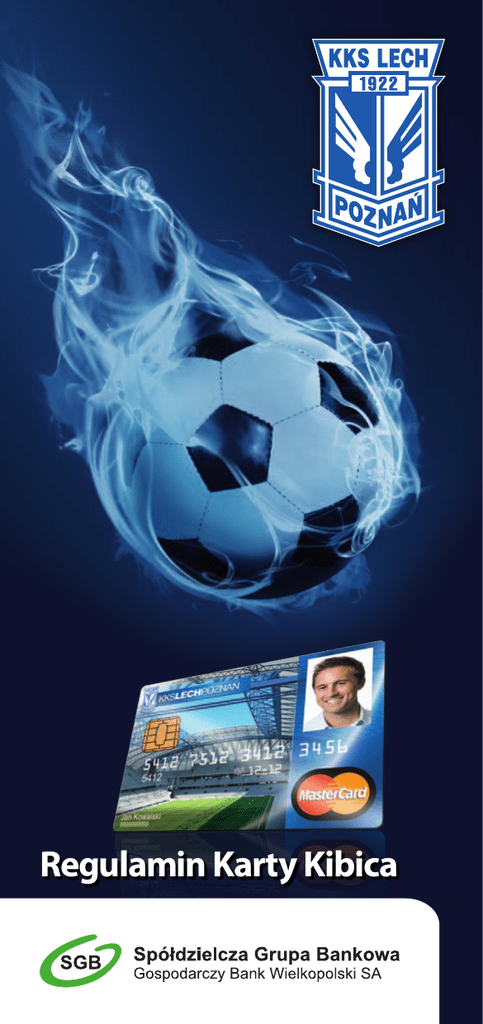 Regulamin Karty Kibica 2 Rozdział 1. Postanowienia ogólne. §1 Niniejszy „Regulamin funkcjonowania kart przedpłaconych SGB – KKS Lech Poznań w Gospodarczym Banku Wielkopolski SA”, zwany dalej regulaminem, określa zasady wydawania, obsługi oraz rozliczania operacji dokonywanych przy użyciu międzynarodowych przedpłaconych kart płatniczych MasterCard „SGB – KKS Lech Poznań” wydanych dla osób fizycznych. §2 Poprzez użyte w niniejszym regulaminie określenia należy rozumieć: 1) agent rozliczeniowy – bank bądź inna osoba prawna zawierająca z akceptantami umowy o przyjmowanie zapłaty przy użyciu elektronicznych instrumentów płatniczych; 2) akceptant – przedsiębiorca, który zawarł z agentem rozliczeniowym umowę o przyjmowanie zapłaty przy użyciu elektronicznych instrumentów płatniczych; 3) autoryzacja – sprawdzenie autentyczności karty płatniczej oraz możliwości dokonania operacji o określonej kwocie przy jej użyciu; 4) Bank – Gospodarczy Bank Wielkopolski SA – wydawca Karty Kibica; 5) bankomat – urządzenie umożliwiające posiadaczowi karty podejmowanie gotówki za pomocą karty i/lub dodatkowo dokonywanie innych operacji; 6) CVC2 – ostatnie trzy cyfry nadrukowane na pasku do podpisu, znajdującym się na rewersie karty; 7) First Data Polska (FDP) – firma First Data Polska SA, z siedzibą w Warszawie, Al. Jerozolimskie 92 – agent rozliczeniowy Banku świadczący usługi na rzecz SGB w zakresie wydawnictwa i obsługi kart płatniczych; 8) infolinia – telefoniczne centrum obsługi klienta Banku, dostępne pod numerem telefonu: 801 340 008; 9) kanał SMS – sposób komunikacji posiadacza karty z Bankiem lub Banku z posiadaczem karty na odległość, za pośrednictwem serwisu SMS; 10) karnet – oznaczone unikatowym numerem uprawnienie posiadacza karty do wejścia na stadion, na przypisane miejsce, na określone w nim zawody sportowe organizowane przez Partnera; 11) Karta Kibica – przedpłacona karta płatnicza SGB – KKS Lech Poznań, wydana przez Bank wspólnie z Partnerem; 12) karta płatnicza (karta) – karta płatnicza identyfikująca jej wydawcę i upoważnionego posiadacza karty, uprawniająca do wypłaty gotówki oraz dokonywania zapłaty za towary i usługi w formie bezgotówkowej; 13) limit transakcji zbliżeniowych – ustalony przez Bank limit transakcji dokonywanych przez zbliżenie karty do czytnika zbliżeniowego; 14) limit operacji bezgotówkowych – maksymalna dzienna kwota operacji bezgotówkowych, które mogą być dokonywane w placówkach handlowych i usługowych akceptujących karty płatnicze; 15) limit wypłat gotówki – maksymalna dzienna kwota operacji wypłat gotówkowych, które mogą być dokonywane w bankomatach i placówkach banków akceptujących karty płatnicze; 16) MasterCard International (MasterCard) – organizacja płatnicza obsługująca międzynarodowy system akceptacji i rozliczania operacji dokonanych przy użyciu kart płatniczych z logo Maestro/Cirrus/ MasterCard; 17) oddział – placówka operacyjna Banku (lista oddziałów Banku dostępna jest na stronie internetowej: www.gbw.com.pl); 18) operacja (transakcja) – czynność dokonana przy użyciu karty, w szczególności wypłata gotówki lub dokonanie zapłaty przy użyciu karty płatniczej; 19) Partner – klub piłkarski KKS Lech Poznań SA z siedzibą w Poznaniu, ul. Bułgarska 5/7, 60-320 Poznań; 20) PIN (Osobisty Numer Identyfikacyjny) – poufny, indywidualny kod służący do identyfikacji posiadacza karty korzystającego z urządzeń odczytujących informacje zawarte na pasku magnetycznym lub mikroprocesorze karty; 21) posiadacz karty – osoba fizyczna, która podpisała z Bankiem umowę o kartę i której imię i nazwisko jest umieszczone na awersie Karty Kibica, dokonujący na podstawie umowy o kartę, przy użyciu Karty Kibica, w swoim imieniu i na swoją rzecz operacji określonych w umowie o kartę; 22) program lojalnościowy – sposób organizacji grupy posiadaczy kart, stworzony w celu osiągnięcia przez nich określonych w tym programie korzyści marketingowych i materialnych; 23) program rabatowy – oferta przeznaczona dla posiadaczy karty, 1 polegająca na udzieleniu przez Partnera lub placówki handlowo-usługowe współpracujące z Partnerem lub Bankiem, określonych zniżek przy zakupie towarów i/lub usług przy użyciu Kart Kibica; 24) Punkt Obsługi Klienta – punkty handlowo-usługowe lub inne placówki wskazane przez Partnera; 25) rachunek karty – rachunek powiązany z określoną Kartą Kibica, w ciężar którego rozliczane są operacje dokonane przy użyciu Karty Kibica oraz należne Bankowi opłaty i prowizje; 26) reklamacja – zgłoszenie Bankowi przez posiadacza karty pisemnej odmowy zaakceptowania operacji dokonanej kartą lub zaksięgowanej przez Bank na rachunku karty; 27) saldo dostępnych środków – saldo rachunku pomniejszone o sumę środków zablokowanych na rachunku karty w celu rozliczenia dokonanych transakcji; 28) SGB lub Spółdzielcza Grupa Bankowa – zrzeszenie, które tworzą Gospodarczy Bank Wielkopolski SA (GBW SA) oraz banki spółdzielcze, które zawarły z nim umowy zrzeszenia; 29) taryfa – obowiązująca w Banku Taryfa prowizji i opłat za czynności i usługi bankowe – waluta krajowa – Klienci GBW SA (z wyłączeniem zrzeszonych Banków Spółdzielczych) lub wyciąg z tej taryfy w zakresie opłat dotyczących Kart Kibica; 30) transakcja (operacja) bezgotówkowa – dokonanie za pomocą karty płatniczej płatności za towary i usługi; 31) transakcja (operacja) wypłaty gotówki – dokonanie wypłaty gotówki za pomocą karty płatniczej; 32) transakcja zbliżeniowa (transakcja bezstykowa) – transakcja bezgotówkowa dokonana przy użyciu Karty Kibica w punkcie usługowo-handlowym zaopatrzonym w terminal z czytnikiem zbliżeniowym, polegająca na realizacji płatności poprzez zbliżenie karty do czytnika zbliżeniowego; 33) terminal POS – elektron