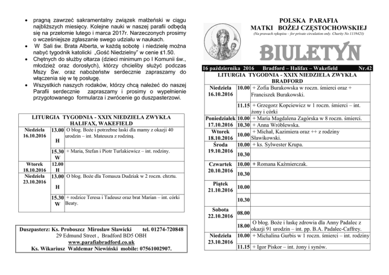 pragną zawrzeć sakramentalny związek małżeński w ciągu najbliższych miesięcy. Kolejne nauki w naszej parafii odbędą się na przełomie lutego i marca 2017r. Narzeczonych prosimy o wcześniejsze zgłaszanie swego udziału w naukach. W Sali św. Brata Alberta, w każdą sobotę i niedzielę można nabyć tygodnik katolicki „Gość Niedzielny” w cenie £1.50. Chętnych do służby ołtarza (dzieci minimum po I Komunii św., młodzież oraz dorosłych), którzy chcieliby służyć podczas Mszy Św. oraz nabożeństw serdecznie zapraszamy do włączenia się w tę posługę. Wszystkich naszych rodaków, którzy chcą należeć do naszej Parafii serdecznie zapraszamy i prosimy o wypełnienie przygotowanego formularza i zwrócenie go duszpasterzowi. LITURGIA TYGODNIA - XXIX NIEDZIELA ZWYKŁA HALIFAX, WAKEFIELD Niedziela 13.00 O błog. Boże i potrzebne łaski dla mamy z okazji 40 16.10.2016 H urodzin – int. Mateusza z rodziną. 15.30 + Maria, Stefan i Piotr Turlakiewicz – int. rodziny. W Wtorek 18.10.2016 Niedziela 23.10.2016 12.00 H 13.00 O błog. Boże dla Tomasza Dudziak w 2 roczn. chrztu. H POLSKA PARAFIA MATKI BOŻEJ CZĘSTOCHOWSKIEJ (Na prawach rękopisu – for private circulation only. Charity No 1119423) BIULETYN 16 października 2016 Bradford – Halifax – Wakefield Nr.42 LITURGIA TYGODNIA - XXIX NIEDZIELA ZWYKŁA BRADFORD Niedziela 10.00 + Zofia Burakowska w roczn. śmierci oraz + 16.10.2016 Franciszek Burakowski. 11.15 + Grzegorz Kopciewicz w 1 roczn. śmierci – int. żony i córki Poniedziałek 10.00 + Maria Magdalena Zagórska w 8 roczn. śmierci. 17.10.2016 10.30 + Anna Wróblewska. + Michał, Kazimiera oraz ++ z rodziny Wtorek 10.00 Sławikowski. 18.10.2016 Środa 10.00 + ks. Sylwester Krupa. 19.10.2016 10.30 Czwartek 10.00 + Romana Kaźmierczak. 20.10.2016 10.30 Piątek 10.00 21.10.2016 15.30 + rodzice Teresa i Tadeusz oraz brat Marian – int. córki W Beaty. 10.30 Sobota 08.00 22.10.2016 Duszpasterz: Ks. Proboszcz Mirosław Sławicki tel. 01274-720848 29 Edmund Street , Bradford BD5 OBH www.parafiabradford.co.uk Ks. Wikariusz Waldemar Niewiński mobile: 07561002907. O błog. Boże i łaskę zdrowia dla Anny Padalec z okazji 91 urodzin – int. pp. B.A. Padalec-Caffrey. 10.00 + Michalina Gurbis w 1 roczn. śmierci – int. rodziny 18.00 Niedziela 23.10.2016 11.15 + Igor Piskor – int. żony i synów. Lektorzy – Sobota 22.10.2016 g.18.00 – M. Kączkowska Niedziela 23.10.2016 g. 10.00 - K. Musztafa g.11.15 - M. Pierścińska Dyżur przedstawiciela PRD Sali św. Brata Alberta, sobota i niedziela 22-23.10.2016 – M.M. Pierściński OFIARY Taca dla parafii – 09.10.2016 - £ 455.47 (Bradford), - £ 95.15 (Wakefield), - £ 236.00 (Halifax). II Taca (Fundacja Dzieło Nowego Tysiąclecia) - £327.00 (Bradford), - £52.06 (Wakefield), - £ 116.20 (Halifax). Gift Aid (tydzień 38) - £73.50, (tydzień 39) - £89.50. Inne (sklepik, prasa, świece itp.) - £ 251.60 (w tym: - na kościół: M. Skibiński - £20, - legitymacje parafialne: M. Leksińska - £10, - na kwiaty: KŻR - £30, A. Jażewska - £30, anonimowo - £10, - pomoc K-łowi na Wschodzie (klasztor w Podkamieniu): S. Lademan - £50. ***** Jeżeli ktoś z Parafian pragnie złożyć ofiarę czekiem na dowolny cel parafialny, prosimy go wypisać na: P.C.M. BRADFORD lub P.C.M. HALIFAX. Wszystkim ofiarodawcom składamy serdeczne podziękowanie za złożone ofiary na nasze cele parafialne. Bóg zapłać. OGŁOSZENIA DUSZPASTERSKIE W tym tygodniu w liturgii: w poniedziałek wspomnienie św. Ignacego Antiocheńskiego, bpa i męcz., - we wtorek święto św. Łukasza Ewangelisty, - w środę wspomnienie bł. Jerzego Popiełuszki, prezb. i męcz., - w czwartek wspomnienie św. Jana Kantego, - w piątek wspomnienie bł. Jakuba Strzemię, bpa, - w sobotę wspomnienie św. Jana Pawła II, pap. W przyszłą niedzielę zostanie w kościołach Polskiej Misji Katolickiej zebrana II taca na Papieskie Dzieła Misyjne. Październik jest w Kościele tradycyjnie miesiącem modlitwy różańcowej. Zapraszam na nabożeństwa różańcowe, które odprawiane są w Bradford od poniedziałku do piątku po zakończeniu ostatniej Mszy św., w soboty o godz.17.30 oraz w niedziele po zakończeniu Mszy św. o godz.11.15. W Halifax nabożeństwo różańcowe we wtorek po Mszy św. W Wakefield w niedzielę o godz.15.00. W poniedziałek w POK odbędzie się kolejne spotkanie w ramach Well Being Cafe. Zapraszamy. W środę oraz piątek zapraszamy naszych starszych parafian do POK na spotkania w ramach Day Centre w godz.10.00-14.00. Zbliża się Uroczystość Wszystkich Świętych. Na stoliku przy wejściu do kościoła są wyłożone koperty na wypominki. Za zmarłych wymienionych w wypominkach modlić się będziemy w Uroczystość Wszystkich Świętych, w Dzień Zaduszny oraz w każdym tygodniu listopada ofiarowana będzie w ich intencji Msza św. Program modlitw za zmarłych na okolicznych cmentarzach: - sobota 05.11.2016 godz.11.00 – Scholemoor, - sobota 05.11.2016 godz.12.00 – West Bowling, - sobota 05.11.2016 godz.14.00 – Bingley, - sobota 05.11.2016 godz.15.00 – Nab Wood. - niedziela 06.11.2016 godz.14.00 – North Bierley, - niedziela 13.11.2016 godz.14.30 – Stoney Royd (Halifax). Nauki przedślubne czyli przygotowanie bezpośrednie do sakramentu małżeństwa odbędą się w naszej parafii w dniach 12, 13, 26 i 27 listopada. Spotkania sobotnie odbędą się o godz.19.00 w kościele (czas trwania ok. 90 minut), zaś spotkania niedzielne w POK w godz. od 16.00 do 21.00. Zapraszamy do udziału wszystkich narzeczonych, którzy
