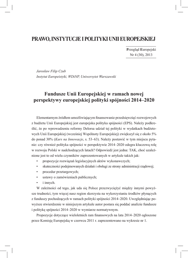 PRAWO, INSTYTUCJE I POLITYKI UNII EUROPEJSKIEJ Przegląd Europejski Nr 4 (30), 2013 Jarosław Filip Czub Instytut Europeistyki, WDiNP, Uniwersytet Warszawski Fundusze Unii Europejskiej w ramach nowej perspektywy europejskiej polityki spójności 2014–2020 Elementarnym źródłem umożliwiającym finansowanie przedsięwzięć rozwojowych z budżetu Unii Europejskiej jest europejska polityka spójności (EPS). Należy podkreślić, że po wprowadzeniu reformy Delorsa udział tej polityki w wydatkach budżetowych Unii Europejskiej (wcześniej Wspólnoty Europejskiej) zwiększył się z około 5% do ponad 30% (Kurs na Innowacje, s. 53–63). Należy postawić w tym miejscu pytanie: czy również polityka spójności w perspektywie 2014–2020 odegra kluczową rolę w rozwoju Polski w nadchodzących latach? Odpowiedź jest jedna: TAK, choć uzależnione jest to od wielu czynników zaprezentowanych w artykule takich jak: • propozycje rozwiązań legislacyjnych aktów wykonawczych; • skuteczności podejmowanych działań i obsługi ze strony administracji rządowej; • procedur przetargowych; • ustawy o zamówieniach publicznych; • i innych. W zależności od tego, jak uda się Polsce przezwyciężyć między innymi powyższe trudności, tym więcej nasz region skorzysta na wykorzystaniu środków płynących z funduszy pochodzących w ramach polityki spójności 2014–2020. Uwzględniając powyższe stwierdzenie w niniejszym artykule autor postara się poddać analizie fundusze i politykę spójności 2014–2020 w wymiarze normatywnym. Propozycje dotyczące wieloletnich ram finansowych na lata 2014–2020 ogłoszone przez Komisję Europejską w czerwcu 2011 r. zaprezentowano na wykresie nr 1. Fundusze Unii Europejskiej w ramach nowej perspektywy... 43 Wykres nr 1. Budżet na lata Unii Europejskiej 2014–2020 Źródło: opracowanie własne na podstawie Polityka spójności 2014–2020…, http://ec.europa.eu/regional_policy/what/future/proposals_2014_2020_pl.cfm Obszar działalności europejskiej polityki spójności Unii Europejskiej (UE) jest definiowany przy pomocy trzech synonimicznych pojęć, które, w większości przypadków, traktowane są niemalże równorzędnie. Do wspomnianej siatki pojęciowej zaliczyć można następujące: 1. polityka strukturalna, która pojawiła się wraz z traktatem rzymskim oraz tworzeniem się Wspólnot Europejskich w 1957 r. Funkcjonuje jako najstarsze pojęcie pod względem terminologicznym, którego celem jest wspieranie zmian strukturalnych; 2. polityka regionalna, której elementarnym zadaniem jest rozwój poszczególnych regionów, ponadto są przesłanki wyboru obszarów problemowych oraz znaczna część środków jest zarządzana na poziomie regionalnym; 3. polityka spójności (europejska polityka spójności – EPS), której podstawowym celem jest zmniejszenie zróżnicowań w ramach systemu terytorialnego. W latach 2007–2013 Polska stała się największym beneficjentem w historii Unii Europejskiej wykorzystującym środki pochodzące z funduszy strukturalnych. Taka pozycja sytuuje Polskę jako podmiot o największej skuteczności i efektywności w zakresie polityki spójności. Od wspomnianej efektywności i możliwości wykorzystania 44 Jarosław Filip Czub przez Polskę funduszy z perspektywy 2014–2020 zależy przyszłość rozwoju państwa oraz przyszłość rozwoju europejskiej polityki spójności w ramach UE, która jest istotna z punktu widzenia interesu Polski. Należy podkreślić, że w przypadku nowej perspektywy 2014–2020 po raz pierwszy Polska ma możliwość aktywnego partycypowania w procesie reformowania polityki. Dyskusja nad ramami określającymi politykę spójności po 2013 r. rozpoczęła się od opublikowania IV Raportu kohezyjnego w maju 2007 r. Oficjalny początek debaty nad polityką spójności 2014–2020 odbył się podczas IV Forum Kohezyjnego we wrześniu 2007 r., Do najważniejszych aktorów partycypujących w tym przedsięwzięciu zalicza się: państwa członkowskie, regiony, przedstawicieli Dyrekcji Generalnej ds. Polityki Regionalnej, Komisji Europejskiej (KE), Ekonomicznego Komitetu EkonomicznoSpołecznego (EKES), Komitetu Regionów (KR), Parlamentu Europejskiego (PE), czy organizacji pozarządowych. Oficjalny kierunek modernizacji odbywał się w formie publicznych konsultacji Komisji Europejskiej. Paralelnie odbywały się (odbywają nadal, ze względu na fakt, iż nie zakończył się proces finalizujący perspektywę europejskiej polityki spójności 2014–2020) nieoficjalne spotkania poszczególnych ministrów ds. rozwoju regionalnego, grup roboczych i eksperckich inicjowane przez Komisję Europejską lub prezydencję Rady Unii Europejskiej. W ramach IV Raportu kohezyjnego po raz pierwszy został zobrazowany opis sytuacji społeczno-gospodarczej i terytorialnej w wymiarze rozszerzonej Unii oraz 268 regionów wchodzących w jej skład. W dokumencie tym została zawarta wnikliwa analiza pozycji regionów, zilustrowana za pomocą produktu krajowego brutto (PKB), produkcyjnością a także zatrudnieniem. Ponadto raport wyznaczył zarys wytycznych, które państwa członkowskie i regiony będą musiały wdrożyć i przezwyciężyć w nadchodzących latach. Raport stał się tym samym znakomitą bazą do rozpoczęcia opracowania perspektywy polityki spójności w latach 2014–2020. Wraz z zainicjowaniem przez Traktat z Lizbony z 2009 r. nowego terytorialnego wymiaru spójności (wespół z wymiarem społeczno-gospodarczym), 6 października 2008 r. KE przyjęła Zieloną Księgę w sprawie spójności terytorialnej (Komunikat Komisji…, COM(2008) 616 wersja ostateczna)1. Dokument ten stał się elementem inicja 1 Podstawowym elementem dyskusji było pytanie o spójność terytorialną, w tym o jej definicję (do momentu zainicjowania procesu konsultacyjnego ta definicja nie była klarowna i oczywista). Uczestnicy procesu konsultacyjnego opowiadali się za transparentną i klarowną def