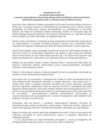Interpelacja nr 3757 do ministra sprawiedliwości w sprawie wprowadzenia ustawowego pełnego zakazu produkcji i rozpowszechniania materiałów pornograficznych w nowelizowanym Kodeksie karnym Szanowny Panie Ministrze! Problem pornografii od lat stanowi temat dyskusji zarówno w Polsce, jak i za granicą. Kwestia ta wielokrotnie była przedmiotem prac z zakresu różnych specjalizacji, od medycznych, poprzez psychologiczne czy socjologiczne, na prawnych kończąc. Jak dotąd nie znaleziono jednak ostatecznego środka na rozwiązanie tego tak bardzo istotnego społecznie problemu. Nie zmienia to jednak faktu, że z całą stanowczością należy podejmować próby zmierzające do osiągnięcia tego celu. Musimy sobie uświadomić, że dyskusja na temat pornografii nie jest tematem marginalnym czy drugorzędnym. To przede wszystkim dyskusja o prawie, etyce, moralności, której zadaniem jest osiągnięcie wspólnego celu, jakim jest odpowiedzialność za dobro społeczne. Obecnie obowiązujący zakaz pornografii, uregulowany treścią art. 202 Kodeksu karnego, nie może być uznany za wystarczający. Regulacja ta nie spełnia w pełni swojej roli ochronnej przed rozszerzaniem się tego negatywnego zjawiska, jak i nie odpowiada stopniowi jego społecznej szkodliwości, a tym samym nie zaspokaja oczekiwań naszego społeczeństwa. Dlatego też powinniśmy podjąć wszelkie działania, które w prostej linii będą dążyć do poprawy możliwości ochrony społeczeństwa przed rozpowszechnianiem pornografii, zwłaszcza wśród młodzieży i dzieci. Należy w tym miejscu wskazać, iż zakaz pornografii nie jest ewenementem, obowiązuje on bowiem w wielu cywilizowanych krajach świata. Oczywistym jest, że powszechny i nieograniczony dostęp do treści pornograficznych jest złem. Eksponowanie seksualności człowieka w sposób sprzeczny z jego naturą, jak i w sposób, który godzi w godność człowieka, nierzadko przy użyciu przemocy, powoduje poczucie zagrożenia, zakłopotania. Nikt nie zaprzeczy bowiem, iż pornografia powoduje negatywne skutki społeczne. Narzucanie młodym ludziom treści pornograficznych m. in. w prasie czy innych mediach drastycznie wpływa na postrzeganie przez nich świata. Prowadzi do wyzwolenia i upowszechnienia zachowań perwersyjnych. Przyzwolenie na rozpowszechnianie treści pornograficznych i wzrost ich dostępności wśród młodych ludzi ingeruje w ich proces wychowawczy. Pornografia staje się jednym z czynników deprawujących młodzież. Prowadzi do zakwestionowania wartości związanych z planowaniem i założeniem rodziny. Zmierza do traktowania drugiego człowieka w sposób instrumentalny, odzierający go z jego godności. Mając na uwadze, jak ważnym społecznie problemem jest walka z wciąż rozszerzającym się wpływem pornografii na nasze społeczeństwo, proszę o udzielenie odpowiedzi na następujące pytania: 1. Czy przyzwolenie na rozpowszechnianie pornografii i wzrost jej dostępności dla młodego pokolenia ingeruje w proces wychowawczy dzieci i młodzieży? 2. Czy bez znaczenia dla ewentualnych zmiana przepisów Kodeksu karnego w zakresie zakazu pornografii jest fakt, że liczne badania świadczą o niezwykłej szkodliwości oddziaływania pornografii na rozwój osobowości młodego człowieka, przyczynia się to bowiem do wzrostu agresji, dewiacji, prowadzi do przestępczości? 3. Dlaczego przy pracach nad zmianami Kodeksu karnego nie bierze się pod uwagę głosu około 500 tys. osób wzywających najwyższe władze Rzeczypospolitej Polskiej do wprowadzenia przepisów zaostrzających prawo karne poprzez wprowadzenie całkowitego zakazu rozpowszechniania pornografii? Powinniśmy nauczyć się wyznaczać granice pomiędzy dozwoloną erotyką a zabronioną pornografią. W wielu krajach udało się stworzyć prawo chroniące przed pornografią, ale i skuteczny sposób jego egzekwowania. Dlaczego nie podjąć takiego wyzwania i w Polsce? Z wyrazami szacunku Poseł Krzysztof Lipiec Starachowice, dnia 5 lipca 2006 r. Odpowiedź podsekretarza stanu w Ministerstwie Sprawiedliwości ‐ z upoważnienia ministra ‐ na interpelację nr 3757 w sprawie wprowadzenia ustawowego, pełnego zakazu produkcji i rozpowszechniania materiałów pornograficznych w nowelizowanym Kodeksie karnym Szanowny Panie Marszałku! W odpowiedzi na interpelację Pana Posła Krzysztofa Lipca w sprawie wprowadzenia ustawowego, pełnego zakazu produkcji i rozpowszechniania materiałów pornograficznych w nowelizowanym Kodeksie karnym, przesłaną pismem z dnia 14 lipca 2006 r., nr SPS‐023‐ 3757/06, uprzejmie przedstawiam, co następuje. Analizując obowiązujący stan prawny i porównując go do stanu poprzedniego, mając również na względzie dotychczasowy model, nie wydaje się uzasadnione wymuszanie radykalnej zmiany stanowiska panującego w orzecznictwie sądowym i dominującego w literaturze przedmiotu w kierunku całkowitej nowelizacji instytucji przewidzianych w rozdziale XXV Kodeksu karnego: Przestępstwa przeciwko wolności seksualnej i obyczajności. Podzielić należy pogląd Pana Posła o niezwykłej szkodliwości oddziaływania treści pornograficznych na rozwój osobowości młodego człowieka i doniosłości problemu walki z wpływem pornografii na społeczeństwo. Jednakże zadaniem państwa jest również podjęcie próby wyznaczenia granicy między dozwoloną erotyką a zabronioną pornografią. W znacznej mierze obowiązujące przepisy Kodeksu karnego, zwłaszcza po zmianie ustawą z dnia 27 lipca 2005 r. o zmianie ustawy Kodeks karny, ustawy Kodeks postępowania karnego i ustawy Kodeks karny wykonawczy (Dz.U. Nr 163, poz. 1363), czynią zadość społecznym oczekiwaniom w tym zakresie. Rozwiązanie prawne, zawarte w art. 202 K.k., dotyczące zakazu pornografii wydaje się słuszne aksjologicznie. Zauważyć bowiem należy, że Kodeks karny z 1969 r. penalizował rozpowszechnianie pism, druków, fotografii i innych przedmiotów o charakterze pornografi