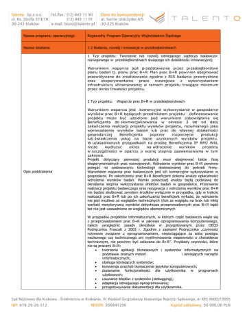 Nazwa programu operacyjnego Regionalny Program Operacyjny Województwa Śląskiego Nazwa działania 1.2 Badania, rozwój i innowacje w przedsiębiorstwach 1 Typ projektu: Tworzenie lub rozwój istniejącego zaplecza badawczorozwojowego w przedsiębiorstwach służącego ich działalności innowacyjnej Warunkiem wsparcia jest przedstawienie przez przedsiębiorstwo planu badań tj. planu prac B+R. Plan prac B+R powinien obejmować przewidywane do zrealizowania zgodne z RIS badania przemysłowe oraz eksperymentalne prace rozwojowe z wykorzystaniem infrastruktury sfinansowanej w ramach projektu trwające minimum przez okres trwałości projektu. 2 Typ projektu: Opis poddziałania Wsparcie prac B+R w przedsiębiorstwach Warunkiem wsparcia jest komercyjne wykorzystanie w gospodarce wyników prac B+R będących przedmiotem projektu - dofinansowanie projektu może być udzielone pod warunkiem zobowiązania się Beneficjenta do skomercjalizowania w okresie 3 lat od daty zakończenia realizacji projektu wyników projektu, rozumianego jako wprowadzenie wyników badań lub prac do własnej działalności gospodarczej Beneficjenta poprzez rozpoczęcie produkcji lub świadczenia usług na bazie uzyskanych wyników projektu. W uzasadnionych przypadkach na prośbę Beneficjenta IP RPO WSL może wydłużyć okres na wdrożenie wyników projektu w szczególności w oparciu o ocenę stopnia zaawansowania w tym zakresie. Projekt dotyczący pierwszej produkcji musi obejmować także fazę eksperymentalnych prac rozwojowych. Wdrożenie wyników prac B+R powinno polegać na zastosowaniu technologii dostosowanej do potrzeb firmy. Warunkiem wsparcia prac badawczych jest ich komercyjne wykorzystanie w gospodarce. Po zakończeniu prac B+R Beneficjent dokona analizy opłacalności wdrożenia wyników badań. Wyniki powyższej analizy będą podstawą do określenia stopnia wykorzystania efektów badań w gospodarce. Przerwanie realizacji projektu badawczego oraz rezygnacja z wdrożenia wyników prac B+R nie będzie skutkować zwrotem środków wyłącznie w przypadku, gdy w trakcie realizacji prac B+R lub po ich zakończeniu beneficjent wykaże, że wdrożenie nie jest możliwe ze względów technicznych i/lub ze względu na brak lub nikłą wartość merytoryczną wyników dotychczas przeprowadzonych prac B+R bądź też nie jest uzasadnione ze względów ekonomicznych W przypadku projektów informatycznych, w których część badawcza wiąże się z przeprowadzeniem prac B+R w zakresie oprogramowania komputerowego, należy uwzględnić zasady określone w przygotowanym przez OECD Podręczniku Frascati z 2002 r. Zgodnie z zapisami Podręcznika „czynności rutynowe związane z oprogramowaniem, niepociągające za sobą postępu naukowego czy technicznego ani wyeliminowania niepewności o charakterze technicznym, nie powinny być zaliczane do B+R”. Przykłady czynności, które nie są pracami B+R: tworzenie aplikacji biznesowych i systemów informatycznych na podstawie znanych metod i istniejących narzędzi informatycznych; obsługa istniejących systemów; konwersja oraz/lub tłumaczenie języków komputerowych; dodawanie funkcjonalności dla użytkownika w programach użytkowych; usuwanie błędów z systemów (debugging); adaptacja istniejącego oprogramowania; przygotowywanie dokumentacji dla użytkownika. Beneficjenci przedsiębiorstwa, w szczególności mikro-, małe i średnie przedsiębiorstwa, Okres realizacji projektu Okres realizacji projektu nie może przekraczać 36 miesięcy. Forma pomocy Dotacja bezzwrotna Minimalna wartość projektu 200.000 PLN Maksymalna wartość wydatków kwalifikowanych Typ 1 - 10 000 000,00 PLN (wartość obowiązująca na etapie wnioskowania), Typ 2 – 5 000 000,00 PLN (wartość obowiązująca na etapie wnioskowania). Typ 1 a) 45 % kosztów kwalifikowalnych dla mikro oraz małych przedsiębiorstw, a) 35 % kosztów kwalifikowalnych dla średnich przedsiębiorstw, Typ 2: 1) w przypadku pomocy publicznej na badania przemysłowe: a) mikro i małe przedsiębiorstwa – 70%, Maksymalny poziom dofinansowania (%) b) średnie przedsiębiorstwa – 60%, c) pozostali beneficjenci – 50%, 2) w przypadku pomocy publicznej na eksperymentalne prace rozwojowe: a) mikro i małe przedsiębiorstwa – 45%, b) średnie przedsiębiorstwa – 35%, c) pozostali beneficjenci – 25%, 3) w przypadku pomocy publicznej na studium wykonalności: a) mikro i małe przedsiębiorstwa – 70%, b) średnie przedsiębiorstwa – 60%, c) pozostali beneficjenci – 50%. Termin naboru wniosków Od 30.06.2016 r. do 10.08.2016 Rozstrzygnięcie konkursu planowane jest na marzec 2017
