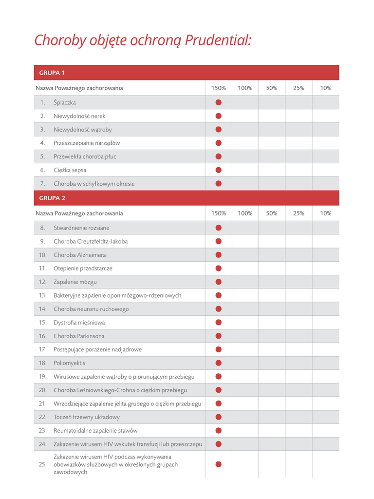 Choroby objęte ochroną Prudential: GRUPA 1 Nazwa Poważnego zachorowania 1. Śpiączka 2. Niewydolność nerek 3. Niewydolność wątroby 4. Przeszczepianie narządów 5. Przewlekła choroba płuc 6. Ciężka sepsa 150% 100% 50% 25% 10% 150% 100% 50% 25% 10% 7. GRUPA 2 Nazwa Poważnego zachorowania 8. Stwardnienie rozsiane 9. Choroba Creutzfeldta-Jakoba 10. Choroba Alzheimera 11. Otępienie przedstarcze 12. Zapalenie mózgu 13. Bakteryjne zapalenie opon mózgowo-rdzeniowych 14. Choroba neuronu ruchowego 15. Dystrofia mięśniowa 16. Choroba Parkinsona 17. Postępujące porażenie nadjądrowe 18. Poliomyelitis 19. 20. 21. 22. Toczeń trzewny układowy 23. Reumatoidalne zapalenie stawów 24. Zakażenie wirusem HIV wskutek transfuzji lub przeszczepu Zakażenie wirusem HIV podczas wykonywania 25. zawodowych GRUPA 3 Nazwa Poważnego zachorowania 26. 27. 28. upośledzenie funkcji lewej komory serca dużego stopnia upośledzenie funkcji lewej komory serca średniego stopnia upośledzenie funkcji lewej komory serca małego stopnia 29. Operacja pomostowania naczyń wieńcowych (by-pass) 30. Operacja zastawek serca 31. Operacja aorty 32. Kardiomiopatia 33. 34. Udar mózgu powodujący ubytki neurologiczne dużego stopnia 35. Udar mózgu powodujący ubytki neurologiczne średniego stopnia 36. Udar mózgu powodujący ubytki neurologiczne małego stopnia 37. Pierwotne nadciśnienie płucne 38. Operacja tętnicy płucnej 39. Angioplastyka tętnic wieńcowych 40. Walwuloplastyka balonowa 41. Chirurgiczne leczenie zwężenia tętnicy szyjnej 150% 100% 50% 25% 10% GRUPA 4 Nazwa Poważnego zachorowania 150% 42. Anemia aplastyczna 43. Łagodny nowotwór mózgu powodujący trwały ubytek neurologiczny 44. Nowotwór złośliwy 45. Pneumenektomia 46. Operacja mózgu Pierwotny nowotwór piersi 48. Pierwotny nowotwór szyjki macicy 49. Pierwotny nowotwór jajnika 50. Pierwotny nowotwór jajowodu 51. 52. 53. 54. NOWOTWÓR ZŁOŚLIWY W STADIUM PRZEDINWAZYJNYM 47. Pierwotny nowotwór pochwy Pierwotny nowotwór sromu Pierwotny nowotwór gruczołu zaawansowania mniejszym niż T2N0M0 Czerniak złośliwy skóry nieprzekraczający warstwy naskórka (stopień zaawansowania klinicznego wyższy niż IA wg klasyfikacji TNM lub odpowiadający mu stopień zaawansowania Breslowa) 100% 50% 25% 10%