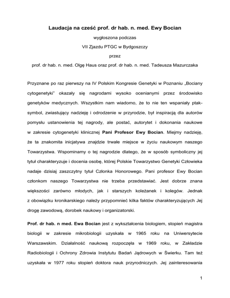 Laudacja na cześć prof. dr hab. n. med. Ewy Bocian wygłoszona podczas VII Zjazdu PTGC w Bydgoszczy przez prof. dr hab. n. med. Olgę Haus oraz prof. dr hab. n. med. Tadeusza Mazurczaka Przyznane po raz pierwszy na IV Polskim Kongresie Genetyki w Poznaniu „Bociany cytogenetyki” okazały się nagrodami wysoko ocenianymi przez środowisko genetyków medycznych. Wszystkim nam wiadomo, że to nie ten wspaniały ptaksymbol, zwiastujący nadzieję i odrodzenie w przyrodzie, był inspiracją dla autorów pomysłu ustanowienia tej nagrody, ale postać, autorytet i dokonania naukowe w zakresie cytogenetyki klinicznej Pani Profesor Ewy Bocian. Miejmy nadzieję, że ta znakomita inicjatywa znajdzie trwałe miejsce w życiu naukowym naszego Towarzystwa. Wspominamy o tej nagrodzie dlatego, że w sposób symboliczny jej tytuł charakteryzuje i docenia osobę, której Polskie Towarzystwo Genetyki Człowieka nadaje dzisiaj zaszczytny tytuł Członka Honorowego. Pani profesor Ewy Bocian członkom naszego Towarzystwa nie trzeba przedstawiać. Jest dobrze znana większości zarówno młodych, jak i starszych koleżanek i kolegów. Jednak z obowiązku kronikarskiego należy przypomnieć kilka faktów charakteryzujących Jej drogę zawodową, dorobek naukowy i organizatorski. Prof. dr hab. n med. Ewa Bocian jest z wykształcenia biologiem, stopień magistra biologii w zakresie mikrobiologii uzyskała w 1965 roku na Uniwersytecie Warszawskim. Działalność naukową rozpoczęła w 1969 roku, w Zakładzie Radiobiologii i Ochrony Zdrowia Instytutu Badań Jądrowych w Świerku. Tam też uzyskała w 1977 roku stopień doktora nauk przyrodniczych. Jej zainteresowania 1 naukowe i tematyka badawcza w tym okresie dotyczyły mechanizmu powstawania, naprawy i modyfikacji popromiennych uszkodzeń komórek ssaków, ze szczególnym uwzględnieniem aberracji chromosomowych. Gdy w 1984 roku, w wyniku ówczesnych zawirowań politycznych, Zakład, w którym pracowała, został zlikwidowany, dr Ewa Bocian podjęła pracę w Zakładzie Genetyki Medycznej Instytutu Matki i Dziecka, w którym pracuje do chwili obecnej. Przez wiele lat kierowała zespołem pracowni cytogenetycznych. Ponadto była zastępcą, a od 2011 do 2013 roku kierownikiem całego Zakładu Genetyki Medycznej. Prowadzone przez Panią prof. Ewę Bocian badania dotyczyły pre- i postnatalnej identyfikacji i charakterystyki aberracji chromosomowych, różnorodnych technik cytogenetyki klasycznej i z wykorzystaniem molekularnej. W aspekcie praktycznym ich wyniki służyły diagnostyce klinicznej zespołów chromosomowych, szczególnie zespołów mikrodelecji i chorób genomowych. Natomiast poznawczym ze – badaniu szczególnym etiologii i uwzględnieniem patomechanizmu idiopatycznych chorób w aspekcie genetycznych, postaci zaburzeń neurorozwojowych, w tym przede wszystkim niepełnosprawności intelektualnej oraz wrodzonych wad rozwojowych. Efektem Jej działalności badawczej było uzyskanie w 1998 roku stopnia doktora habilitowanego nauk medycznych w zakresie biologii medycznej, a w 2005 roku tytułu profesora. Doświadczenie naukowe zdobywała prof. Bocian w brytyjskich ośrodkach naukowych, między innymi w Glasgow Institute of Radiotherapeutics and Oncology oraz w Duncan Guthrie Institute of Medical Genetics w Glasgow. Kierowała licznymi projektami badawczymi MNiSW, była promotorem trzech prac doktorskich, a Jej aktualny dorobek naukowy obejmuje ponad 100 publikacji, których znaczna część ukazała się w renomowanych anglojęzycznych czasopismach naukowych. 2 Współpracowała z jednym z najlepszych amerykańskich ośrodków genetyki medycznej, jakim jest Baylor College of Medicine w Houston, zapewniając dzięki temu nie tylko szkolenie wielu polskich cytogenetyków w zakresie najnowszych technik analizy genomu, ale także wysoki poziom wspólnych prac badawczych prowadzonych w Zakładzie. Działalność badawcza prof. Bocian zawsze związana była z doskonaleniem metod cytogenetycznej diagnostyki chorób genetycznych i wdrażaniem do praktyki nowych procedur i testów diagnostycznych. Jako jedna z pierwszych w kraju wprowadziła do diagnostyki cytogenetycznej metody cytogenetyki molekularnej (FISH, HR-CGH, MLPA, aCGH). Jako pierwsza w Polsce zastosowała metodę cytogenetycznej diagnostyki zespołu FRAX, test subtelomerowy oraz wprowadziła HR-CGH i aCGH do rutynowej diagnostyki klinicznej. Dokonania w tym zakresie stanowiły podstawę do uznania kierowanych przez prof. Ewę Bocian Pracowni Cytogenetyki za wiodące i referencyjne w zakresie stosowania najnowocześniejszych metod diagnostyki cytogenetycznej dla potrzeb klinicznych. Pracownie Cytogenetyki kierowane przez prof. Bocian były i są miejscem indywidualnych szkoleń oraz kursów w zakresie nowych metod cytogenetyczno-molekularnej analizy genomu. Oprócz wdrażania nowych metod, Pani Profesor dążyła też do ich upowszechnienia, m.in. poprzez obniżenie cen, tak aby były dostępne dla wszystkich potrzebujących pacjentów poradni genetycznych w całym kraju. Ważnym i godnym podkreślenia elementem działalności prof. Ewy Bocian była dbałość o wysoki standard badań diagnostycznych wykonywanych w Pracowniach. Jej wyrazem było wprowadzenie tych badań, po raz pierwszy w Polsce, do brytyjskiego systemu zewnętrznej kontroli jakości NEQAS. Trzeba także podkreślić Jej aktywne uczestnictwo w pracach Krajowej Izby Diagnostów Laboratoryjnych, 3 dotyczących organizacji i standaryzacji procedur diagnostycznych z zakresu laboratoryjnej genetyki medycznej. Była konsultantem przy opracowywaniu programu specjalizacji z laboratoryjnej genetyki medycznej, jest ekspertem CMKP w sprawach tej specjalizacji oraz egzaminatorem CEM. Kierowała też zespołem ekspertów ds. cytogenetyki, opracowujących zasady certyfikacji laboratoriów diagnostycznych przez PTGC. Efektem działalności dydaktycznej prof. E. Bocian są materiały szkoleniowe z zakresu metodyki badań cytogenetycznych, wydane