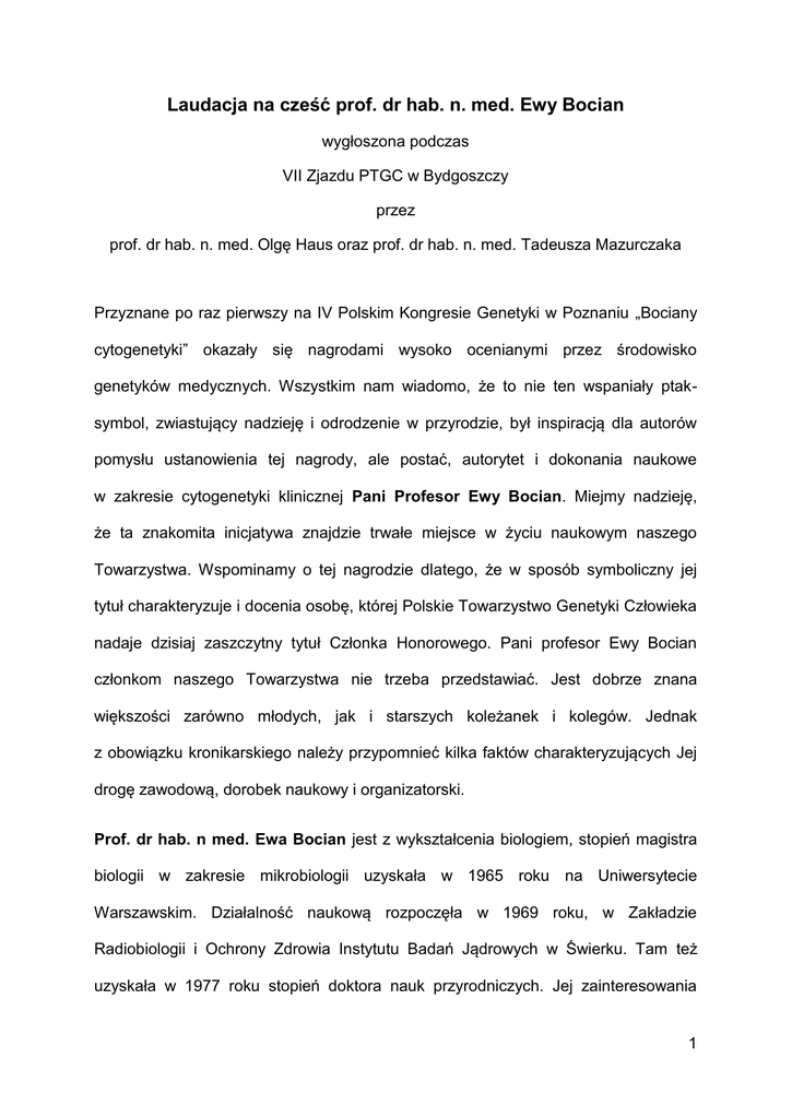 Laudacja - Polskie Towarzystwo Genetyki Człowieka