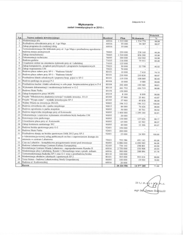 Załącznik Nr 4 Wykonanie ~- zadań inwestycyjnych w 2010 r. . :::::=::;::::::: ··<~H<n 1 2 3 ~ ••••••••• <~~~~~~~~~:~:: Modernizacja ulic Rozbudowa odwodnienia przy ul. l-go Maja Zakup programu do ewidencji dróg Termomodernizacja filii biblioteki przy ul. 3-go Maja z przebudową ogrodzenia i 4 budową miejsc postojowych 5 Zakup nieruchomości 6 Dokumentacje techniczne 7 Budowa grobów 8 Urządzenie zieleni na cmentarzu żydowski przy ul. Lubelskiej 9 Zakup komputerów, urządzeń peryferyjnych i programów komputerowych 10 Zakup wyposażenia UM Budowa placu zabaw przy SP-l - "Radosna Szkoła" ~ozil~i~ł 60016 60016 60016 ••• L 1 535000 95000 55000 Unu ~(~ ~:;;:;:;::::::; W~l!i!z~i!i.·· rc::~ ~ ~ ~ ~) W~~~iiiii~ 1 534774 94587 99,99 99,57 - - 70005 70005 70095 71035 71035 75023 75023 80101 250000 1 530000 300000 116000 135000 50000 70000 10000 7410 74,10 80101 230900 230830 99,97 13 Przebudowa klatek schodowych i poprawa bezp. p/poż w SP-3 80101 119550 108069 90,40 14 Budowa parkingu na posesj i P-2 80104 12 Budowa placu zabaw przy SP-3 - "Radosna Szkoła" 15 Przebudowa kuchni i klatki schodowej w celu po pr. bezpieczeństwa 16 Wykonanie dokumentacji p/poż. w P-4 i modernizacja kotłowni w G-2 10 000 22758 95,26 55,96 54,98 65,46 45,52 - 9989 99,89 80104 202400 199 585 98,61 436719 98,86 80110 441752 17 Budowa Skate Parku 85154 150000 18 Zakup komputerów przez MOPS 85219 inwestyc. fiLO 238 160 856200 164 942 75931 8 100 - - 8099 99,99 43,97 19 Projek1 "Młodzieżowa akademia rozwoju"-wydatki 85395 57900 25461 20 Projek1 "Wyspa szans" - wydatki inwestycyjne SP-3 85395 57900 49838 86,08 21 Wpłaty Miasta na inwestycje ZKGZL 90002 196312 196312 100,00 22 Budowa oświetlenia ulic i parku miejskiego 90015 84000 74626 88,84 23 Budowa ogrodzenia w parku miejskim 90095 50000 49761 99,52 24 Budowa targowiska miejskiego przy ul Kościuszki 90095 1400000 25 Dokumentacja i częściowe wykonanie oświetlenia bryły budynku UM 90095 20000 26 Renowacja rowu parkowego 90095 130000 127626 27 Utwardzenie placu przy ul. Kościuszki 90095 65000 63942 98,37 28 Zakup kontenera sanitarnego WC 90095 40000 33306 83,27 29 Budowa boiska sportowego przy G-2 92601 350000 Budowa Skate Parku - 30 92601 200000 - 31 Przebudowa skarpy na boisku sportowym Orlik 2012 przy SP-3 92601 25000 32 e-Administracja-rozwój usług publicznych on-line z zapewnieniem internetu w centrum Lubartowa 33 34 35 36 37 38 39 40 92,81 - 98,17 24999 100,00 dostępu do Czas na Lubartów - kompleksowe przygotowanie terenó pod inwestycje Budowa Lubartówskiego Centrum Kultury Europejskiej Rewitalizacja Centrum Miasta Lubartowa - zagospodarowanie Rvneku II Modernizacja ulicy Lubelskiej, Rynek I i Słowackiego wraz z przeb. infrastr. Termomodernizacja budynku SP-l oraz G-l wraz z przebudową boiska Modernizacja obiek1ów szkolnych i sportowych SP-3 Teraz biznes - budowa Lubartowskiei Strefv Gospodarczej Budowa ul. Kozłowieckiej Razem 1 299340 75023 90095 92105 60016 60016 80110 80101 90095 60016 752586 6886044 736 142 2750000 500000 100000 505000 100000 491 143 6490949 298801 550908 288896 503414 19930 65,26 94,26 40,59 20,03 57,78 99,69 19,93 20000 20334586 14577 305 71,69