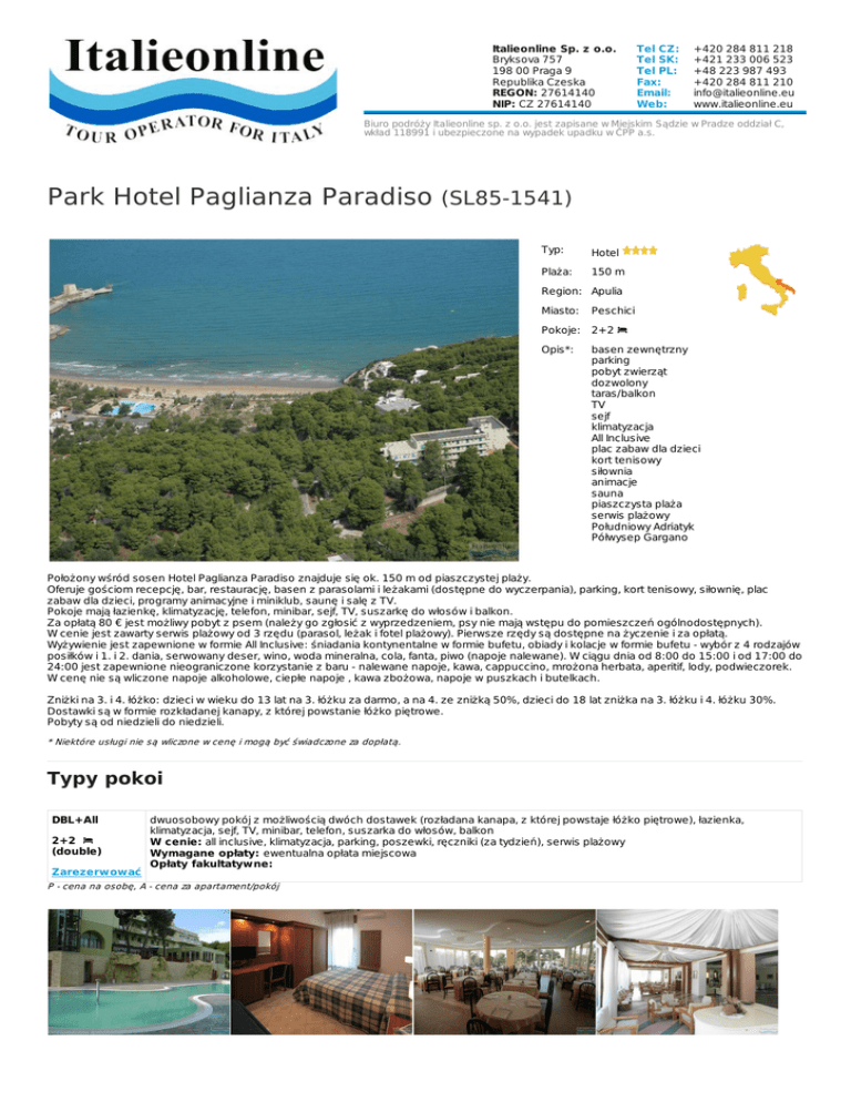 Italieonline Sp. z o.o. Bryksova 757 198 00 Praga 9 Republika Czeska REGON: 27614140 NIP: CZ 27614140 Tel CZ: Tel SK: Tel PL: Fax: Email: Web: +420 284 811 218 +421 233 006 523 +48 223 987 493 +420 284 811 210 [email protected] www.italieonline.eu Biuro podróży Italieonline sp. z o.o. jest zapisane w Miejskim Sądzie w Pradze oddział C, wkład 118991 i ubezpieczone na wypadek upadku w ČPP a.s. Park Hotel Paglianza Paradiso (SL85-1541) Typ: Hotel Plaża: 150 m Region: Apulia Miasto: Peschici Pokoje: 2+2 Opis*: basen zewnętrzny parking pobyt zwierząt dozwolony taras/balkon TV sejf klimatyzacja All Inclusive plac zabaw dla dzieci kort tenisowy siłownia animacje sauna piaszczysta plaża serwis plażowy Południowy Adriatyk Półwysep Gargano Położony wśród sosen Hotel Paglianza Paradiso znajduje się ok. 150 m od piaszczystej plaży. Oferuje gościom recepcję, bar, restaurację, basen z parasolami i leżakami (dostępne do wyczerpania), parking, kort tenisowy, siłownię, plac zabaw dla dzieci, programy animacyjne i miniklub, saunę i salę z TV. Pokoje mają łazienkę, klimatyzację, telefon, minibar, sejf, TV, suszarkę do włosów i balkon. Za opłatą 80 € jest możliwy pobyt z psem (należy go zgłosić z wyprzedzeniem, psy nie mają wstępu do pomieszczeń ogólnodostępnych). W cenie jest zawarty serwis plażowy od 3 rzędu (parasol, leżak i fotel plażowy). Pierwsze rzędy są dostępne na życzenie i za opłatą. Wyżywienie jest zapewnione w formie All Inclusive: śniadania kontynentalne w formie bufetu, obiady i kolacje w formie bufetu - wybór z 4 rodzajów posiłków i 1. i 2. dania, serwowany deser, wino, woda mineralna, cola, fanta, piwo (napoje nalewane). W ciągu dnia od 8:00 do 15:00 i od 17:00 do 24:00 jest zapewnione nieograniczone korzystanie z baru - nalewane napoje, kawa, cappuccino, mrożona herbata, aperitif, lody, podwieczorek. W cenę nie są wliczone napoje alkoholowe, ciepłe napoje , kawa zbożowa, napoje w puszkach i butelkach. Zniżki na 3. i 4. łóżko: dzieci w wieku do 13 lat na 3. łóżku za darmo, a na 4. ze zniżką 50%, dzieci do 18 lat zniżka na 3. łóżku i 4. łóżku 30%. Dostawki są w formie rozkładanej kanapy, z której powstanie łóżko piętrowe. Pobyty są od niedzieli do niedzieli. * Niektóre usługi nie są wliczone w cenę i mogą być świadczone za dopłatą. Typy pokoi DBL+All 2+2 (double) Zarezerwować dwuosobowy pokój z możliwością dwóch dostawek (rozładana kanapa, z której powstaje łóżko piętrowe), łazienka, klimatyzacja, sejf, TV, minibar, telefon, suszarka do włosów, balkon W cenie: all inclusive, klimatyzacja, parking, poszewki, ręczniki (za tydzień), serwis plażowy Wymagane opłaty: ewentualna opłata miejscowa Opłaty fakultatywne: P - cena na osobę, A - cena za apartament/pokój Prezentowane zdjęcia są przykładowe. DBL+All 2+2 Sezon (double) Terminy Cena za noc / P Początek pobytu Koniec pobytu Min. ilość nocy A 28.05. - 17.06.2017 10.09. - 17.09.2017 303 zł Ndz Ndz 7 B 18.06. - 01.07.2017 03.09. - 09.09.2017 352 zł Ndz Ndz 7 C 02.07. - 29.07.2017 27.08. - 02.09.2017 451 zł Ndz Ndz 7 D 30.07. - 05.08.2017 501 zł Ndz Ndz 7 E 06.08. - 12.08.2017 20.08. - 26.08.2017 567 zł Ndz Ndz 7 F 13.08. - 19.08.2017 655 zł Ndz Ndz 7 https://www.italieonline.eu/pl/peschici/park-hotel-paglianza-paradiso-1541.html www.ITALIEONLINE.eu TOUR OPERATOR FOR ITALY