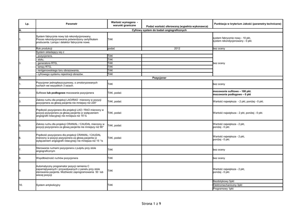 Parametr Lp. Wartość wymagana warunki graniczne Podać wartość oferowaną (wypełnia wykonawca) Cyfrowy system do badań angiograficznych A. 1. 2. 3. System fabrycznie nowy lub rekondycjonowany. Proces rekondycjonowania potwierdzony certyfikatem producenta. Lampa i detektor fabrycznie nowe. Rok produkcji System składający się z: - pozycjonera, - stołu, - generatora RTG, - lampy RTG, - rentgenowskiego toru obrazowania, - cyfrowego systemu rejestracji obrazów. system fabrycznie nowy - 10 pkt, system rekondycjonowany - 0 pkt. TAK podać 2012 TAK TAK TAK TAK TAK TAK B. Punktacja w kryterium Jakość (parametry techniczne) bez oceny bez oceny Pozycjoner 1. Pozycjoner jednopłaszczyznowy, o zmotoryzowanych ruchach we wszystkich 3 osiach. TAK bez oceny 2. Sufitowe lub podłogowe mocowanie pozycjonera TAK, podać mocowanie sufitowe – 100 pkt. mocowanie podłogowe – 0 pkt 3. Zakres ruchu dla projekcji LAO/RAO mierzony w pozycji pozycjonera za głową pacjenta nie mniejszy niż 220° TAK, podać Wartość największa - 2 pkt, poniżej - 0 pkt. 4. Prędkość pozycjonera dla projekcji LAO / RAO mierzony w pozycji pozycjonera za głową pacjenta (z wyłączeniem angiografii rotacyjnej) nie mniejsza niż 15°/s TAK, podać Wartość największa - 2 pkt, poniżej - 0 pkt. 5. Zakres ruchu dla projekcji CRANIAL / CAUDAL mierzony w pozycji pozycjonera za głową pacjenta nie mniejszy niż 90° TAK, podać Wartość największa - 2 pkt, poniżej - 0 pkt. 6. Prędkość pozycjonera dla projekcji CRANIAL / CAUDAL mierzony w pozycji pozycjonera za głową pacjenta (z wyłączeniem angiografii rotacyjnej) nie mniejsza niż 15 °/s TAK, podać Wartość największa - 2 pkt, poniżej - 0 pkt. 7. Sterowanie ruchami pozycjonera z pulpitu przy stole angiograficznym TAK bez oceny 8. Współbieżność ruchów pozycjonera TAK bez oceny 9. Automatyczny programator pozycji ramienia C zapamiętywanych i przywoływanych z panelu przy stole sterowania pacjenta. Możliwość zaprogramowania 50 lub wiecej pozycji TAK Wartość największa - 2 pkt, poniżej - 0 pkt. 10. System antykolizyjny TAK Bezdotykowy 5pkt Elektromechaniczny 3pkt Programowy 1pkt Strona 1 z 9 11. Wyświetlacz danych systemowych w sali badań (minimalny zakres: LAO/RAO, CRANIAL / CAUDAL, SID) TAK, podać bez oceny 12. Ręczne ustawianie statywu w pozycji parkingowej z wbudowanym hamulcem uruchamianym ręcznie Podać TAK - 3 pkt Nie - 0 pkt C. Stół 1. Mocowanie stołu na podłodze TAK bez oceny 2. Obciążenie stołu statyczne nie mniejsze niż 200 kg TAK, podać bez oceny 3. Dodatkowe obciążenie stołu podczas akcji reanimacyjnej nie TAK, podać mniejsze niż 50 kg bez oceny 4. Szerokość płyty pacjenta nie mniejsza niż 46 cm TAK, podać wartość graniczna – 0 pkt. każdy dodatkowy centymetr – 10 pkt. 5. Zakres ruchu poprzecznego płyty pacjenta nie mniejszy niż 27 cm TAK, podać Wartość największa - 5 pkt, poniżej - 0 pkt. 6. Zakres zmotoryzowanego ruchu pionowego stołu nie mniejszy niż 28 cm TAK, podać Wartość największa – 2 pkt, poniżej - 0 pkt. Wyposażenie stołu min: - materac, - podkładka pod głowę pacjenta, 7. TAK TAK - podkładka pod ramię i przedramię pacjenta umożliwiająca wykonanie badań z dostępu radialnego, TAK - statyw na płyny infuzyjne (anestetyczny), TAK bez oceny - podkładki pod ręce pacjenta wzdłuż tułowia przepuszczalne TAK dla promieniowania 8. Sterowanie wszystkimi ruchami ramienia C, stołu i kolimatora TAK możliwe bezpośrednio przy stole pacjenta. bez oceny 9. Sterowanie wszystkimi trybami fluoroskopii i akwizycji możliwe bezpośrednio przy stole pacjenta. TAK bez oceny 10. Sterowanie zapisem obrazów fluoroskopowych możliwe bezpośrednio przy stole pacjenta. TAK bez oceny 11. Sterowanie funkcjami angiografu z panelu dotykowego z minimalnym zakresem funkcjonalności obejmującym sterowanie systemem rejestracji obrazów. TAK bez oceny Strona 2 z 9 Za 12. Mocowanie przy stole badań paneli sterowania po obu stronach. 13. Zakres badania bez konieczności przemieszczania pacjenta TAK, podać na stole ≥ 180 cm, Wartość największa – 4 pkt, poniżej - 0 pkt. 14. Zakres obrotu stołu wokół osi pionowej ≥ 240° TAK, podać Wartość największa – 4 pkt, poniżej - 0 pkt. 15. Długość blatu ≥ 220 cm TAK, podać Wartość największa – 4 pkt, poniżej - 0 pkt. 16. Zakres ruchu wzdłużnego płyty pacjenta ≥ 120 cm, TAK, podać Wartość największa – 2 pkt, poniżej - 0 pkt. 17. Zmotoryzowany ruch wzdłużny płyty pacjenta Podać Wartość największa – 2 pkt, poniżej - 0 pkt. 18. Pochłanialność blatu stołu pacjenta dla całej jego długości – przezierność nie większa niż ekwiwalent 1,4mm Al. TAK Wartość najmniejsza – 5 pkt, Powyżej - 0 pkt. TAK D. bez oceny Generator RTG 1. Moc wyjściowa generatora nie mniejsza niż 100 kW TAK, podać bez oceny 2. Zakres napięcia kV dla radiografii - 50 - 125 kV TAK, podać bez oceny 3. Zakres napięcia kV dla fluoroskopii - 60 - 120 kV TAK, podać bez oceny 4. Programy anatomiczne TAK bez oceny 5. Włącznik ekspozycji (pedał) w sali badań. Minimum 3 przyciski, TAK, podać brak możliwości programowania minimum jednego przycisku – 0 pkt. Możliwości programowania minimum jednego przycisku – 5 pkt. 6. Zabezpieczenie generatora przed przypadkowym wyzwoleniem promieniowania – w sali badań TAK bez oceny 7. Czas gotowości do uzyskania obrazu fluoroskopii po restarcie systemu to jest generatora i systemu komputerowego nie większy niż 300s. TAK, podać Wartość najmniejsza – 5 pkt, Powyżej - 0 pkt. 1. Lampa rentgenowska z wirująca anodą TAK, podać producenta i model bez oceny 2. Lampa rentgenowska co najmniej 2 ogniskowa TAK, podać min 2 pkt - punktacja za dodatkowe ogniska - każde ognisko 1 pkt E. Lampa RTG Strona 3 z 9 3. Moc największego ogniska lampy ≥ 65 kW, TAK, podać Wartość największa – 2 pkt, poniżej - 0 pkt. 4. Wielkość największego ogniska ≤1,0 mm TAK, podać bez