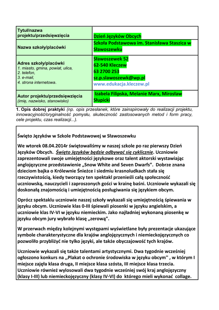 Tytuł/nazwa projektu/przedsięwzięcia Nazwa szkoły/placówki Adres szkoły/placówki 1. miasto, gmina, powiat, ulica, 2. telefon, 3. e-mail, 4. strona internetowa. Autor projektu/przedsięwzięcia (imię, nazwisko, stanowisko) Dzień Języków Obcych Szkoła Podstawowa im. Stanisława Staszica w Sławoszewku Sławoszewek 52 62-540 Kleczew 63 2700 253 [email protected] www.edukacja.kleczew.pl Izabela Filipska, Melanie Marx, Mirosław Słupicki 1. Opis dobrej praktyki (np. opis przesłanek, które zainspirowały do realizacji projektu, innowacyjność/oryginalność pomysłu, skuteczność zastosowanych metod i form pracy, cele projektu, czas realizacji...). Święto Języków w Szkole Podstawowej w Sławoszewku We wtorek 08.04.2014r świętowaliśmy w naszej szkole po raz pierwszy Dzień Języków Obcych. Święto Języków będzie odbywać się cyklicznie. Uczniowie zaprezentowali swoje umiejętności językowe oraz talent aktorski wystawiając anglojęzyczne przedstawienie „Snow White and Seven Dwarfs”. Dobrze znana dzieciom bajka o Królewnie Śnieżce i siedmiu krasnoludkach stała się rzeczywistością, kiedy tworzący ten spektakl przenieśli całą społeczność uczniowską, nauczycieli i zaproszonych gości w krainę baśni. Uczniowie wykazali się doskonałą znajomością i umiejętnością posługiwania się językiem obcym. Oprócz spektaklu uczniowie naszej szkoły wykazali się umiejętnością śpiewania w języku obcym. Uczniowie klas 0-III śpiewali piosenki w języku angielskim, a uczniowie klas IV-VI w języku niemieckim. Jako najładniej wykonaną piosenkę w języku obcym jury wybrało klasę „zerową”. W przerwach między kolejnymi występami wyświetlane były prezentacje ukazujące symbole charakterystyczne dla krajów anglojęzycznych i niemieckojęzycznych co pozwoliło przybliżyć nie tylko języki, ale także obyczajowość tych krajów. Uczniowie wykazali się także talentami artystycznymi. Dwa tygodnie wcześniej ogłoszono konkurs na ,,Plakat o ochronie środowiska w języku obcym'' , w którym I miejsce zajęła klasa druga, II miejsce klasa szósta, III miejsce klasa trzecia. Uczniowie również wylosowali dwa tygodnie wcześniej swój kraj anglojęzyczny (klasy I-III) lub niemieckojęzyczny (klasy IV-VI) do którego mieli wykonać collage. Tutaj I miejsce zajęła ponownie klasa druga, II miejsce klasa trzecia i III miejsce klasa czwarta. Trudnym zadaniem było dla uczniów wymyślenie hasła w języku obcym promującego języki obce, lecz bez wątpienia klasa trzecia dała sobie doskonalę radę z tym zadaniem. Wszystkim aktorom gratulujemy talentu aktorskiego, a także zdolności lingwistycznych, mamy nadzieje że jeszcze nie raz będziemy mieli okazję podziwiać was na scenie. Wszystkim uczestnikom dziękujemy i życzymy więcej szczęścia w przyszłorocznych konkursach. Dziękujemy także opiekunom, którzy czuwali nad organizacją i przebiegiem tego wydarzenia. Dzień ten był miłą odmianą od tradycyjnych lekcji. Jak mogliśmy zobaczyć, nauka języków wcale nie musi być nudna. Liczymy, że uda się zorganizować więcej takich atrakcji w naszej szkole. 2. Rezultaty/korzyści projektu (efekty, które powstały w wyniku realizacji projektu). Uświadomienie uczniom jak ważna jest nauka i znajomość języków obcych we współczesnym świecie. Uczniowie poznali kulturę, literaturę dziecięcą i obyczaje panujące w krajach, których języków się uczą.