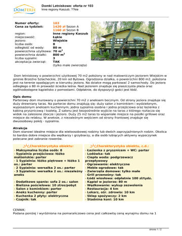Domki Letniskowe: oferta nr 103 Inne regiony Kaszub; ??kie Numer oferty: Cena za tydzień: 103 1420 zł Sezon A 1160 zł Sezon B region: Inne regiony Kaszub miejscowość: Łąkie jezioro: Wiejskie liczba osób: 8 odległość od wody: 80 m powierzchnia użytkowa: 70 m2 powierzchnia działki: 800 m2 liczba sypialni: 3 akceptacja zwierząt: TAK (tylko małe zwierzęta) Dom letniskowy o powierzchni użytkowej 70 m2 położony w nad malowniczym jeziorem Wiejskim w gminie Brzeźno Szlacheckie, 20 km od Bytowa. Ogrodzona działka, o powierzchni 800 m2, położona jest na terenie opadającym w kierunku jeziora. Na działce mogą parkować 2 samochody. Do jeziora odległego o 80 m prowadzi ścieżka leśna. Nad jeziorem znajduje się piaszczysta plaża oraz ogólnodostępne kąpielisko z pomostami. Odpłatnie, do dyspozycji gości jest łódź. Opis domu Parterowy dom murowany o powierzchni 70 m2 z aneksem bocznym. Od strony jeziora znajduje się duży drewniany taras. Na parterze domu znajdują się: duży salon z kominkiem i wydzielonym, wyposażonym aneksem kuchennym; jedna sypialnia osobna i jedna przejściowa oraz łazienka z kabiną prysznicową i toaletą. Z salonu jest bezpośrednie wyjście na taras z którego roztacza się widok na zalesione zbocze i jezioro. Duży 25 m2 taras to wspaniałe miejsce na posiłki grillowe oraz miejsce do relaksu. W aneksie, z niezależnym wejściem od strony frontowej znajduje się dwuosobowy pokój - sypialnia. Atrakcje Dom stanowi idealne miejsce dla wieloosobowej rodziny lub dwóch zaprzyjaźnionych rodzin. Okolica to bardzo dobre miejsce dla wędkarzy i grzybiarzy, a dla osób lubiących aktywny wypoczynek polecane jest zabranie rowerów. Charakterystyka obiektu: - Maksymalna liczba osób: 8 - Sypialnia przejściowa: łóżko małżeńskie: parter - 1 Sypialnia: łóżko piętrowe + łóżko 1 os.: parter - 2 Sypialnia: wersalka 2 os.: parter - 3 Sypialnia: wersalka 2 os.: niezależny aneks - Dodatkowe spanie: sofa 2 os.: salon Bielizna pościelowa: 10 zł/os/pobyt Salon z kominkiem: parter Aneks kuchenny: parter Kuchenka 2 płyty: elektryczna Czajnik: tak Charakterystyka obiektu, c.d.: - Łazienka z prysznicem + WC: parter - Lodówka: tak - Ciepła woda: podgrzewacz przepływowy - Ogrzewanie: elektryczne - Meble ogrodowe: tak - Zwierzęta domowe: tylko małe - Grill przenośny: tak - Łódź wiosłowa: odpłatnie 100 zł/tydz. - Kąpiel w jeziorze: 80 m - Wędkowanie: wykup zezwolenia - Restauracja: 4 km - Lekarz, ośr. zdrowia: 10 km - Sklep spożywczy: 2 km - Stadnina koni: 10 km CENNIK: Podana poniżej i wyróżniona na pomarańczowo cena jest całkowitą ceną wynajmu domu na 1 strona 1 / 2 Domki Letniskowe: oferta nr 103 Inne regiony Kaszub; ??kie tydzień - od soboty do soboty (zawiera w sobie kwotę rezerwacji i zaliczki). Dodatkowo dolicza się podane niżej opłady obowiązkowe i/lub nieobowiązkowe. Sezon A Sezon B TYLKO Weekendy: 25.06. - 20.08.2011. Poza sezonem A 29.04 - 03.05 (4 doby) wynajem za 1 tydzień w tym: 1420 zł/tydz 1160 zł/tydz 900 zł za 3 doby 1100 zł za 4 doby - rezerwacja 300 zł/tydz 249 zł/tydz 300 zł/pobyt - zaliczka 200 zł/tydz 200 zł/tydz 200 zł/pobyt OPŁATY DODATKOWE: 1. Zużycie energii elekt. wg wskazań licznika; koszt 60 gr. za 1 kWh. 2. Sprzątanie domu po zakończeniu turnusu 80 zł jeżeli najemca nie chce sam wykonać tej pracy 3. Drewno do kominka 1 wsad gratis, dodatkowa wiązka 30 zł 4. Wynajem łodzi 100 zł/tydzień (w przypadku krótszych wynajmów opłata jak za cały tydzień) 5. Bielizna pościelowa 10 zł/osoba/pobyt 6. Każde zwierzę 50 zł/tydzień (w przypadku krótszych wynajmów opłata jak za cały tydzień) KAUCJA 300 zł Kaucja, pobierana przez właściciela w momencie przekazania kluczy, jest zwracana najemcy po potrąceniu kwoty opłat dodatkowych oraz ewentualnych uzasadnionych kosztów szkód powstałych z jego winy. strona 2 / 2 Powered by TCPDF (www.tcpdf.org)