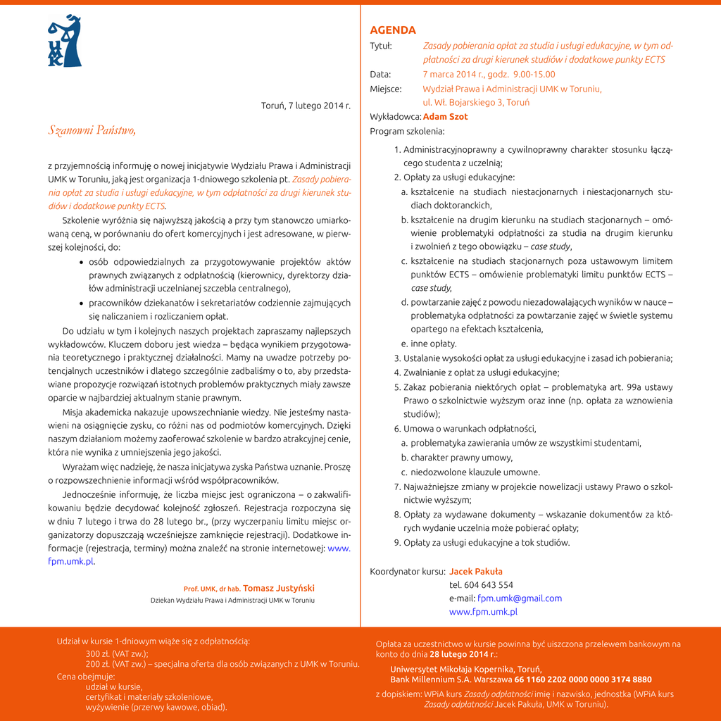 AGENDA Toruń, 7 lutego 2014 r. Tytuł: Zasady pobierania opłat za studia i usługi edukacyjne, w tym odpłatności za drugi kierunek studiów i dodatkowe punkty ECTS Data: 7 marca 2014 r., godz. 9.00-15.00 Miejsce: Wydział Prawa i Administracji UMK w Toruniu, ul. Wł. Bojarskiego 3, Toruń Wykładowca:Adam Szot Szanowni Państwo, Program szkolenia: z przyjemnością informuję o nowej inicjatywie Wydziału Prawa i Administracji UMK w Toruniu, jaką jest organizacja 1-dniowego szkolenia pt. Zasady pobierania opłat za studia i usługi edukacyjne, w tym odpłatności za drugi kierunek studiów i dodatkowe punkty ECTS. 1.Administracyjnoprawny a cywilnoprawny charakter stosunku łączącego studenta z uczelnią; 2.Opłaty za usługi edukacyjne: a.kształcenie na studiach niestacjonarnych i niestacjonarnych studiach doktoranckich, Szkolenie wyróżnia się najwyższą jakością a przy tym stanowczo umiarkowaną ceną, w porównaniu do ofert komercyjnych i jest adresowane, w pierwszej kolejności, do: b.kształcenie na drugim kierunku na studiach stacjonarnych – omówienie problematyki odpłatności za studia na drugim kierunku i zwolnień z tego obowiązku – case study, • osób odpowiedzialnych za przygotowywanie projektów aktów prawnych związanych z odpłatnością (kierownicy, dyrektorzy działów administracji uczelnianej szczebla centralnego), c. kształcenie na studiach stacjonarnych poza ustawowym limitem punktów ECTS – omówienie problematyki limitu punktów ECTS – case study, • pracowników dziekanatów i sekretariatów codziennie zajmujących się naliczaniem i rozliczaniem opłat. d.powtarzanie zajęć z powodu niezadowalających wyników w nauce – problematyka odpłatności za powtarzanie zajęć w świetle systemu opartego na efektach kształcenia, Do udziału w tym i kolejnych naszych projektach zapraszamy najlepszych wykładowców. Kluczem doboru jest wiedza – będąca wynikiem przygotowania teoretycznego i praktycznej działalności. Mamy na uwadze potrzeby potencjalnych uczestników i dlatego szczególnie zadbaliśmy o to, aby przedstawiane propozycje rozwiązań istotnych problemów praktycznych miały zawsze oparcie w najbardziej aktualnym stanie prawnym. Misja akademicka nakazuje upowszechnianie wiedzy. Nie jesteśmy nastawieni na osiągnięcie zysku, co różni nas od podmiotów komercyjnych. Dzięki naszym działaniom możemy zaoferować szkolenie w bardzo atrakcyjnej cenie, która nie wynika z umniejszenia jego jakości. Wyrażam więc nadzieję, że nasza inicjatywa zyska Państwa uznanie. Proszę o rozpowszechnienie informacji wśród współpracowników. Jednocześnie informuję, że liczba miejsc jest ograniczona – o zakwalifikowaniu będzie decydować kolejność zgłoszeń. Rejestracja rozpoczyna się w dniu 7 lutego i trwa do 28 lutego br., (przy wyczerpaniu limitu miejsc organizatorzy dopuszczają wcześniejsze zamknięcie rejestracji). Dodatkowe informacje (rejestracja, terminy) można znaleźć na stronie internetowej: www. fpm.umk.pl. Prof. UMK, dr hab. Tomasz Justyński Dziekan Wydziału Prawa i Administracji UMK w Toruniu Udział w kursie 1-dniowym wiąże się z odpłatnością: 300 zł. (VAT zw.); 200 zł. (VAT zw.) – specjalna oferta dla osób związanych z UMK w Toruniu. Cena obejmuje: udział w kursie, certyfikat i materiały szkoleniowe, wyżywienie (przerwy kawowe, obiad). e.inne opłaty. 3.Ustalanie wysokości opłat za usługi edukacyjne i zasad ich pobierania; 4.Zwalnianie z opłat za usługi edukacyjne; 5.Zakaz pobierania niektórych opłat – problematyka art. 99a ustawy Prawo o szkolnictwie wyższym oraz inne (np. opłata za wznowienia studiów); 6.Umowa o warunkach odpłatności, a.problematyka zawierania umów ze wszystkimi studentami, b.charakter prawny umowy, c. niedozwolone klauzule umowne. 7.Najważniejsze zmiany w projekcie nowelizacji ustawy Prawo o szkol nictwie wyższym; 8.Opłaty za wydawane dokumenty – wskazanie dokumentów za któ rych wydanie uczelnia może pobierać opłaty; 9.Opłaty za usługi edukacyjne a tok studiów. Koordynator kursu: Jacek Pakuła tel. 604 643 554 e-mail: [email protected] www.fpm.umk.pl Opłata za uczestnictwo w kursie powinna być uiszczona przelewem bankowym na konto do dnia 28 lutego 2014 r.: Uniwersytet Mikołaja Kopernika, Toruń, Bank Millennium S.A. Warszawa 66 1160 2202 0000 0000 3174 8880 z dopiskiem:WPiA kurs Zasady odpłatności imię i nazwisko, jednostka (WPiA kurs Zasady odpłatności Jacek Pakuła, UMK w Toruniu).