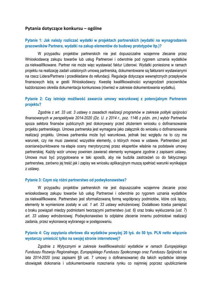 Pytania dotyczące konkursu – ogólne Pytanie 1: Jak należy rozliczać wydatki w projektach partnerskich (wydatki na wynagrodzenie pracowników Partnera, wydatki na zakup elementów do budowy prototypów itp.)? W przypadku projektów partnerskich nie jest dopuszczalne wzajemne zlecanie przez Wnioskodawcę zakupu towarów lub usług Partnerowi i odwrotnie pod rygorem uznania wydatków za niekwalifikowane. Partner nie może więc wystawiać faktur Liderowi. Wydatki poniesione w ramach projektu na realizację zadań ustalonych umową partnerską, dokumentowane są fakturami wystawianymi na rzecz Lidera/Partnera i przedkładane do refundacji. Regulacje dotyczące wewnętrznych przepływów finansowych leżą w gestii Wnioskodawcy. Kwestię kwalifikowalności wynagrodzeń pracowników każdorazowo określa dokumentacja konkursowa (również w zakresie dokumentowania wydatku). Pytanie 2: Czy istnieje możliwość zawarcia umowy warunkowej z potencjalnym Partnerem projektu? Zgodnie z art. 33 ust. 3 ustawy o zasadach realizacji programów w zakresie polityki spójności finansowanych w perspektywie 2014-2020 (Dz. U. z 2014 r., poz. 1146 z późn. zm.) wybór Partnerów spoza sektora finansów publicznych jest dokonywany przed złożeniem wniosku o dofinansowanie projektu partnerskiego. Umowa partnerska jest wymagana jako załącznik do wniosku o dofinansowanie realizacji projektu. Umowa partnerska może być warunkowa, jednak bez względu na to czy ma warunek, czy nie musi zawierać wszystkie elementy, o których mowa w ustawie. Partnerstwo jest oceniane/punktowane na etapie oceny merytorycznej przez ekspertów właśnie na podstawie umowy partnerskiej. Każdy wzór umowy powinien zawierać elementy wymagane zgodnie z zapisami ustawy. Umowa musi być przygotowana w taki sposób, aby nie budziła zastrzeżeń co do faktycznego partnerstwa, zarówno jej treść jak i zapisy we wniosku aplikacyjnym muszą spełniać warunki wynikające z ustawy. Pytanie 3: Czym się różni partnerstwo od podwykonawstwa? W przypadku projektów partnerskich nie jest dopuszczalne wzajemne zlecanie przez wnioskodawcę zakupu towarów lub usług Partnerowi i odwrotnie po rygorem uznania wydatków za niekwalifikowane. Partnerstwo jest sformalizowaną formą współpracy podmiotów, które coś łączy, elementy te wymienione zostały w ust. 1 art. 33 ustawy wdrożeniowej. Dodatkowo trzeba pamiętać o braku powiązań miedzy podmiotami tworzącymi partnerstwo (ust. 6) oraz braku wykluczenia (ust. 7) art. 33 ustawy wdrożeniowej. Podwykonawstwo to odpłatne zlecenie innemu podmiotowi realizacji zadania, przez wykonawcę wybranego w postępowaniu. Pytanie 4: Czy zapytania ofertowe dla wydatków powyżej 20 tyś. do 50 tys. PLN netto włącznie wystarczy umieścić tylko na swojej stronie internetowej? Zgodnie z Wytycznymi w zakresie kwalifikowalności wydatków w ramach Europejskiego Funduszu Rozwoju Regionalnego, Europejskiego Funduszu Społecznego oraz Funduszu Spójności na lata 2014-2020 (oraz zapisami §9 ust. 7 umowy o dofinansowanie) dla takich wydatków istnieje obowiązek dokonania i udokumentowania rozeznania rynku co najmniej poprzez upublicznienie zapytania ofertowego na stronie internetowej Beneficjenta lub innej powszechnie dostępnej stronie przeznaczonej do umieszczania zapytań ofertowych w celu wybrania najkorzystniejszej oferty. Pytanie 5: W jaki sposób wypełnić obowiązek publikacji ogłoszenia w Bazie Konkurencji Funduszy Europejskich dla zamówienia przekraczającego 50 tys. zł netto jeżeli nie jest podpisana umowa o dofinansowanie projektu będąca warunkiem wpisu do Bazy? Zgodnie z zapisami Wytycznych w zakresie kwalifikowalności wydatków w ramach Europejskiego Funduszu Rozwoju Regionalnego, Europejskiego Funduszu Społecznego oraz Funduszu Spójności na lata 2014-2020 z 10 kwietnia 2015 r., „(…) jeżeli Wnioskodawca rozpoczyna realizację projektu na własne ryzyko przed popisaniem umowy o dofinansowanie, w celu upublicznienia zapytania ofertowego powinien wysłać zapytanie ofertowe do co najmniej trzech potencjalnych wykonawców, o ile na rynku istnieje trzech potencjalnych wykonawców danego zamówienia publicznego oraz upublicznić to zapytanie co najmniej na stronie internetowej beneficjenta, o ile posiada taką stronę.” (strona 40 niniejszych wytycznych, przypis nr 37). Jeżeli Wnioskodawca nie ma możliwości upublicznienia zapytania ofertowego w Bazie Konkurencyjności Funduszy Europejskich, może dokonać wyboru Wykonawcy zachowując zasady konkurencyjności wskazane powyżej. Pytanie 6: Czy w przypadku, gdy szacowana wartość zamówienia wynosi około 30 tys. zł netto, gmina powinna upublicznić zapytanie ofertowe co najmniej na swojej stronie internetowej, pomimo nie podpisania umowy o dofinansowanie? Tak. W przypadku wydatków od 20 do 50 tys. zł istnieje obowiązek opublikowania zapytania ofertowego na stronie internetowej. Oczywiście nie istnieją przeciwwskazania, aby dokonać dodatkowego badania rynku poprzez wysłanie ofert do kilku wykonawców. Wytyczne w zakresie kwalifikowalności wydatków nie precyzują tego dokładnie, jednak nie istnieją podstawy do wymagania od Wnioskodawców większej liczby obowiązków niż od Beneficjentów. Pytanie 7: Czy zapytanie ofertowe dotyczące zamówienia o szacowanej wartości około 30 tys. zł netto, powinno zawierać wszystkie elementy, o których mowa w Rozdziale 6.5.3. Szczególne warunki realizacji zamówień publicznych udzielanych zgodnie z zasadą konkurencyjności, pkt 5) lit a) ppkt. i – viii Wytycznych w zakresie kwalifikowalności wydatków? Nie ma takiego obowiązku. Zapytanie ofertowe powinno zawierać wszystkie wymagane elementy zgodnie z zasadami konkurencyjności. W przypadku zamówienia o wartości od 20 do 50 tys. zł Wytyczne w zakresie kwalifikowalności wydatków nie precyzują zakresu ogłoszenia. Sugerowanie się zapisami Wytycznych odnoszących się do zamówień o większej wartości jest o