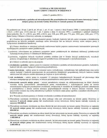 UCHWALA NR XIII/103/2015 RADY GMINY I MIAST A W DRZEWICY z dnia 31 grudnia 2015 r. w sprawie zwolnienia z podatku od nieruchomości dla przedsiębiorców tworzących nowe inwestycje i nowe miejsca pracy na terenie Gminy Drzewica w rama<;h pomocy de minimis N a podstawie art. 18 ust. 2 pkt 8, art. 40 ust. l, art. 41 ust. l ustawy z dnia 8 marca 1990r. o samorządzie gminnym ( Dz.U. z 2015 poz. 1515) oraz art. 7 ust. 3 ustawy z dnia 12 stycznia 199lr. o podatkach i opłatach lokalnych (tekst jednolity: Dz. U. z 2014r. poz. 849, z 2015r. poz. 528, poz. 699, poz. 774, poz. 1045, poz. 1283, poz. 1777); Rada Gminy i Miasta w Drzewicy uchwala, co następuje: § l. Zwalnia się z podatku od nieruchomości grunty, budynki, budowle lub ich części związane z działalnością na których podatnik zrealizuje nowe inwestycje lub na których stworzy nowe miejsca pracy z wyłączeniem działalności handlowej. gospodarczą § 2. Pomoc określona w niniejszej uchwale realizowana z przepisów ustaw podatkowych: będzie poprzez zastosowanie instrumentów prawnych wynikających --..-- l) podmioty zobowiązane wykazują kwotę na podstawie przepisów ustaw podatkowych do pomocy w składanych deklaracjach; składania deklaracji podatkowych 2) podmioty, względem których wysokość podatku ustalana jest w formie decyzji podatkowych, pomocy uwzględniają w składanych organowi podatkowemu informacjach o nieruchomościach. § 3. Ilekroć w uchwale wysokość używa się pojęcia: l) zwolnienia z podatku- należy przez to rozumieć zwolnienie z podatku od budowli lub ich części będących własnością przedsiębiorcy, nieruchomości gruntów, budynków, 2) nowa inwestycja - należy przez to rozumieć nowo wybudowane, rozbudowane lub nadbudowane oraz nowo nabyte budynki i budowle przeznaczone do prowadzenia działalności gospodarczej, których budowa została zakończona lub nabycie zostało dokonane po wejściu w życie uchwały, 3) rok zwolnienia - należy miesiąca następującego po przez to rozumieć miesiącu, w którym 12 miesięcy kalendarzowych liczonych od pierwszego dnia prawo do zwolnienia, przedsiębiorca nabył 4) utworzenie nowych miejsc pracy - wzrost zatrudnienia rozumie się udokumentowaną na dzień złożenia wniosku liczbę pracowników zatrudnionych przez wnioskodawcę i wykonujących pracę na terenie nieruchomości będących przedmiotem zwolnienia, zwiększoną w stosunku do średniego poziomu zatrudnienia u przedsiębiorcy z okresu sześciu miesięcy poprzedzających miesiąc w którym złożono wniosek. Przez pracownika rozumie się osobę zatrudnioną w pełnym wymiarze czasu pracy zgodnie z zasadami określonymi w Kodeksie pracy. § 4. Warunki uzyskania pomocy w formie zwolnienia z podatku od nieruchomości: l) Warunkiem uzyskania zwolnienia na okres jednego roku jest utworzenie na terenie gminy Drzewica co najmniej 5 nowych miejsc pracy lub zrealizowanie nowej inwestycji, której łączne nakłady wyniosły co najmniej 350.000 zł. 2) Warunkiem uzyskania zwolnienia na okres dwóch lat jest utworzenie na terenie gminy Drzewica co najmniej 10 nowych miejsc pracy lub zrealizowanie nowej inwestycji, której łączne nakłady wyniosły co najmniej 600.000 zł. 3) Warunkiem uzyskania zwolnienia na okres trzech latjest utworzenie na terenie gminy Drzewica co najmniej 20 nowych miejsc pracy lub zrealizowanie nowej inwestycji, której łączne nakłady wyniosły co najmniej 1.500.000 zł. 4) Warunkiem uzyskania zwolnienia na okres czterech latjest utworzenie na terenie gminy Drzewica co najmniej 30 nowych miejsc pracy lub zrealizowanie nowej inwestycji, której łączne nakłady wyniosły co najmniej 1.800.000 zł. Id : 4E43A9AF-4CDE-42BA-974C-6C l39810C815 . Podpisany Strona l 5) Zwolnienie, o którym mowa w pkt l , 2, 3, 4 stanowi pomoc de minimis zgodnie z Rozporządzeniem Komisji (UE) Nr 1407/2013 z dnia 18 grudnia 2013r w sprawie stosowania art. 107 i 108 Traktatu o funkcjonowaniu Uni Europejskiej do pomocy de minimis (Dz. Urz. UE L 352 z 24.12.2013r.). 6) Wartość pomocy de minimis przyznanej przedsiębiorcy na podstawie niniejszej uchwały wraz z wmiością pomocy de minimis udzielonej w innych formach i z innych źródeł w okresie 3 lat podatkowych nie może przekroczyć kwoty stanowiącej równowartość 200.000 euro brutto. 7) Wartość pomocy de minimis przyznanej przedsiębiorcy działającemu w sektorze transportu drogowego towarów na podstawie niniejszej uchwały wraz z wartością pomocy de minimis udzielonej w innych fonuach i z innych źródeł w okresie 3 lat podatkowych nie może przekroczyć kwoty stanowiącej równowartość l 00.000 euro brutto. 8) Jeżeli w okresie zwolnienia, o którym mowa w pkt l , 2, 3, 4 uchwały w pkt 6 i 7 uchwały , dalsze udzielenie pomocy jest nie dozwolone. wartość pomocy osiągnie pułap określony 9) Zwolnienie ma zastosowanie poniesiono udokumentowane wyłącznie nakłady do budynków, budowli i gruntów na których zakup lub wybudowanie inwestycyjne. l O) Zwolnienie będzie udzielane pod warunkiem, że działalność gospodarcza w nieruchomości objętej zwolnieniem prowadzona będzie przez cały okres zwolnienia oraz, że nieruchomość nie będzie w tym okresie wynajmowana, wydzierżawiana oraz zbyta. 11) Maksymalna pomoc udzielona podatnikowi nie może przekroczyć l 00% kosztów (wynagrodzenia i jego pochodne) w przypadku pomocy na tworzenie nowych miejsc pracy. 12) Zwolnienie będzie udzielane pod warunkiem, że nowo utworzone miejsca pracy będą zatrudnienia utrzymywane: a) w przypadku zwolnienia o którym mowa w §4 pkt l przez okres co najmniej 2 lat, b) w przypadku zwolnienia o którym mowa w §4 pkt 2 przez okres co najmniej 3 lat, c) w przypadku zwolnienia o którym mowa w §4 pkt 3 przez okres co najmniej 4lat, d) w przypadku zwolnienia o którym mowa w §4 pkt 4 przez okres co najmniej 5 lat, 13) Maksymalna pomoc udzielona podatnikowi nie pomocy na nową inwestycję. może przekroczyć § 5. l. Warunkiem nabycia
