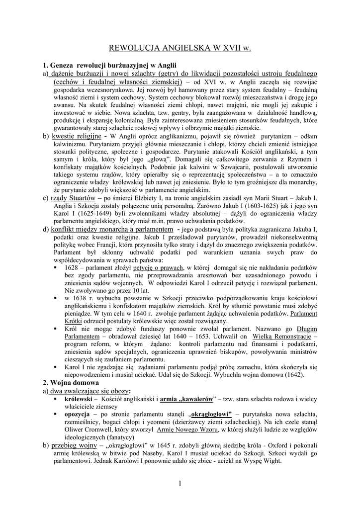 REWOLUCJA ANGIELSKA W XVII w. 1. Geneza rewolucji burżuazyjnej w Anglii a) dążenie burżuazji i nowej szlachty (getry) do likwidacji pozostałości ustroju feudalnego (cechów i feudalnej własności ziemskiej) – od XVI w. w Anglii zaczęła się rozwijać gospodarka wczesnorynkowa. Jej rozwój był hamowany przez stary system feudalny – feudalną własność ziemi i system cechowy. System cechowy blokował rozwój mieszczaństwa i drogę jego awansu. Na skutek feudalnej własności ziemi chłopi, nawet majętni, nie mogli jej zakupić i inwestować w siebie. Nowa szlachta, tzw. gentry, była zaangażowana w działalność handlową, produkcję i ekspansję kolonialną. Była zainteresowana zniesieniem stosunków feudalnych, które gwarantowały starej szlachcie rodowej wpływy i olbrzymie majątki ziemskie. b) kwestie religijne - W Anglii oprócz anglikanizmu, pojawił się również purytanizm – odłam kalwinizmu. Purytanizm przyjęli głównie mieszczanie i chłopi, którzy chcieli zmienić istniejące stosunki polityczne, społeczne i gospodarcze. Purytanie atakowali Kościół anglikański, a tym samym i króla, który był jego „głową”. Domagali się całkowitego zerwania z Rzymem i konfiskaty majątków kościelnych. Podobnie jak kalwini w Szwajcarii, postulowali utworzenie takiego systemu rządów, który opierałby się o reprezentację społeczeństwa – a to oznaczało ograniczenie władzy królewskiej lub nawet jej zniesienie. Było to tym groźniejsze dla monarchy, że purytanie zdobyli większość w parlamencie angielskim. c) rządy Stuartów – po śmierci Elżbiety I, na tronie angielskim zasiadł syn Marii Stuart – Jakub I. Anglia i Szkocja zostały połączone unią personalną. Zarówno Jakub I (1603-1625) jak i jego syn Karol I (1625-1649) byli zwolennikami władzy absolutnej – dążyli do ograniczenia władzy parlamentu angielskiego, który miał m.in. prawo uchwalania podatków. d) konflikt między monarchą a parlamentem - jego podstawą była polityka zagraniczna Jakuba I, podatki oraz kwestie religijne. Jakub I prześladował purytanów, prowadził niekonsekwentną politykę wobec Francji, która przynosiła tylko straty i dążył do znacznego zwiększenia podatków. Parlament był skłonny uchwalić podatki pod warunkiem uznania swych praw do współdecydowania w sprawach państwa: 1628 – parlament złożył petycję o prawach, w której domagał się nie nakładaniu podatków bez zgody parlamentu, nie przeprowadzania aresztowań bez uzasadnionego powodu i zniesienia sądów wojennych. W odpowiedzi Karol I odrzucił petycję i rozwiązał parlament. Nie zwoływano go przez 10 lat. w 1638 r. wybucha powstanie w Szkocji przeciwko podporządkowaniu kraju kościołowi anglikańskiemu i konfiskatom majątków ziemskich. Król by stłumić powstanie musi zdobyć pieniądze. W tym celu w 1640 r. zwołuje parlament żądając uchwalenia podatków. Parlament Krótki odrzucił postulaty królewskie więc został rozwiązany. Król nie mogąc zdobyć funduszy ponownie zwołał parlament. Nazwano go Długim Parlamentem – obradował dziesięć lat 1640 – 1653. Uchwalił on Wielką Remonstrację – program reform, w którym żądano: kontroli parlamentu nad finansami i podatkami, zniesienia sądów specjalnych, ograniczenia uprawnień biskupów, powoływania ministrów cieszących się zaufaniem parlamentu. Karol I nie zgadzając się żądaniami parlamentu podjął próbę zamachu, która skończyła się niepowodzeniem i musiał uciekać. Udał się do Szkocji. Wybuchła wojna domowa (1642). 2. Wojna domowa a) dwa zwalczające się obozy: królewski – Kościół anglikański i armia „kawalerów” – tzw. stara szlachta rodowa i wielcy właściciele ziemscy opozycja – po stronie parlamentu stanęli „okrągłogłowi” – purytańska nowa szlachta, rzemieślnicy, bogaci chłopi i yeomeni (dzierżawcy ziemi szlacheckiej). Na ich czele stanął Oliwer Cromwell, który stworzył Armię Nowego Wzoru, w której służyli ludzie ze względów ideologicznych (fanatycy) b) przebieg wojny – „okrągłogłowi” w 1645 r. zdobyli główną siedzibę króla - Oxford i pokonali armię królewską w bitwie pod Naseby. Karol I musiał uciekać do Szkocji. Szkoci wydali go parlamentowi. Jednak Karolowi I ponownie udało się zbiec - uciekł na Wyspę Wight. 1 c) armia Cromwella zajęła Londyn i usunęła z parlamentu wszystkich, którzy pragnęli ugody z królem. Nowy parlament nazwano Parlamentem Kadłubowym. Podjął on decyzję o postawieniu króla w stan oskarżenia. Karol I został skazany na śmierć przez ścięcie. 9.II.1649 r. Anglia została republiką. d) rządy Parlamentu Kadłubowego i Cromwella – młoda republika miała problemy zarówno wewnętrzne jak i zewnętrzne. Wewnątrz kraju nastąpiła radykalizacja społeczeństwa gdyż niższe warstwy społeczeństwa nadal nie były zadowolona ze zmian. W armii Cromwella wykształciły się dwie radykalne grupy: lewellerzy (równacze) – żądali powszechnego prawa wyborczego i równości wobec prawa, swobód religijnych i zniesienia dziesięciny. Reprezentowali interesy drobnomieszczaństwa diggerzy (kopacze) – żądali podziału ziemi między bezrolnych chłopów i głosili hasła utopijne np. wspólnego posiadania ziemi – mieli poparcie ludu. Obydwa ruchy zostały stłumione przez Cromwella. Na zewnątrz – Szkocja i Irlandia nie uznały republiki. Powołano tam na tron syna ściętego króla – Karola Stuarta. Oliwer Cromwell stłumił powstanie w Irlandii i Szkocji i w obu krajach surowo ukarał buntowników – skonfiskowano majątki powstańców, które przekazano zwolennikom rewolucji i żołnierzom armii Cromwella. W latach 1650 – 1651 parlament uchwalił Akty nawigacyjne – zakaz handlu cudzoziemców z koloniami angielskimi bez zezwolenia, zakaz wwozu towarów kolonialnych do Anglii na obcych statkach. Akty te uderzyły w Holandię, która posiadała największą fl