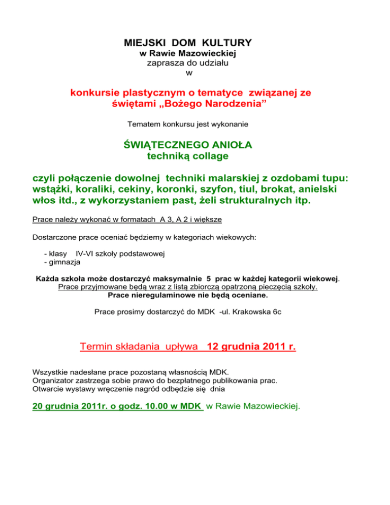 MIEJSKI DOM KULTURY w Rawie Mazowieckiej zaprasza do udziału w konkursie plastycznym o tematyce związanej ze świętami „Bożego Narodzenia” Tematem konkursu jest wykonanie ŚWIĄTECZNEGO ANIOŁA techniką collage czyli połączenie dowolnej techniki malarskiej z ozdobami tupu: wstążki, koraliki, cekiny, koronki, szyfon, tiul, brokat, anielski włos itd., z wykorzystaniem past, żeli strukturalnych itp. Prace należy wykonać w formatach A 3, A 2 i większe Dostarczone prace oceniać będziemy w kategoriach wiekowych: - klasy IV-VI szkoły podstawowej - gimnazja Każda szkoła może dostarczyć maksymalnie 5 prac w każdej kategorii wiekowej. Prace przyjmowane będą wraz z listą zbiorczą opatrzoną pieczęcią szkoły. Prace nieregulaminowe nie będą oceniane. Prace prosimy dostarczyć do MDK -ul. Krakowska 6c Termin składania upływa 12 grudnia 2011 r. Wszystkie nadesłane prace pozostaną własnością MDK. Organizator zastrzega sobie prawo do bezpłatnego publikowania prac. Otwarcie wystawy wręczenie nagród odbędzie się dnia 20 grudnia 2011r. o godz. 10.00 w MDK w Rawie Mazowieckiej.