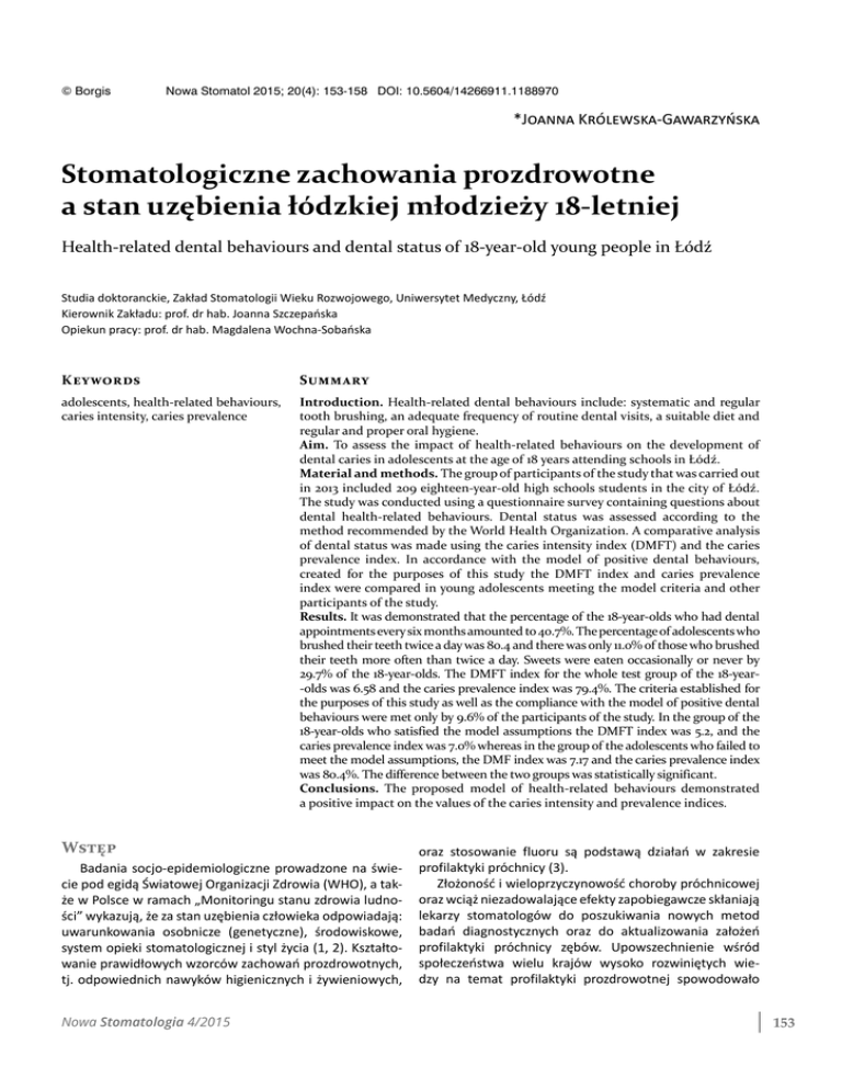 © Borgis Nowa Stomatol 2015; 20(4): 153-158 DOI: 10.5604/14266911.1188970 *Joanna Królewska-Gawarzyńska Stomatologiczne zachowania prozdrowotne a stan uzębienia łódzkiej młodzieży 18-letniej Health-related dental behaviours and dental status of 18-year-old young people in Łódź Studia doktoranckie, Zakład Stomatologii Wieku Rozwojowego, Uniwersytet Medyczny, Łódź Kierownik Zakładu: prof. dr hab. Joanna Szczepańska Opiekun pracy: prof. dr hab. Magdalena Wochna-Sobańska Keywords Summary adolescents, health-related behaviours, caries intensity, caries prevalence Introduction. Health-related dental behaviours include: systematic and regular tooth brushing, an adequate frequency of routine dental visits, a suitable diet and regular and proper oral hygiene. Aim. To assess the impact of health-related behaviours on the development of dental caries in adolescents at the age of 18 years attending schools in Łódź. Material and methods. The group of participants of the study that was carried out in 2013 included 209 eighteen-year-old high schools students in the city of Łódź. The study was conducted using a questionnaire survey containing questions about dental health-related behaviours. Dental status was assessed according to the method recommended by the World Health Organization. A comparative analysis of dental status was made using the caries intensity index (DMFT) and the caries prevalence index. In accordance with the model of positive dental behaviours, created for the purposes of this study the DMFT index and caries prevalence index were compared in young adolescents meeting the model criteria and other participants of the study. Results. It was demonstrated that the percentage of the 18-year-olds who had dental appointments every six months amounted to 40.7%. The percentage of adolescents who brushed their teeth twice a day was 80.4 and there was only 11.0% of those who brushed their teeth more often than twice a day. Sweets were eaten occasionally or never by 29.7% of the 18-year-olds. The DMFT index for the whole test group of the 18-year-olds was 6.58 and the caries prevalence index was 79.4%. The criteria established for the purposes of this study as well as the compliance with the model of positive dental behaviours were met only by 9.6% of the participants of the study. In the group of the 18-year-olds who satisfied the model assumptions the DMFT index was 5.2, and the caries prevalence index was 7.0% whereas in the group of the adolescents who failed to meet the model assumptions, the DMF index was 7.17 and the caries prevalence index was 80.4%. The difference between the two groups was statistically significant. Conclusions. The proposed model of health-related behaviours demonstrated a positive impact on the values of the caries intensity and prevalence indices. Wstęp Badania socjo-epidemiologiczne prowadzone na świecie pod egidą Światowej Organizacji Zdrowia (WHO), a także w Polsce w ramach „Monitoringu stanu zdrowia ludności” wykazują, że za stan uzębienia człowieka odpowiadają: uwarunkowania osobnicze (genetyczne), środowiskowe, system opieki stomatologicznej i styl życia (1, 2). Kształtowanie prawidłowych wzorców zachowań prozdrowotnych, tj. odpowiednich nawyków higienicznych i żywieniowych, Nowa Stomatologia 4/2015 oraz stosowanie fluoru są podstawą działań w zakresie profilaktyki próchnicy (3). Złożoność i wieloprzyczynowość choroby próchnicowej oraz wciąż niezadowalające efekty zapobiegawcze skłaniają lekarzy stomatologów do poszukiwania nowych metod badań diagnostycznych oraz do aktualizowania założeń profilaktyki próchnicy zębów. Upowszechnienie wśród społeczeństwa wielu krajów wysoko rozwiniętych wiedzy na temat profilaktyki prozdrowotnej spowodowało 153 Joanna Królewska-Gawarzyńska znaczny spadek zachorowań na próchnicę (np. w krajach skandynawskich) (4). Wczesna diagnostyka procesu próchnicowego oraz skuteczne wdrażanie postępowania profilaktycznego są podstawą do zmniejszenia frekwencji i intensywności próchnicy. Dzięki rozwiniętej profilaktyce i programom prewencyjnym, frekwencja i intensywność próchnicy w państwach skandynawskich jest 2-3-krotnie niższa niż w Polsce (5, 6). Wpojone w dzieciństwie prawidłowe wzorce zachowań prozdrowotnych skutkują prawidłową postawą w profilaktyce próchnicowej u osób dorosłych. Systematyczne działania profilaktyczne są, obok metod leczniczych, konieczne do zmniejszenia występowania choroby próchnicowej. Utrwalenie prawidłowych nawyków stomatologicznych u młodzieży stojącej u progu dorosłości i samodzielności w znacznym stopniu przyczynia się do poprawy zdrowia jamy ustnej dojrzałej populacji. Osiemnastolatkowie to również przyszli rodzice, którzy prawidłowe zachowania stomatologiczne będą przekazywać swoim dzieciom. Prozdrowotne zachowania stomatologiczne obejmują m.in.: regularną i prawidłową higienę jamy ustnej (w tym systematyczne i prawidłowe szczotkowanie zębów, mające na celu usuwanie płytki nazębnej), odpowiednią częstotliwość kontrolnych wizyt w gabinecie stomatologicznym oraz odpowiednią dietę, mającą na celu świadomą kontrolę ilości spożywanych węglowodanów. Na rozwój próchnicotwórczej flory bakteryjnej ma wpływ pojadanie słodkich przekąsek i picie słodzonych napojów. Węglowodanem o najwyższej kariogenności jest sacharoza, która powoduje odkładanie płytki nazębnej. Duże znaczenie w rozwoju próchnicy ma czas przebywania cukrów w jamie ustnej. Pomiędzy posiłkami powinny być zachowane 2-3-godzinne przerwy. Pojadanie słodkich przekąsek pomiędzy posiłkami powoduje obniżenie wartości buforowej śliny, co przyczynia się do rozwoju choroby próchnicowej. Częstotliwość spożywania słodkich pokarmów, bardziej niż ich ilościowy udział w diecie, ma negatywny wpływ na stan zdrowia jamy ustnej. Analiza wybranych zachowań prozdrowotnych pomaga usta