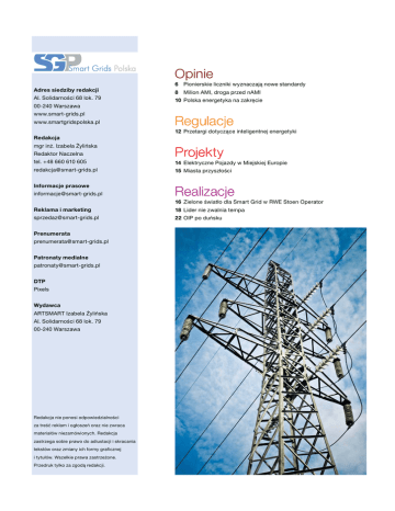Opinie Adres siedziby redakcji Al. Solidarności 68 lok. 79 00-240 Warszawa www.smart-grids.pl www.smartgridspolska.pl Redakcja mgr inż. Izabela Żylińska Redaktor Naczelna tel. +48 660 610 605 6 Pionierskie liczniki wyznaczają nowe standardy 8 Milion AMI, droga przed nAMI 10 Polska energetyka na zakręcie Regulacje 12 Przetargi dotyczące inteligentnej energetyki Projekty 14 Elektryczne Pojazdy w Miejskiej Europie [email protected] 15 Miasta przyszłości Informacje prasowe Realizacje [email protected] 16 Zielone światło dla Smart Grid w RWE Stoen Operator Reklama i marketing 18 Lider nie zwalnia tempa [email protected] 22OIP po duńsku Prenumerata [email protected] Patronaty medialne [email protected] DTP Pixels Wydawca ARTSMART Izabela Żylińska Al. Solidarności 68 lok. 79 00-240 Warszawa Redakcja nie ponosi odpowiedzialności za treść reklam i ogłoszeń oraz nie zwraca materiałów niezamówionych. Redakcja zastrzega sobie prawo do adiustacji i skracania tekstów oraz zmiany ich formy graficznej i tytułów. Wszelkie prawa zastrzeżone. Przedruk tylko za zgodą redakcji. Technologie 23Titanium. Platforma do wdrażania i obsługi inteligentnego opomiarowania (Schneider Electric Polska sp. z o.o.) 25Titanium. Platforma AMI w Fortum Finlandia (Schneider Electric Polska sp. z o.o.) 26THE ELTEL WAY – wiedza do wykorzystania (ELTEL Networks) 28Doświadczenie, skuteczność, pasja, inspiracja (ECHELON Corp.) 30Stawiamy na jakość i dostępność produktów (Schrack Technik Polska sp. z o.o.) 32S &T Services Polska stawia na rozwój Technologie – przegląd 61Apator. Nowe rozwiązania dla AMI (Apator S.A.) 62Licznik trójfazowy bezpośredni NP73E.1-9-2 (T-matic Systems S.A.) 63Licznik jedno- i trójfazowy MTR1000/3000 (ECHELON Corp.) 64Alpha AS (Elmess Metering sp. z o.o.) 65Kamstrup Omnipower – element platformy OMNIA (Kamstrup sp. z o.o.) 66Inteligentne liczniki: jednofazowy SMW1 i trójfazowy SMW3 (Mitsubishi Electric Europe B.V. sp. z o.o.) (S&T Services Polska sp. z o.o.) 34Alma. Nowa jakość na rynku smart (Alma S.A.) 36SmartMDM jako przyszłość rynku energii Z branży 67 Informacje (GÖRLITZ AG) 38Inteligentne miasta z Mirometr (Mirometr sp. z o.o.) 40Energomiar – inkubator technologii inteligentnych (Energomiar sp. z o.o.) 42Inteligentny system zarządzania oświetleniem (Energomiar sp. z o.o.) 44Czas na biznes. Czas na nowe wyzwania (Hewlett-Packard Polska sp. z o.o.) 46Organizacja zakupu i wdrożenia AMI (KPMG sp. z o.o.) 48Smart Metering. Przegląd (ZEUP POZYTON Częstochowa sp. z o.o.) 50PLC 1901.2 – kolejny krok ewolucji AMI (Cisco Systems Polska sp. z o.o.) 52Standardy wymiany informacji w systemach inteligentnego pomiaru Wydarzenia 68Zestawienie wydarzeń branżowych 69XII Targi Elektrotechnika 2014 70Targi „zielonej energii” pod znakiem konferencji i warsztatów 72 Energetab znów rekordowy 74 Seminarium OSGP. Podsumowanie 76 Inteligentna energetyka w Polsce? Coraz bliżej! 80Energetics rośnie w siłę 81Kongres Ekoinnowacje w ochronie środowiska 2013. Podsumowanie