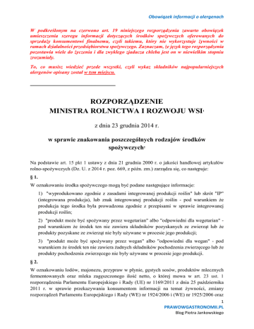 Obowiązek informacji o alergenach W podkreślonym na czerwono art. 19 niniejszego rozporządzenia zawarto obowiązek umieszczenia szeregu informacji dotyczących środków spożywczych oferowanych do sprzedaży konsumentowi finalnemu, czyli takiemu, który nie wykorzystuje żywności w ramach działalności przedsiębiorstwa spożywczego. Zaznaczam, że język tego rozporządzenia pozostawia wiele do życzenia i dla zwykłego zjadacza chleba jest on w niewielkim stopniu zrozumiały. To, co musisz wiedzieć przede wszystki, czyli wykaz składników najpopularniejszych alergenów opisany został w tym miejscu. _________________________ ROZPORZĄDZENIE MINISTRA ROLNICTWA I ROZWOJU WSI 1 z dnia 23 grudnia 2014 r. w sprawie znakowania poszczególnych rodzajów środków spożywczych2 Na podstawie art. 15 pkt 1 ustawy z dnia 21 grudnia 2000 r. o jakości handlowej artykułów rolno-spożywczych (Dz. U. z 2014 r. poz. 669, z późn. zm.) zarządza się, co następuje: § 1. W oznakowaniu środka spożywczego mogą być podane następujące informacje: 1) "wyprodukowano zgodnie z zasadami integrowanej produkcji roślin" lub skrót "IP" (integrowana produkcja), lub znak integrowanej produkcji roślin - pod warunkiem że produkcja tego środka była prowadzona zgodnie z przepisami w sprawie integrowanej produkcji roślin; 2) "produkt może być spożywany przez wegetarian" albo "odpowiedni dla wegetarian" pod warunkiem że środek ten nie zawiera składników pozyskanych ze zwierząt lub że produkty pozyskane ze zwierząt nie były używane w procesie jego produkcji; 3) "produkt może być spożywany przez wegan" albo "odpowiedni dla wegan" - pod warunkiem że środek ten nie zawiera żadnych składników pochodzenia zwierzęcego lub że produkty pochodzenia zwierzęcego nie były używane w procesie jego produkcji. § 2. W oznakowaniu lodów, majonezu, przypraw w płynie, gęstych sosów, produktów mlecznych fermentowanych oraz mleka zagęszczonego ilość netto, o której mowa w art. 23 ust. 1 rozporządzenia Parlamentu Europejskiego i Rady (UE) nr 1169/2011 z dnia 25 października 2011 r. w sprawie przekazywania konsumentom informacji na temat żywności, zmiany rozporządzeń Parlamentu Europejskiego i Rady (WE) nr 1924/2006 i (WE) nr 1925/2006 oraz 1 PRAWOWGASTRONOMII.PL Blog Piotra Jankowskiego Obowiązek informacji o alergenach uchylenia dyrektywy Komisji 87/250/EWG, dyrektywy Rady 90/496/EWG, dyrektywy Komisji 1999/10/WE, dyrektywy 2000/13/WE Parlamentu Europejskiego i Rady, dyrektyw Komisji 2002/67/WE i 2008/5/WE oraz rozporządzenia Komisji (WE) nr 608/2004 (Dz. Urz. UE L 304 z 22.11.2011, str. 18, z późn. zm.), zwanego dalej "rozporządzeniem nr 1169/2011", może być podawana w jednostkach masy lub w jednostkach objętości. § 3. 1. W oznakowaniu cukru ekstra białego (cukru rafinowanego) zamiast nazwy "cukier biały ekstra" albo "cukier rafinowany" można zastosować nazwę "cukier biały". 2. W przypadku gdy w opakowaniu jest mniej niż 20 g cukru przemysłowego, cukru (cukru białego), cukru ekstra białego (cukru rafinowanego), płynnego cukru (roztworu cukru), płynnego cukru inwertowanego (roztworu cukru inwertowanego), syropu cukru inwertowanego, syropu glukozowego, syropu glukozowego w proszku, jednowodnej glukozy (jednowodnej dekstrozy), bezwodnej glukozy (bezwodnej dekstrozy) lub fruktozy, w oznakowaniu tych produktów można nie podawać zawartości netto opakowania. 3. Nazwy wymienione w ust. 2 mogą być wykorzystywane wyłącznie w oznakowaniu środków spożywczych spełniających wymagania określone w przepisach w sprawie szczegółowych wymagań w zakresie jakości handlowej niektórych półproduktów i produktów przemysłu cukrowniczego, z tym że: 1) w oznakowaniu środków spożywczych spełniających wymagania określone w przepisach w sprawie szczegółowych wymagań w zakresie jakości handlowej niektórych półproduktów i produktów przemysłu cukrowniczego mogą również występować określenia powszechnie stosowane w innych państwach członkowskich Unii Europejskiej, pod warunkiem że nie wprowadzają w błąd konsumenta finalnego; 2) w nazwach zwyczajowych, w rozumieniu art. 2 ust. 2 lit. o rozporządzenia nr 1169/2011, innych środków spożywczych nazwy te mogą być używane pod warunkiem, że nie wprowadzają w błąd konsumenta finalnego. 4. W oznakowaniu płynnego cukru (roztworu cukru), płynnego cukru inwertowanego (roztworu cukru inwertowanego) podaje się informację o zawartości suchej masy oraz o zawartości cukru inwertowanego. 5. W oznakowaniu syropu cukru inwertowanego podaje się informację o zawartości suchej masy oraz o zawartości cukru inwertowanego, a w przypadku syropu cukru inwertowanego, w którym występuje krystalizacja, podaje się dodatkowo informację "skrystalizowany". 6. W oznakowaniu syropu glukozowego oraz syropu glukozowego w proszku, zawierającego fruktozę w ilości większej niż 5% suchej masy nazwę środka spożywczego podaje się odpowiednio przy użyciu określenia "syrop glukozowo-fruktozowy" albo "syrop fruktozowoglukozowy" oraz "syrop glukozowo-fruktozowy w proszku" albo "syrop fruktozowoglukozowy w proszku", w zależności od przeważającej ilości glukozy albo fruktozy w tym syropie. § 4. 1. Oznakowany jako: 2 PRAWOWGASTRONOMII.PL Blog Piotra Jankowskiego Obowiązek informacji o alergenach 1) "miód pitny" może być wyłącznie fermentowany napój winiarski, o którym mowa w art. 3 pkt 1 lit. a ustawy z dnia 12 maja 2011 r. o wyrobie i rozlewie wyrobów winiarskich, obrocie tymi wyrobami i organizacji rynku wina (Dz. U. z 2014 r. poz. 1104), zwanej dalej "ustawą winiarską"; 2) "miód pitny markowy" może być wyłącznie fermentowany napój winiarski, o którym mowa w art. 3 pkt 1 lit. b ustawy winiarskiej. 2. Nazwę "miód pitny" lub "miód pitny markowy", uzupełnia się na końcu jednym z następujących określeń: 1) "owocowy" - w przypadku gdy miód pitny lub miód pitny markowy zosta