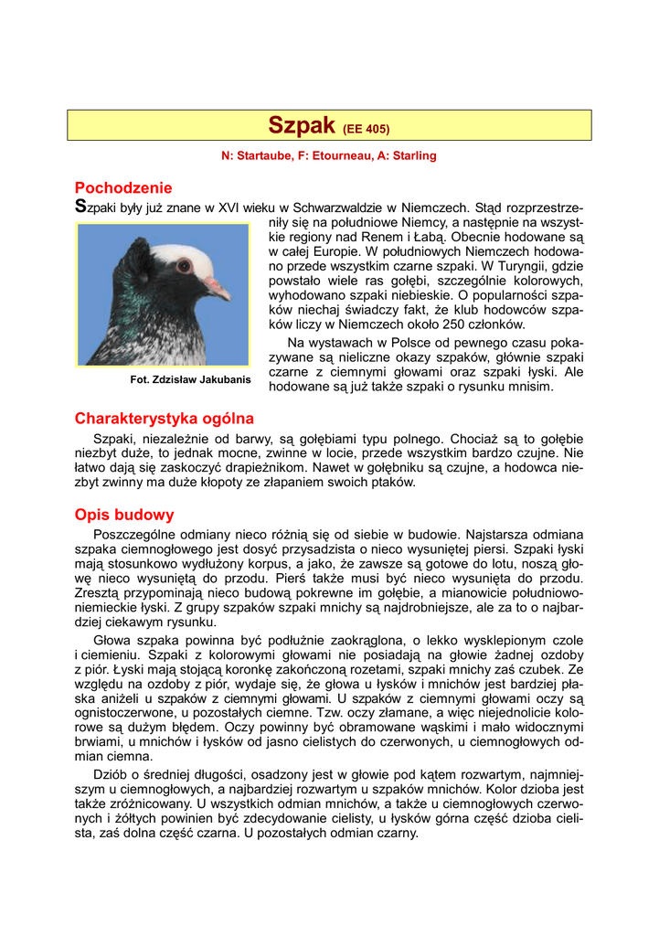 Szpak (EE 405) N: Startaube, F: Etourneau, A: Starling Pochodzenie Szpaki były juŜ znane w XVI wieku w Schwarzwaldzie w Niemczech. Stąd rozprzestrze- Fot. Zdzisław Jakubanis niły się na południowe Niemcy, a następnie na wszystkie regiony nad Renem i Łabą. Obecnie hodowane są w całej Europie. W południowych Niemczech hodowano przede wszystkim czarne szpaki. W Turyngii, gdzie powstało wiele ras gołębi, szczególnie kolorowych, wyhodowano szpaki niebieskie. O popularności szpaków niechaj świadczy fakt, Ŝe klub hodowców szpaków liczy w Niemczech około 250 członków. Na wystawach w Polsce od pewnego czasu pokazywane są nieliczne okazy szpaków, głównie szpaki czarne z ciemnymi głowami oraz szpaki łyski. Ale hodowane są juŜ takŜe szpaki o rysunku mnisim. Charakterystyka ogólna Szpaki, niezaleŜnie od barwy, są gołębiami typu polnego. ChociaŜ są to gołębie niezbyt duŜe, to jednak mocne, zwinne w locie, przede wszystkim bardzo czujne. Nie łatwo dają się zaskoczyć drapieŜnikom. Nawet w gołębniku są czujne, a hodowca niezbyt zwinny ma duŜe kłopoty ze złapaniem swoich ptaków. Opis budowy Poszczególne odmiany nieco róŜnią się od siebie w budowie. Najstarsza odmiana szpaka ciemnogłowego jest dosyć przysadzista o nieco wysuniętej piersi. Szpaki łyski mają stosunkowo wydłuŜony korpus, a jako, Ŝe zawsze są gotowe do lotu, noszą głowę nieco wysuniętą do przodu. Pierś takŜe musi być nieco wysunięta do przodu. Zresztą przypominają nieco budową pokrewne im gołębie, a mianowicie południowoniemieckie łyski. Z grupy szpaków szpaki mnichy są najdrobniejsze, ale za to o najbardziej ciekawym rysunku. Głowa szpaka powinna być podłuŜnie zaokrąglona, o lekko wysklepionym czole i ciemieniu. Szpaki z kolorowymi głowami nie posiadają na głowie Ŝadnej ozdoby z piór. Łyski mają stojącą koronkę zakończoną rozetami, szpaki mnichy zaś czubek. Ze względu na ozdoby z piór, wydaje się, Ŝe głowa u łysków i mnichów jest bardziej płaska aniŜeli u szpaków z ciemnymi głowami. U szpaków z ciemnymi głowami oczy są ognistoczerwone, u pozostałych ciemne. Tzw. oczy złamane, a więc niejednolicie kolorowe są duŜym błędem. Oczy powinny być obramowane wąskimi i mało widocznymi brwiami, u mnichów i łysków od jasno cielistych do czerwonych, u ciemnogłowych odmian ciemna. Dziób o średniej długości, osadzony jest w głowie pod kątem rozwartym, najmniejszym u ciemnogłowych, a najbardziej rozwartym u szpaków mnichów. Kolor dzioba jest takŜe zróŜnicowany. U wszystkich odmian mnichów, a takŜe u ciemnogłowych czerwonych i Ŝółtych powinien być zdecydowanie cielisty, u łysków górna część dzioba cielista, zaś dolna część czarna. U pozostałych odmian czarny. Szpak Fot. Manfred Uglorz Podgardle powinno być dobrze wykrojone, szczególnie u ciemnogłowych. Szyja u wszystkich odmian jest średnio długa, w okolicy ramion dobrze wypełniona i rozszerzająca się w kierunku dobrze zaokrąglonej piersi. Szpaki o zapadniętych piersiach powinny być usuwane z hodowli. Podobnie dość długie plecy powinny być zaokrąglone i nieco opadające, szczególnie u szpaków mnichów, w kierunku ogona. Szpaki, jak wszystkie gołębie naleŜące do grupy V, mają dość długie skrzydła, dające im zwinność i sprawność w locie. Bezwzględnie powinny spoczywać na długim i zwartym ogonie. Całe upierzenie musi być zwarte, przylegające do tułowia, głowy i szyi. Szpaki mają stosunkowo krótkie, zawsze nieupierzone, koloru czerwonego nogi. Tylko u gołębi młodych dopuszcza się nieco ciemne nogi. Obowiązkowo pazurki muszą być czarne, a jedynie u mnichów jasne. Kolory i rysunek Wszystkie szpaki bezwzględnie muszą być kolorowe, mieć białe pasy i księŜyc na piersiach, lub białą wstęgę, poprzetykaną czarnymi punkcikami o szerokości około 15 mm. Wstęga powinna znajdować się wokół szyi i z tyłu zbiegać się z rysunkiem tzw. serca. KsięŜyc zaś powinien się znajdować w dolnej części szyi. Powstaje on dzięki piórom, które w tym miejscu mają białe końcówki z delikatną, czarną i połyskującą zielono obwódką. PółksięŜyc powinien być około 3 cm szeroki i podwójnie długi. Musi się u góry i u dołu wyraźnie odcinać od podstawowej barwy, być bez luk, a końce półksięŜyca powinny mieć ostre zakończenia, które nie mogą sięgać do tylnej części szyi. Rysunek sięgający na tylną część szyi i na piersi jest błędem. Pasy powinny być czysto białe, wąskie, bez przerw, biegnące przez całą szerokość tarcz, na górze w miarę moŜliwości rozdzielone. Znane są szpaki czarne, niebieskie, czerwone i Ŝółte. Te cztery kolory dają z czterema róŜnymi rysunkami dwadzieścia sześć odmian barwnych. Wszystkie odmiany moŜna opisać w odniesieniu do kolorów, jednakŜe opis taki nie będzie przejrzysty. Znacznie lepsze jest odwołanie się do występujących u szpaków czterech podstawowych rysunków. Szpaki z białymi pasami, bez dodatkowego rysunku na tarczach skrzydeł występują w czterech wariantach: szpaki ciemnogłowe, z białym ogonem, łyski i mnichy. 2 Szpak Fot. Manfred Uglorz 1. Szpaki ciemnogłowe charakteryzują się tym, Ŝe nie mają na głowie Ŝadnego rysunku. Pióra ciemnogłowych czarnych powinny mieć zielony połysk, bez dodatku koloru brązowego i sitowatości na lotkach i ogonie. Kolor niebieskich ciemnogłowych powinien być czysty, na skrzydłach równomiernie rozłoŜony. Rysunek na skrzydłach u ciemnogłowych niebieskich biało łuskowatych powinien być wyraźny. Białe łuski obowiązkowo muszą mieć czarne obrzeŜenie. Barwa u ciemnogłowych czerwonych i Ŝółtych powinna być czysta, zdecydowana. 2. Znane są białogony czarne, niebieskie i niebieskie biało łuskowate. Nad woskówkami znajduje się małe białe czółko, w ogonie zaś powinno być dwanaście białych sterówek. Klin powinien być kolorowy, pokryw