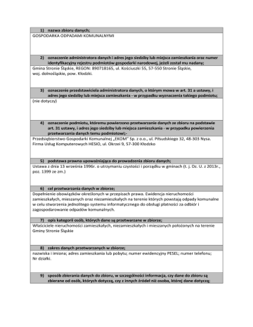 1) nazwa zbioru danych; GOSPODARKA ODPADAMI KOMUNALNYMI 2) oznaczenie administratora danych i adres jego siedziby lub miejsca zamieszkania oraz numer identyfikacyjny rejestru podmiotów gospodarki narodowej, jeżeli został mu nadany; Gmina Stronie Śląskie, REGON: 890718165, ul. Kościuszki 55, 57-550 Stronie Śląskie, woj. dolnośląskie, pow. Kłodzki. 3) oznaczenie przedstawiciela administratora danych, o którym mowa w art. 31 a ustawy, i adres jego siedziby lub miejsca zamieszkania - w przypadku wyznaczenia takiego podmiotu; (nie dotyczy) 4) oznaczenie podmiotu, któremu powierzono przetwarzanie danych ze zbioru na podstawie art. 31 ustawy, i adres jego siedziby lub miejsca zamieszkania - w przypadku powierzenia przetwarzania danych temu podmiotowi;Przedsiębiorstwo Gospodarki Komunalnej „EKOM” Sp. z o.o., ul. Piłsudskiego 32, 48-303 Nysa. Firma Usług Komputerowych HESIO, ul. Okrzei 9, 57-300 Kłodzko 5) podstawa prawna upoważniająca do prowadzenia zbioru danych; Ustawa z dnia 13 września 1996r. o utrzymaniu czystości i porządku w gminach (t. j. Dz. U. z 2013r., poz. 1399 ze zm.) 6) cel przetwarzania danych w zbiorze; Dopełnienie obowiązków określonych w przepisach prawa. Ewidencja nieruchomości zamieszkałych, mieszanych oraz niezamieszkałych na terenie których powstają odpady komunalne w celu stworzenia jednolitego systemu informatycznego do obsługi płatności za odbiór i zagospodarowanie odpadów komunalnych. 7) opis kategorii osób, których dane są przetwarzane w zbiorze; Właściciele nieruchomości zamieszkałych, niezamieszkałych i mieszanych położonych na terenie Gminy Stronie Śląskie 8) zakres danych przetwarzanych w zbiorze; nazwiska i imiona; adres zamieszkania lub pobytu; numer ewidencyjny PESEL; numer telefonu; Nr działki. 9) sposób zbierania danych do zbioru, w szczególności informacja, czy dane do zbioru są zbierane od osób, których dotyczą, czy z innych źródeł niż osoba, której dane dotyczą; od osób, których dotyczą, z innych źródeł niż osoba, której dane dotyczą, 10) sposób udostępniania danych ze zbioru, w szczególności informacja, czy dane ze zbioru są udostępniane innym podmiotom niż upoważnione na podstawie przepisów prawa; (nie dotyczy) 11) oznaczenie odbiorcy danych lub kategorii odbiorców, którym dane mogą być przekazywane; (nie dotyczy) 12) informacja dotycząca ewentualnego przekazywania danych do państwa trzeciego; (nie dotyczy)