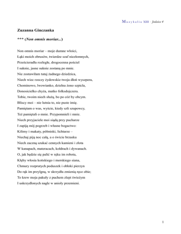 Mu z y k a l i a XIII · Judaica 4 Zuzanna Ginczanka *** (Non omnis moriar...) Non omnis moriar – moje dumne włości, Łąki moich obrusów, twierdze szaf niezłomnych, Prześcieradła rozległe, drogocenna pościel I suknie, jasne suknie zostaną po mnie. Nie zostawiłam tutaj żadnego dziedzica, Niech wiec rzeczy żydowskie twoja dłoń wyszpera, Chominowo, lwowianko, dzielna żono szpicla, Donosicielko chyża, matko folksdojczera. Tobie, twoim niech służą, bo po cóż by obcym. Bliscy moi – nie lutnia to, nie puste imię. Pamiętam o was, wyście, kiedy szli szupowcy, Też pamiętali o mnie. Przypomnieli i mnie. Niech przyjaciele moi siądą przy pucharze I zapiją mój pogrzeb i własne bogactwo: Kilimy i makaty, półmiski, lichtarze – Niechaj piją noc całą, a o świcie brzasku Niech zaczną szukać cennych kamieni i złota W kanapach, materacach, kołdrach i dywanach. O, jak będzie się palić w ręku im robota, Kłęby włosia końskiego i morskiego siana, Chmury rozprutych poduszek i obłoki pierzyn Do rąk im przylgną, w skrzydła zmienią ręce obie; To krew moja pakuły z puchem zlepi świeżym I uskrzydlonych nagle w anioły przemieni. 1 Mu z y k a l i a XIII · Judaica 4 PRZYPISY: Wiersz zachowany w rękopisie poetki, datowany na 1942 rok. ogłoszony po wojnie na łamach „Odrodzenia” (1946 nr 12, s. 5). Utwór interpretowała Anna Kamieńska w pracy pt. Testament ironiczny, w: Od Leśmiana. Najpiękniejsze wiersze polskie, Warszawa 1974 . * non omnis moriar (łac.) - nie wszystek umrę: znana sentencja, pochodząca z wiersza Horacego Exegi monumentum (Carmen III, 30). * Chominowa – Zofia Chominowa - gospodyni kamienicy, w której Ginczanka mieszkała podczas pobytu we Lwowie w latach 1939-42. [Chominowa i jej syn Marian zostali oskarżeni o denuncjację poetki. W wyniku toczącego się w listopadzie 1948 r. procesu w Sądzie Okręgowym w Warszawie Marian Chomin został uniewinniony, Zofia Chominowa zaś skazana na 4 lata więzienia. Dokumenty z tego procesu przedstawiła w swoim opracowaniu Agnieszka Haska, tejże wybór i oprac., „Znałam tylko jedną żydóweczkę ukrywającą się...”. Sprawa Zofii i Mariana Chominów, „Zagłada Żydów. Studia i materiały”. Pismo Centrum Badań nad Zagładą Żydów IFIS PAN, nr 4, Warszawa 2008, s. 392-407. –informacja red., Michała Klubińskiego] * Dziesiąty i wcześniejszy, piąty wers por. z następującą strofą wiersza Juliusza Słowackiego Testament mój: Nie zostawiłem tutaj żadnego dziedzica Ani dla lutni mojej, ani dla imienia; Imię moje tak przeszło jako błyskawica I będzie jak dźwięk pusty trwać przez pokolenia. * szupowcy (niem. Schutzpolizei) - funkcjonariusze niemieckiej policji, dokonującej podczas II wojny światowej pacyfikacji ludności krajów okupowanych. * Por. trzynasty i czternasty wers z następującym fragmentem Testamentu Słowackiego: Niech przyjaciele moi siądą przy pucharze I zapiją mój pogrzeb – oraz własną biedę * rozprutych - forma wyrazu zgodna z rękopisem poetki; w dwóch powojennych edycjach wierszy Ginczanki oraz wszystkich przedrukach w antologiach i czasopismach funkcjonuje wersja „poprawiona” przez Juliana Przybosia, który pisał: „O pierwszym rzucie treści i nieoszlifowaniu utworu świadczy także zwrot o świcie brzasku i wykolejony rytm w wierszu Chmury rozprutych poduszek i obłoki pierzyn” (W rękopisie występowało prutych). („Odrodzenie”, 1946 nr 13, s. 10.) * przemieni – por. ostatnią strofę wiersza Słowackiego: Jednak zostanie po mnie ta siła fatalna, Co mi żywemu na nic... tylko czoło zdobi; Lecz po śmierci was będzie gniotła niewidzialna, Aż was, zjadacze chleba – w aniołów przerobi. Forma przemieni w wierszu Ginczanki jest zgodna z rękopisem. J. Przyboś, usiłując przybliżyć utwór parafrazowanemu tekstowi Słowackiego, zastąpił tę formę słowem przerobi. Wiersz opatrzyła przypisami Izolda Kiec. Republikacja za: Zuzanna Ginczanka, Udźwignąć własne szczęście. Poezje, Wstęp i oprac. Izolda Kiec, BRAMA - Książnica Włóczęgów i Uczonych, Poznań 1991, s. 162-163. 2