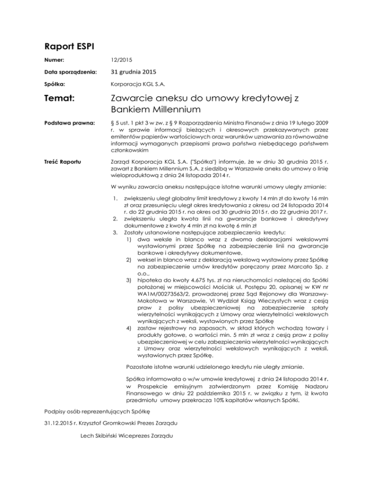 Zarząd Korporacja KGL S.A. ("Spółka") informuje, że w dniu 30 grudnia 2015 r.