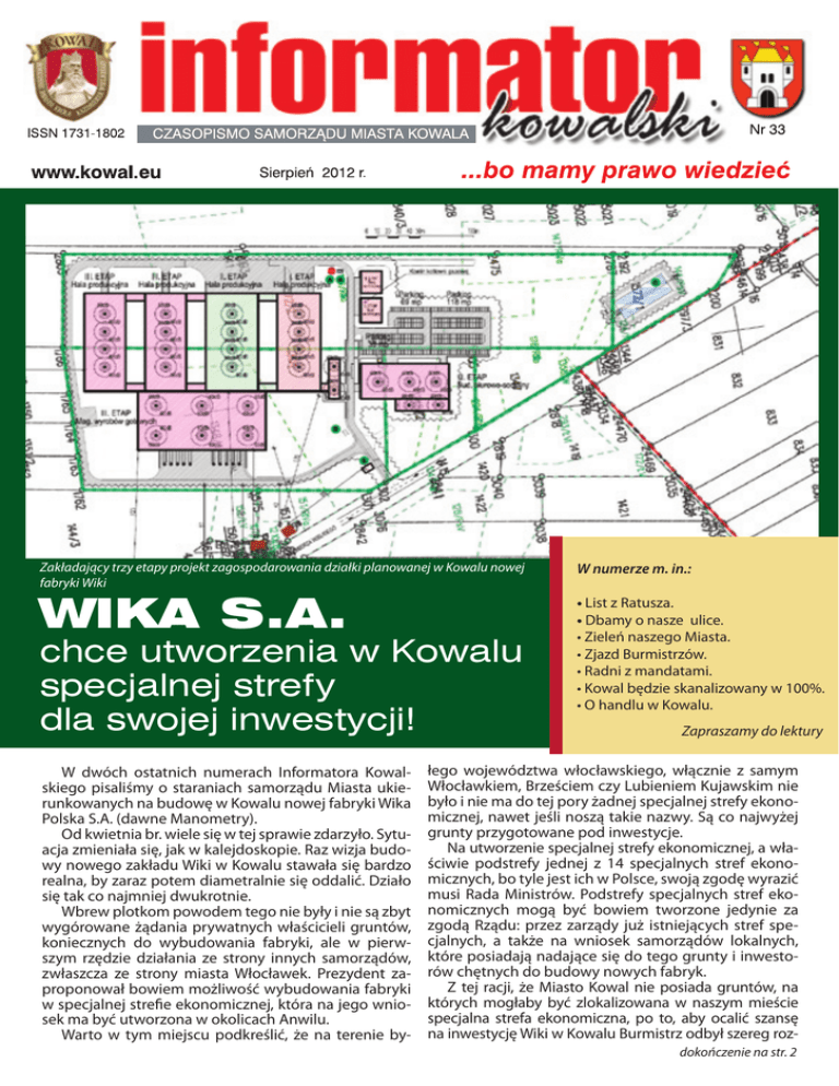 Zakładający trzy etapy projekt zagospodarowania działki planowanej w Kowalu nowej fabryki Wiki WIKA S.A. chce utworzenia w Kowalu specjalnej strefy dla swojej inwestycji! W dwóch ostatnich numerach Informatora Kowalskiego pisaliśmy o staraniach samorządu Miasta ukierunkowanych na budowę w Kowalu nowej fabryki Wika Polska S.A. (dawne Manometry). Od kwietnia br. wiele się w tej sprawie zdarzyło. Sytuacja zmieniała się, jak w kalejdoskopie. Raz wizja budowy nowego zakładu Wiki w Kowalu stawała się bardzo realna, by zaraz potem diametralnie się oddalić. Działo się tak co najmniej dwukrotnie. Wbrew plotkom powodem tego nie były i nie są zbyt wygórowane żądania prywatnych właścicieli gruntów, koniecznych do wybudowania fabryki, ale w pierwszym rzędzie działania ze strony innych samorządów, zwłaszcza ze strony miasta Włocławek. Prezydent zaproponował bowiem możliwość wybudowania fabryki w specjalnej strefie ekonomicznej, która na jego wniosek ma być utworzona w okolicach Anwilu. Warto w tym miejscu podkreślić, że na terenie by- W numerze m. in.: • List z Ratusza. • Dbamy o nasze ulice. • Zieleń naszego Miasta. • Zjazd Burmistrzów. • Radni z mandatami. • Kowal będzie skanalizowany w 100%. • O handlu w Kowalu. Zapraszamy do lektury łego województwa włocławskiego, włącznie z samym Włocławkiem, Brześciem czy Lubieniem Kujawskim nie było i nie ma do tej pory żadnej specjalnej strefy ekonomicznej, nawet jeśli noszą takie nazwy. Są co najwyżej grunty przygotowane pod inwestycje. Na utworzenie specjalnej strefy ekonomicznej, a właściwie podstrefy jednej z 14 specjalnych stref ekonomicznych, bo tyle jest ich w Polsce, swoją zgodę wyrazić musi Rada Ministrów. Podstrefy specjalnych stref ekonomicznych mogą być bowiem tworzone jedynie za zgodą Rządu: przez zarządy już istniejących stref specjalnych, a także na wniosek samorządów lokalnych, które posiadają nadające się do tego grunty i inwestorów chętnych do budowy nowych fabryk. Z tej racji, że Miasto Kowal nie posiada gruntów, na których mogłaby być zlokalizowana w naszym mieście specjalna strefa ekonomiczna, po to, aby ocalić szansę na inwestycję Wiki w Kowalu Burmistrz odbył szereg rozdokończenie na str. 2 ciąg dalszy ze str. 1 mów i spotkań, m.in. w Ministerstwie Gospodarki oraz zarządami pomorskiej i łódzkiej specjalnej strefy ekonomicznej. Efektem tych rozmów było wskazanie jeszcze jednej możliwości prawnej utworzenia strefy specjalnej – w oparciu o grunty prywatne, czyli tak, jak ma to miejsce w Kowalu. W takim przypadku jednak wniosek o utworzenie strefy musi pochodzić od samego inwestora, który musi szczegółowo opisać swoją inwestycję oraz wskazać prawo do gruntów, na których miałaby powstać strefa. Także i w tym przypadku zgodę na utworzenie podstrefy musi wyrazić Rada Ministrów. Co daje przedsiębiorcom inwestycja w strefie? Daje bardzo wiele, bo stwarza możliwość odliczenia w podatku dochodowym 50% poniesionych nakładów na całą inwestycję. Nic więc dziwnego, że zarząd Wiki w Niemczech, dowiedziawszy się o takiej możliwości, postanowił, że jej nowa fabryka musi być koniecznie zlokalizowana w specjalnej strefie. W tym stanie rzeczy zarząd Wiki, mając do wyboru lokalizacje swojej nowej fabryki w tworzonej na wniosek władz Włocławka strefie w okolicach Anwilu lub przygotowywać skomplikowany wniosek i samodzielnie występować o utworzenie strefy w Kowalu, wybrał Kowal! To duży sukces naszego Miasta, ale fakt złożenia w tej sprawie wniosku do Ministerstwa Gospodarki wraz z jego szczegółowym ekonomicznym uzasadnieniem niczego jeszcze nie rozstrzyga. Osiągnięcie obecnego stanu rzeczy nie było łatwe i nie obyło się bez wielkiego zaangażowania ze strony władz Miasta. Aby w niczym nie przeszkodzić w przygotowaniach do realizacji tej tak ważnej dla Kowala inwestycji, nie informowaliśmy o tym, że 6 lipca 2012 r. Wika Polska S.A. złożyła do zarządu łódzkiej strefy list intencyjny w sprawie utworzenia na potrzeby jej inwestycji podstrefy w Kowalu. Obecnie wniosek Wiki rozpatrywany jest przez Ministerstwo Gospodarki. Za nim tam trafił trzeba było przekonać najpierw pracowników Ministerstwa Gospodarki, a potem Zarząd Województwa Kujawsko-Pomorskiego, że podstrefa w Kowalu będzie częścią łódzkiej, a nie pomorskiej strefy specjalnej, która nominalnie obsługuje nasz teren. Wybór łódzkiej strefy, jako partnera przy tworzeniu podstrefy w Kowalu podyktowany został tym, że pomorska specjalna strefa jest obecnie zaangażowana w tworzenie podstrefy we Włocławku, a jej prominentni pracownicy właśnie Włocławek wskazywali Wice, jako najlepsze miejsce dla jej inwestycji. Burmistrzowi udało się jednak przekonać Zarząd Województwa Kujawsko-Pomorskiego, który na posiedzeniu z jego udziałem w dniu 17 lipca 2012 r. zaakceptował fakt, że partnerem dla Wiki przy tworzeniu strefy w Kowalu może być łódzka strefa specjalna, a uzyskanie takiej zgody było warunkiem stawianym przez Ministerstwo Gospodarki. Uchwałę zarządu województwa dostarczył do ministerstwa osobiście Burmistrz, który dowiedział się, że od strony formalnej i merytorycznej wniosek Wiki o utworzenie podstrefy w Kowalu jest poprawny. Powinien on trafić w najbliższym czasie, wraz z innymi wnioskami z całej Polski na posiedzenie Rady Ministrów. Na skutek jednak decyzji Ministra Finansów w chwili obecnej tworzenie wszelkich nowych stref ekonomicznych i ich podstref jest zahamowane na kilka tygodni. Wszystkie nowe wnioski są obecnie analizowane pod kątem tego: czy ulgi dla inwestorów w podatku dochodowym zostaną zrekompensowane budżetowi państwa, zwłaszcza przez zwiększony podatek VAT? 2 Tak więc do pełni szczęścia jeszcze droga bardzo daleka. Kolejnym krokiem zbliżającym nas do szczęśliwego finału jest bliski termin wydania przez Urząd Miasta w Kowalu – na wniosek inwest