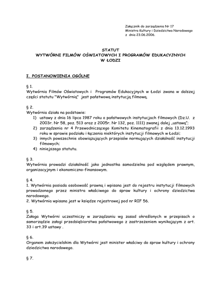 Załącznik do zarządzenia Nr 17 Ministra Kultury i Dziedzictwa Narodowego z dnia 23.06.2006. STATUT WYTWÓRNI FILMÓW OŚWIATOWYCH I PROGRAMÓW EDUKACYJNYCH W ŁODZI I. POSTANOWIENIA OGÓLNE § 1. Wytwórnia Filmów Oświatowych i Programów Edukacyjnych w Łodzi zwana w dalszej części statutu "Wytwórnią" jest państwową instytucją filmową. § 2. Wytwórnia działa na podstawie: 1) ustawy z dnia 16 lipca 1987 roku o państwowych instytucjach filmowych (Dz.U. z 2003r. Nr 58, poz. 513 oraz z 2005r. Nr 132, poz. 1111) zwanej dalej „ustawą”; 2) zarządzenia nr 4 Przewodniczącego Komitetu Kinematografii z dnia 13.12.1993 roku w sprawie podziału i łączenia niektórych instytucji filmowych w Łodzi; 3) innych powszechnie obowiązujących przepisów normujących działalność instytucji filmowych; 4) niniejszego statutu. § 3. Wytwórnia prowadzi działalność jako jednostka samodzielna pod względem prawnym, organizacyjnym i ekonomiczno-finansowym. § 4. 1. Wytwórnia posiada osobowość prawną i wpisana jest do rejestru instytucji filmowych prowadzonego przez ministra właściwego do spraw kultury i ochrony dziedzictwa narodowego. 2. Wytwórnia wpisana jest w księdze rejestrowej pod nr RIF 56. § 5. Załoga Wytwórni uczestniczy w zarządzaniu wg zasad określonych w przepisach o samorządzie załogi przedsiębiorstwa państwowego z zastrzeżeniem wynikającym z art. 33 i art.39 ustawy . § 6. Organem założycielskim dla Wytwórni jest minister właściwy do spraw kultury i ochrony dziedzictwa narodowego. § 7. Siedzibą Wytwórni jest miasto Łódź. § 8. Terenem działania Wytwórni jest terytorium Rzeczypospolitej Polskiej i zagranica. § 9. 1. Statut Wytwórni uchwala ogólne zebranie pracowników Wytwórni w trybie określonym w przepisach o przedsiębiorstwach państwowych. 2. Statut podlega zatwierdzeniu przez ministra właściwego do spraw kultury i ochrony dziedzictwa narodwego. 3. Zasady określone w ust. 1 i 2 stosuje się również do zmian statutu. 4. Zasady i tryb działania Wytwórni określa regulamin ustalony w trybie art. 21 ust. 8 ustawy. II. CELE I ZADANIA § 10. 1. Wytwórnia powołana jest do produkcji i opracowywania filmów. 2. Celem Wytwórni jest tworzenie, upowszechnianie i ochrona dóbr kultury, a w szczególności: 1) produkcja i obrót wszelkimi gatunkami filmowymi ze szczególnym uwzględnieniem filmu oświatowego i programów edukacyjnych; 2) upowszechnianie kultury filmowej; 3) ochrona, gromadzenie i pomnażanie zasobów sztuki filmowej; 4) badania naukowe i techniczne; 5) usługi i handel na potrzeby filmu. § 11. Przedmiotem działania Wytwórni jest: 1) produkcja wszelkich gatunków filmowych; 2) udostępnianie wszelkim podmiotom, na mocy stosownych porozumień i umów, filmów oświatowych i innych utworów audiowizualnych, wyprodukowanych przez Wytwórnię; 3) opracowanie wersji językowych filmów; 4) świadczenie usług filmowych; 5) prowadzenie działalności reklamowej, wydawniczej i informacyjnej, na potrzeby filmu; 6) pomoc w kształceniu kadr twórczych i pomocniczych w dziedzinie filmu oświatowego; 7) współpraca z władzami miasta Łodzi i Regionu, z Muzeum Kinematografii, Państwową Wyższą Szkołą Filmową Telewizyjną i Teatralną, innymi Instytucjami Filmowymi i firmami prywatnymi na rzecz rozwoju środowiska filmowego; 8) wszelka produkcja uboczna i inna działalność gospodarcza służąca realizacji zadań Wytwórni pod warunkiem przekazywania zysków z tej działalności na działalność w zakresie produkcji filmów; 9) inne zadania zlecone przez ministra właściwego do spraw kultury i ochrony dziedzictwa narodowego na warunkach określonych w art. 34 ustawy. III. ORGANY WYTWÓRNI § 12. Organami Wytwórni są: 1) dyrektor; 2) ogólne zebranie pracowników i rada pracownicza. § 13. Dyrektora Wytwórni powołuje i odwołuje minister właściwy do spraw kultury i ochrnony dziedzictwa narodowego na zasadach i w trybie przewidzianym w przepisach o przedsiębiorstwach państwowych, dotyczących powołania i odwołania dyrektora przedsiębiorstwa państwowego użyteczności publicznej. § 14. 1. Dyrektor zarządza Wytwórnią i reprezentuje ją na zewnątrz. 2. Dyrektor Wytwórni działając zgodnie z przepisami prawa podejmuje decyzje samodzielnie i ponosi za nie odpowiedzialność. 3. Dyrektor powołuje i odwołuje swoich zastępców za zgodą rady pracowniczej. IV. STRUKTURA ORGANIZACYJNA WYTWÓRNI § 15. Wytwórnią kieruje dyrektor. § 16. Dyrektor Wytwórni wykonuje swoje obowiązki przy pomocy: 1) zastępcy dyrektora d/s produkcji - szefa produkcji; 2) zastępcy dyrektora d/s ekonomicznych - gł. Księgowego; 3) pozostałych pracowników Wytwórni podległych bezpośrednio dyrektorowi. § 17. Organem opiniodawczo - doradczym dyrektora Wytwórni jest rada artystyczno programowa powoływana w trybie art. 38 ustawy. § 18. Zakres działania, podział czynności i odpowiedzialności osób pełniących funkcje kierownicze i samodzielne oraz szczegółową strukturę organizacyjną instytucji określa regulamin Wytwórni. V. DZIAŁALNOŚĆ WYTWÓRNI I ZASADY GOSPODAROWANIA MIENIEM § 19. Działalność Wytwórni regulowana jest: 1) niniejszym statutem; 2) regulaminem; 3) statutem samorządu załogi; 4) zarządzeniami dyrektora; 5) uchwałami organów samorządu załogi. § 20. Gospodarka finansowa Wytwórni jest prowadzona na zasadach określonych w ustawie oraz na podstawie innych obowiązujących przepisów. § 21. Wytwórnia prowadzi rzetelną rachunkowość oraz sporządza na jej podstawie roczne sprawozdanie finansowe, zgodnie z obowiązującymi w tym zakresie przepisami. § 22. 1. Dyrektor zapewnia terminowe sporządzenie rocznego sprawozdania finansowego, obligatoryjne jego zbadanie przez biegłego rewidenta i przedłożenie go ministrowi właściwemu do spraw kultury i ochrony dziedzictwa narodowego do zatwierdzenia. 2. Wyboru biegłego rewidenta dokonuje dyrektor. § 23. Wytwórnia wykonuje wszelkie pra